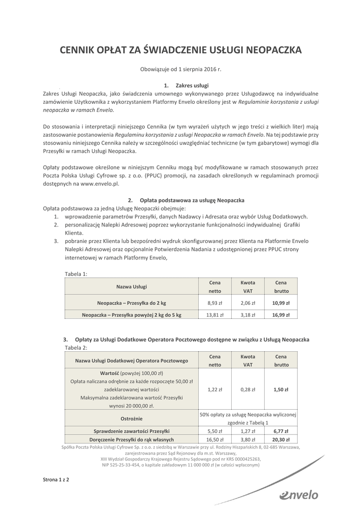 Cennik usługi neopaczka obowiązujący od 01.08.2016r.