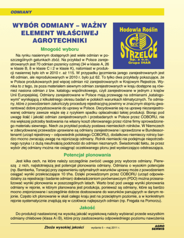 ODMIANY WYBÓR ODMIANY – WAŻNY ELEMENT WŁAŚCIWEJ AGROTECHNIKI Mnogość wyboru Na rynku nasiennym dostępnych jest wiele odmian w poszczególnych gatunkach zbóż. Na przykład w Polsce zarejestrowanych jest 70 odmian pszenicy ozimej (34 w klasie A, 26 w klasie B, 8 w klasie C i 2 w klasie K), natomiast w produkcji nasiennej było ich w 2010 r. aż 115. W przypadku jęczmienia jarego zarejestrowanych jest 48 odmian, ale reprodukowanych w 2010 r. było już 62. To tylko dwa przykłady pokazujące, że w Polsce produkowanych jest więcej odmian niż zarejestrowanych w Krajowym Rejestrze. Wynika to z tego, że poza materiałem siewnym odmian zarejestrowanych w kraju dostępne są również nasiona odmian z tzw. katalogu wspólnotowego, czyli zarejestrowane w jednym z krajów Unii Europejskiej. Odmiany zarejestrowane w Polsce mają przewagę na odmianami „katalogowymi” wynikającą z kilkuletniego okresu badań w polskich warunkach klimatycznych. Te odmiany, które z powodzeniem zakończyły procedurę rejestracyjną powinny w znacznym stopniu gwarantować dobre przystosowanie do uprawy w Polsce. Decydowanie się na uprawę niezarejestrowanej odmiany zawsze wiąże się z ryzykiem spadku opłacalności takiej produkcji. Biorąc pod uwagę ilość i jakość odmian zarejestrowanych i przebadanych w Polsce przez COBORU, nie ma większej potrzeby testowania na własny koszt oferowanego przez różne firmy sprowadzonego materiału siewnego. Niech za przykład posłuży postawa niemieckich rolników. W Niemczech w zdecydowanej przewadze uprawiane są odmiany zarejestrowane i sprawdzone w Bundessortenamt (urząd rejestrowy – odpowiednik polskiego COBORU), dodatkowo niemieccy rolnicy bardzo mocno zwracają uwagę na rejonizację odmiany. Rolnik niemiecki nie podejmuje niepotrzebnego ryzyka i z dużą nieufnością podchodzi do odmian nieznanych. Świadomość faktu, że przez wybór złej odmiany można nie osiągnąć oczekiwanego plonu jest wystarczająco odstraszająca. Potencjał plonowania Jest kilka cech, na które należy szczególnie zwrócić uwagę przy wyborze odmiany. Pierwszą z nich, najistotniejszą jest potencjał plonowania odmiany. Odmiana o wysokim potencjale (np. Bamberka, Tonacja) przy zapewnieniu optymalnych warunków uprawy może z powodzeniem osiągać wyniki przekraczające 10 t/ha. Dzięki prowadzonym przez COBORU (urząd odpowiedzialny za rejestrację i badanie odmian) doświadczeniom porównawczym (PDO) można przeanalizować wyniki plonowania w poszczególnych latach. Warto brać pod uwagę wyniki plonowania odmiany w rejonie, w którym planowana jest produkcja, ponieważ są odmiany, które są bardzo mocno zrejonizowane i szczególnie dobrze dostosowane do warunków panujących w danym rejonie. Często ich plonowanie w skali całego kraju jest na przeciętnym poziomie, a w konkretnym rejonie systematycznie znajdują się w czołówce najlepszych odmian (np. Fregata na Pomorzu). Jakość Do produkcji nastawionej na wysoką jakość wypiekową należy wybierać przede wszystkim odmiany chlebowe (klasa A i B), które przy zastosowaniu odpowiedniego poziomu nawożenia Zboża wysokiej jakości wydanie 5 – maj 2011 r. AGRO SERWIS ODMIANY azotowego (dodatkowa aplikacja w fazie kłoszenia) osiągną parametry spełniające oczekiwania przemysłu młynarsko-piekarniczego. Warto sięgnąć także po informacje pochodzące bezpośrednio od hodowców szukając odmian, które utrzymują wysokie parametry jakościowe (np. liczba opadania) także w latach o niekorzystnym przebiegu pogody (mokry rok i opady podczas żniw). Istnieje na rynku niewielka grupa odmian wysokojakościowych, których właściwości gwarantują wysokie parametry jakościowe nawet podczas mokrych żniw (m.in. Bamberka, Fregata). Warto również zwrócić uwagę na odmiany, które nawet przy bardziej ekstensywnej agrotechnice gwarantują uzyskanie parametrów skupowych. Ciekawą odmianą pod tym względem jest Zyta, która zyskała opinię odmiany zawsze osiągającej wysokie parametry. Związane jest to z jej specyficzną gospodarką azotem – potrafi uzyskać jakość bez konieczności stosowania trzeciej dawki (w fazie kłoszenia) nawozu azotowego (przy założeniu, że pierwsze dwie były na odpowiednio wysokim poziomie). Tego typu odmiany są szczególnie pożądane w latach, gdy osiągane są bardzo wysokie plony i zapotrzebowanie roślin przekracza zakładany poziom nawożenia azotowego. Produkcja na paszę W przypadku produkcji na paszę ważne jest, aby odmiana była przede wszystkim bardzo plenna. Warto zwrócić uwagę na poziom białka w ziarnie, ponieważ jego wysoka zawartość zwiększa wartość żywieniową paszy. Ilość białka reguluje się głównie poprzez nawożenie azotowe (na kłos), Niezwykle istotna jest odporność na choroby kłosa, ponieważ ziarno, którego używamy do skarmiania zwierząt musi być zdrowe. Porażenie grzybami z rodzaju Fusarium niesie za sobą zagrożenie kumulacji szkodliwych mikotoksyn w produktach pochodzenia zwierzęcego, które następnie my zjadamy. Dodatkowy aspekt to negatywny wpływ mikotoksyn na przyrosty masy ciała u zwierząt. W wielu przypadkach działają one niemal jak trucizna obecna w paszy. Dlatego przy produkcji ziarna paszowego równie istotna, jak w produkcji na cele piekarnicze, jest dobrze dobrana ochrona fungicydowa przeciwko chorobom kłosa, której skuteczność powinna być podparta naturalną odpornością odmiany. Odporność na choroby grzybowe Wysiewając konkretną odmianę warto poznać dokładnie jej odporność na najważniejsze choroby grzybowe. Najbardziej rozsądnym wyjściem wydaje się wybór odmian o odporności na jak największą ilość chorób. W praktyce bardzo trudno trafić na takie odmiany (bardzo dobrą odpornością charakteryzują się Sukces i Bamberka). Jednakże dobra znajomość słabości uprawianej odmiany może bardzo pomóc w odpowiednim planowaniu wydatków na ochronę fungicydową. Niech