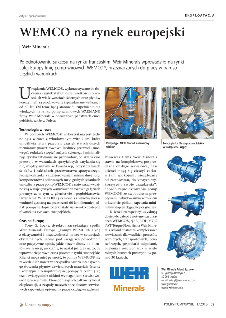 E K S P L OATAC J A Artykuł sponsorowany WEMCO na rynek europejski Weir Minerals Po odnotowaniu sukcesu na rynku francuskim, Weir Minerals wprowadziło na rynki całej Europy linię pomp wirowych WEMCO®, przeznaczonych do pracy w bardzo ciężkich warunkach. U rządzenia WEMCO®, wykorzystywane do tłoczenia cząstek stałych dużej wielkości i o wysokich właściwościach ściernych oraz płynów korozyjnych, są produkowane i sprzedawane we Francji od 60 lat. Od teraz będą stanowić uzupełnienie dla wiodących na rynku pomp szlamowych WARMAN® firmy Weir Minerals w pozostałych państwach europejskich, także w Polsce. Technologia wirowa W pompach WEMCO® wykorzystana jest technologia wirowa z wbudowanym wirnikiem, która umożliwia łatwy przepływ cząstek stałych dużych rozmiarów (nawet równych średnicy przewodu rurowego), redukuje stopień zużycia ściernego i minimalizuje ryzyko zatykania się przewodów, co skraca czas przestoju w warunkach sprzyjających zatykaniu się rur, między innymi w kanalizacji, oczyszczalniach ścieków i zakładach przetwórstwa spożywczego. Prosta konstrukcja z zastosowaniem minimalnej ilości komponentów i odlewanych rur o grubych ściankach umożliwia pracę pomp WEMCO® z najwyższą wydajnością w najcięższych warunkach w różnych gałęziach przemysłu, w tym w górnictwie i pogłębiarstwie. Urządzenia WEMCO® są cenione za wysoką niezawodność zyskaną na przestrzeni 60 lat. Niemniej jednak pompy te dopiero teraz stały się szeroko dostępne również na rynkach europejskich. Pompa typu AB80. Osadnik anaerobowy ścieków Ponieważ firma Weir Minerals stawia na kompleksową posprzedażną obsługę serwisową, nasi klienci mogą się cieszyć całkowitym spokojem, niezależnie od zastosowań, do których wykorzystują swoje urządzenia”. Sposób zaprojektowania pomp WEMCO® ze swobodnym przepływem i wbudowanym wirnikiem o kształcie półkuli zapewnia minimalny stopień degradacji cząsteczek. Klienci europejscy uzyskują dostęp do całego asortymentu urządzeń WEMCO®, tj.: A, F-DL, MC, S Czas na Europę Tony G. Locke, dyrektor zarządzający spółki i WP Torque Flow. Firma Weir MineWeir Minerals Europe: „Pompy WEMCO® słyną rals Poland dostarcza kompleksowe z elastyczności i niezawodności nawet w sytuacjach rozwiązania dla wszelkich procesów ekstremalnych. Biorąc pod uwagę ich powodzenie górniczych, transportowych, przeoraz pozytywne opinie, jakie otrzymaliśmy od klien- twórczych, gospodarki odpadami, tów we Francji, uważamy, że nastał już czas na to, by mielenia i rozdrabniania w wielu wprowadzić je również na pozostałe rynki europejskie. różnych branżach przemysłu w poKlienci mogą mieć pewność, że pompa WEMCO® nie nad 30 krajach. zawiedzie ich nawet w przypadku bardzo intensywnego tłoczenia płynów zawierających materiały ścierne i korozyjne. Co najistotniejsze, pompy te cechują się też niewiarygodnie niskimi wymaganiami serwisowo-konserwacyjnymi, które obniżają ich całkowity koszt eksploatacji, a zespoły naszych specjalistów serwisowych zapewniają optymalną pracę każdego urządzenia. Pompa piasku dla oczyszczalni ścieków w Budapeszcie, Węgry Weir Minerals Poland Sp. z o.o. ul. Ignacego Domeyki 2 30-066 Kraków e-mail: [email protected] www.global.weir www.e-weirminerals.pl POMPY POMPOWNIE 1/2016 59