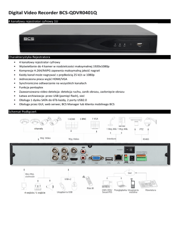 Digital Video Recorder BCS-QDVR0401Q 4 kanałowy rejestrator cyfrowy 1U Charakterystyka Rejestratora • • • • • • • • • • • 4 kanałowy rejestrator cyfrowy Wyświetlanie do 4 kamer w rozdzielczości maksymalnej 1920x1080p Kompresja H.264/MJPG zapewnia maksymalną jakość nagrań Każdy kanał może nagrywać z prędkością 25 kl/s w 1080p Jednoczesna praca wyjść HDMI/VGA Synchroniczne odtwarzanie na wszystkich kanałach Funkcja pentaplex Zaawansowana video detekcja: detekcja ruchu, zanik obrazu, zasłonięcie obrazu Łatwa archiwizacja: przez USB (pamięć flash), sieć Obsługa 1 dysku SATA do 6Tb każdy, 2 porty USB2.0 Obsługa przez GUI, web serwer, BCS Manager lub klienta mobilnego BCS Schemat Podłączeń Digital Video Recorder BCS-QDVR0401Q Specyfikacja techniczna rejestratora Model BCS-QDVR0401Q System Procesor Wbudowany wysoko wydajny procesor System operacyjny LINUX Funkcjonalność systemu Funkcja Pentaplex: Obraz na żywo, Nagrywanie, Odtwarzanie, Archiwizacja i Zdalny dostęp Kontrola systemu Panel dotykowy, Mysz, Pilot, Klawiatura, Sieć Wideo / Wyświetlanie Standard Wideo AHD/TVI/ANALOG/ IP Ilość wejść wideo 4 kanały, BNC(75Ω) Ilość wyjść wideo 1 kanał, BNC(75Ω) Wyjścia monitorowe 1 HDMI, 1 VGA Rozdzielczości wyświetlania Maksymalna HDMI 1920×1080 Podział na wyjściach 1/4 Sekwencja obrazu Tak Maski prywatności 4 definiowalne strefy prywatności na kanał OSD Nazwa kanału, Data i Czas, Zanik sygnału, Blokada kamery, Detekcja ruchu, Nagrywanie Audio Wejście 1 kanał,RCA (Line-in) Wyjście 1 kanał, RCA (Line-out) / HDMI Nagrywanie Kompresja Video/Audio H.264 / MJPEG/G.711 Rozdzielczość nagrywania Główny Strumień: 4 kan. 1080p@25kl/s Zajętość pasma 48~14336Kb/s Tryb nagrywania Manualny, Terminarz (Ciągłe; MD - Detekcja video, w tym : detekcja ruchu, alarm), Stop Interwał nagrań Opóźnienie wyzwalacza (0-120 sek), opóźnienie nagrywania (10-300 sek) Wideo detekcja i Alarm Wyzwalanie zdarzeń Wyjście alarmowe, Zapis polączeń, Zdjęcie, PTZ, Trasa, Pokaż wiadomość, Buzzer, Wyślij e-mail, FTP, Do chmury Detekcja ruchu Pola: 396 (18x22), Czułość: 6 poziomów Wejścia alarmowe Tak 4 Wyjścia alarmowe Tak 1 Odtwarzanie i Archiwizacja Odtwarzanie nagrań 1/4 Tryb wyszukiwania Czas/Data, Alarm, Detekcja Ruchu Funkcje odtwarzania Play, Pauza, Stop, Do Tyłu, Szybki play, Wolny play, Następny plik, Następna kamera, Poprzednia kamera, Pełny ekran, Powtórzenie, Pętla, Archiwizacja, Cyfrowe powiększenie Archiwizacja danych Pendrive / USB HDD / USB CD / Sieć Sieć Interfejs Port RJ-45 (10/100Mbps) Obsługiwane protokoły HTTP, TCP/IP, IPv4, UPNP, RTSP, UDP, SMTP, NTP, DHCP, DNS, IP Filter, PPPOE, DDNS, FTP, Alarm Serwer Zdalne sterowanie Monitor, PTZ , Odtwarzanie, Ustawienia, Ściąganie plików, Przeglądanie logów Dysk Dysk Twardy Port SATA, Max 6TB HDD Zarzadzanie dysku Monitorowanie dysku Dodatkowe interfejsy USB 2 porty, mysz lub USB RS485 PTZ Pozostałe Zasilanie DC 12V Pobór prądu 10W bez HDD / 25W z HDD Warunki srodowiskowe -10°C ~+55°C / 10~90%RH / 86~106kpa Wymiary 1U, 320mm×245mm×50mm(W×D×H) Waga 1.5kg bez HDD