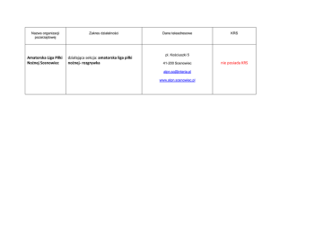 Nazwa organizacji pozarządowej Amatorska Liga Piłki Nożnej Sosnowiec Zakres działalności działająca sekcja: amatorska liga piłki nożnej- rozgrywka Dane teleadresowe KRS pl. Kościuszki 5 41-200 Sosnowiec [email protected] www.alpn.sosnowiec.pl nie posiada KRS