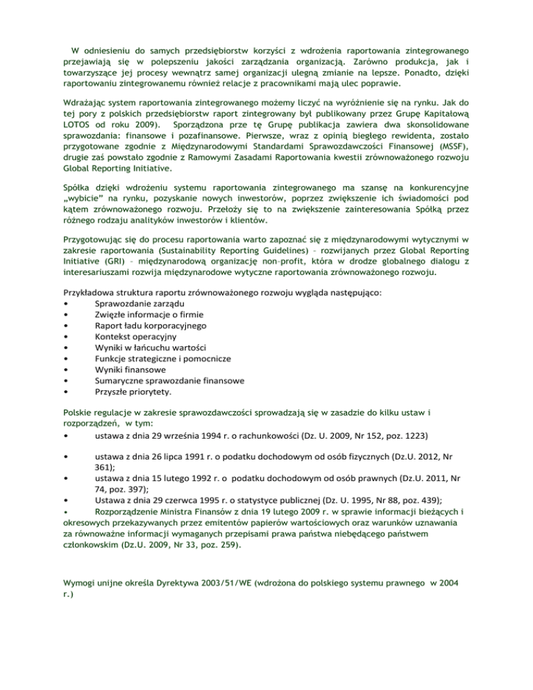 W odniesieniu do samych przedsiębiorstw korzyści z wdrożenia raportowania zintegrowanego przejawiają się w polepszeniu jakości zarządzania organizacją. Zarówno produkcja, jak i towarzyszące jej procesy wewnątrz samej organizacji ulegną zmianie na lepsze. Ponadto, dzięki raportowaniu zintegrowanemu również relacje z pracownikami mają ulec poprawie. Wdrażając system raportowania zintegrowanego możemy liczyć na wyróżnienie się na rynku. Jak do tej pory z polskich przedsiębiorstw raport zintegrowany był publikowany przez Grupę Kapitałową LOTOS od roku 2009). Sporządzona prze tę Grupę publikacja zawiera dwa skonsolidowane sprawozdania: finansowe i pozafinansowe. Pierwsze, wraz z opinią biegłego rewidenta, zostało przygotowane zgodnie z Międzynarodowymi Standardami Sprawozdawczości Finansowej (MSSF), drugie zaś powstało zgodnie z Ramowymi Zasadami Raportowania kwestii zrównoważonego rozwoju Global Reporting Initiative. Spółka dzięki wdrożeniu systemu raportowania zintegrowanego ma szansę na konkurencyjne „wybicie” na rynku, pozyskanie nowych inwestorów, poprzez zwiększenie ich świadomości pod kątem zrównoważonego rozwoju. Przełoży się to na zwiększenie zainteresowania Spółką przez różnego rodzaju analityków inwestorów i klientów. Przygotowując się do procesu raportowania warto zapoznać się z międzynarodowymi wytycznymi w zakresie raportowania (Sustainability Reporting Guidelines) – rozwijanych przez Global Reporting Initiative (GRI) – międzynarodową organizację non–profit, która w drodze globalnego dialogu z interesariuszami rozwija międzynarodowe wytyczne raportowania zrównoważonego rozwoju. Przykładowa struktura raportu zrównoważonego rozwoju wygląda następująco: • Sprawozdanie zarządu • Zwięzłe informacje o firmie • Raport ładu korporacyjnego • Kontekst operacyjny • Wyniki w łańcuchu wartości • Funkcje strategiczne i pomocnicze • Wyniki finansowe • Sumaryczne sprawozdanie finansowe • Przyszłe priorytety. Polskie regulacje w zakresie sprawozdawczości sprowadzają się w zasadzie do kilku ustaw i rozporządzeń, w tym: • ustawa z dnia 29 września 1994 r. o rachunkowości (Dz. U. 2009, Nr 152, poz. 1223) • ustawa z dnia 26 lipca 1991 r. o podatku dochodowym od osób fizycznych (Dz.U. 2012, Nr 361); ustawa z dnia 15 lutego 1992 r. o podatku dochodowym od osób prawnych (Dz.U. 2011, Nr 74, poz. 397); Ustawa z dnia 29 czerwca 1995 r. o statystyce publicznej (Dz. U. 1995, Nr 88, poz. 439); • • • Rozporządzenie Ministra Finansów z dnia 19 lutego 2009 r. w sprawie informacji bieżących i okresowych przekazywanych przez emitentów papierów wartościowych oraz warunków uznawania za równoważne informacji wymaganych przepisami prawa państwa niebędącego państwem członkowskim (Dz.U. 2009, Nr 33, poz. 259). Wymogi unijne określa Dyrektywa 2003/51/WE (wdrożona do polskiego systemu prawnego w 2004 r.)