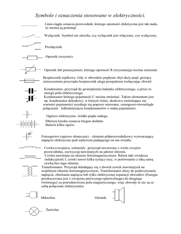 Symbole i oznaczenia stosowane w elektryczności. _________ Linia ciągła oznacza przewodnik, którego oporność elektryczna jest tak mała, że można ją pominąć. Wyłącznik. Symbol nie określa, czy wyłącznik jest włączony, czy wyłączony. Przełącznik. Opornik (rezystor). Opornik lub potencjometr, którego oporność R (rezystancję) można zmieniać. Bezpiecznik topikowy. Gdy w obwodzie popłynie zbyt duży prąd, grożący zniszczeniem przyrządu bezpiecznik ulega przepaleniu rozłączając obwód Kondensator, przyrząd do gromadzenia ładunku elektrycznego, a przez to energii pola elektrycznego. Kondensator którego pojemność C można zmieniać. Takim elementem jest np. kondensator dekadowy, w którym różne, skokowo zmieniające się wartości pojemności uzyskuje się poprzez mieszane, szeregowo-równoległe połączenie kilkudziesięciu kondensatorów o stałej pojemności. Ogniwo elektryczne- źródło prądu stałego. Dłuższa kreska oznacza biegun dodatni. Bateria kilku ogniw. Fotoogniwo (ogniwo słoneczne) – element półprzewodnikowy wytwarzający napięcie elektryczne pod wpływem padającego na nie światła. Cewka (zwojnica, solenoid) –przyrząd utworzony z wielu zwojów przewodnika, zazwyczaj nawiniętych na jakimś rdzeniu. Cewka nawinięta na rdzeniu ferromagnetycznym. Rdzeń taki zwiększa indukcyjność L cewki nawet kilka tysięcy razy, w porównaniu z taką samą cewką bez tego rdzenia. Transformator. Przyrząd składający się z dwóch cewek nawiniętych na wspólnym rdzeniu ferromagnetycznym. Transformator służy do podwyższania napięcia, obniżania napięcia lub tylko elektrycznej separacji obwodów (Energia przekazywana jest z zwojenia pierwszego (pierwotnego) do drugiego (wtórnego) za pośrednictwem pola magnetycznego, więc obwody te nie są ze sobą połączone elektrycznie). Mikrofon. Żarówka Głośnik Dioda półprzewodnikowa. Przewodzi prąd tylko w jednym kierunku- kiedy na anodzie (symbolizuje ją strzałka na rysunku) jest potencjał dodatni. Dioda elektroluminescencyjna (świecąca). Fotodioda- przewodzi prąd w jednym kierunku, ale tylko wtedy, gdy pada na nią światło. Tranzystor. Element składający się z trzech warstw półprzewodnika o różnym typie przewodnictwa: n-p-n (pierwszy symbol) lub p-n-p (drugi symbol). Najczęściej służy jako wzmacniacz lub przełącznik. Lampy elektronowe. Dziś stosowane stosunkowo rzadko, gdyż zastąpione zostały elementami półprzewodnikowymi. Zbudowane są z bańki szklanej, z wnętrza której odpompowano powietrze oraz elektrod metalowych. Rysunki przedstawiają odpowiednio diodę (dwie elektrody) i triodę. Neonówka. Zbudowana z bańki szklanej, z której odpompowano powietrze, a następnie wypełniono ją gazem szlachetnym (najczęściej neonem) pod obniżonym ciśnieniem. Gdy do elektrod przyłożymy odpowiednio wysokie napięcie (zazwyczaj kilkadziesiąt V), wskutek wyładowania lawinowego atomy gazu pobudzane są do świecenia. Uziemienie. Zazwyczaj podłączone do obudowy przyrządu. Służy do zabezpieczenia przed indukowanym na metalowej obudowie przyrządu napięciem. Amperomierz, woltomierz, omomierz przyrządy pomiarowe. Oscyloskop- przyrząd do badania zmiennych w czasie przebiegów (prądów) elektrycznych. Zasilacz prądu zmiennego, sinusoidalnego. Opisy na przyrządach: AC- (Alternated Current)- prąd zmienny DC- (Direct Current)- prąd stały POWER – Włącznik zasilania. MAINS - (w USA) - Włącznik zasilania sieciowego. GROUND – Uziemienie ON/OFF- włącz/wyłącz (włączony/wyłączony)