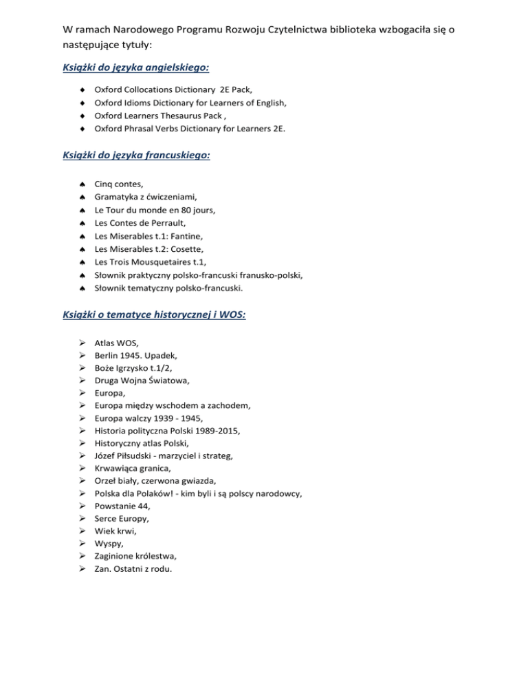 W ramach Narodowego Programu Rozwoju Czytelnictwa biblioteka wzbogaciła się o następujące tytuły: Książki do języka angielskiego: Oxford Collocations Dictionary 2E Pack, Oxford Idioms Dictionary for Learners of English, Oxford Learners Thesaurus Pack , Oxford Phrasal Verbs Dictionary for Learners 2E. Książki do języka francuskiego: Cinq contes, Gramatyka z ćwiczeniami, Le Tour du monde en 80 jours, Les Contes de Perrault, Les Miserables t.1: Fantine, Les Miserables t.2: Cosette, Les Trois Mousquetaires t.1, Słownik praktyczny polsko-francuski franusko-polski, Słownik tematyczny polsko-francuski. Książki o tematyce historycznej i WOS: Atlas WOS, Berlin 1945. Upadek, Boże Igrzysko t.1/2, Druga Wojna Światowa, Europa, Europa między wschodem a zachodem, Europa walczy 1939 - 1945, Historia polityczna Polski 1989-2015, Historyczny atlas Polski, Józef Piłsudski - marzyciel i strateg, Krwawiąca granica, Orzeł biały, czerwona gwiazda, Polska dla Polaków! - kim byli i są polscy narodowcy, Powstanie 44, Serce Europy, Wiek krwi, Wyspy, Zaginione królestwa, Zan. Ostatni z rodu. Książki o tematyce nauk ścisłych: ABC Geogebry, Biologia Campbella, Geografia regionalna Polski, Głód, Kamienie szlachetne i ozdobne, Krajobraz kulturowy, Lawiny. Poradnik dla narciarzy i turystów, Saga Puszczy Białowieskiej, Systemy Krajobrazowe, Sztuki piękne pod Tatrami, Woda. Książki pedagogiczno-psychologiczne: Co z tą szkołą? Cyfrowa demecja, Granica bólu, Humanizm ewolucyjny, Neuroedukacja, Pokonać OCD czyli zaburzenia obsesyjno-kompulsyjne, Portrety nie tylko sławnych osób, Poza dobrem i złem, Zrozumieć świat ucznia z zespołem Aspergera. Książki religijne: Biblia - Stary i Nowy Testament, Katechizm Kościoła Katolickiego. Lektury szkolne: Chłopi, Cudzoziemka, Dzieje Tristana i Izoldy, Kordian, Książę, Ludzie bezdomni, Makbet, Mitologia, Nie-Boska komedia, Pani Bovary, Proces, Przedwiośnie, Tango, Wesele, Wybór nowel, Zdążyć przed Panem Bogiem.