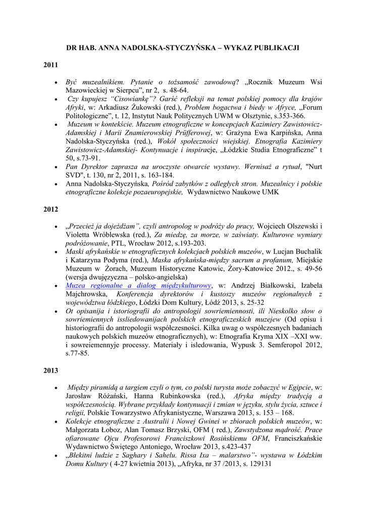 DR HAB. ANNA NADOLSKA-STYCZYŃSKA – WYKAZ PUBLIKACJI 2011 Być muzealnikiem. Pytanie o tożsamość zawodową? „Rocznik Muzeum Wsi Mazowieckiej w Sierpcu”, nr 2, s. 48-64. Czy kupujesz “Cisowiankę”? Garść refleksji na temat polskiej pomocy dla krajów Afryki, w: Arkadiusz Żukowski (red.), Problem bogactwa i biedy w Afryce, „Forum Politologiczne”, t. 12, Instytut Nauk Politycznych UWM w Olsztynie, s.353-366. Muzeum w kontekście. Muzeum etnograficzne w koncepcjach Kazimiery ZawistowiczAdamskiej i Marii Znamierowskiej Prüfferowej, w: Grażyna Ewa Karpińska, Anna Nadolska-Styczyńska (red.), Wokół społeczności wiejskiej. Etnografia Kazimiery Zawistowicz-Adamskiej- Kontynuacje i inspiracje, „Łódzkie Studia Etnograficzne” t 50, s.73-91. Pan Dyrektor zaprasza na uroczyste otwarcie wystawy. Wernisaż a rytuał, "Nurt SVD", t. 130, nr 2, 2011, s. 163-184. Anna Nadolska-Styczyńska, Pośród zabytków z odległych stron. Muzealnicy i polskie etnograficzne kolekcje pozaeuropejskie, Wydawnictwo Naukowe UMK 2012 „Przecież ja dojeżdżam”, czyli antropolog w podróży do pracy, Wojciech Olszewski i Violetta Wróblewska (red.), Za miedzę, za morze, w zaświaty. Kulturowe wymiary podróżowanie, PTL, Wrocław 2012, s.193-203. Maski afrykańskie w etnograficznych kolekcjach polskich muzeów, w Lucjan Buchalik i Katarzyna Podyma (red.), Maska afrykańska-między sacrum a profanum, Miejskie Muzeum w Żorach, Muzeum Historyczne Katowic, Żory-Katowice 2012., s. 49-56 (wersja dwujęzyczna – polsko-angielska) Muzea regionalne a dialog międzykulturowy, w: Andrzej Białkowski, Izabela Majchrowska, Konferencja dyrektorów i kustoszy muzeów regionalnych z województwa łódzkiego, Łódzki Dom Kultury, Łódź 2013, s. 25-32 Ot opisanija i istoriografii do antropologii sowriemiennosti, ili Nieskolko słow o sowriemiennych issliedowanijach polskich etnograficzeskich muzejew (Od opisu i historiografii do antropologii współczesności. Kilka uwag o współczesnych badaniach naukowych polskich muzeów etnograficznych), w: Etnografia Kryma XIX –XXI ww. i sowreiemennyje processy. Materiały i isledowania, Wypusk 3. Semferopol 2012, s.77-85. 2013 Między piramidą a targiem czyli o tym, co polski turysta może zobaczyć w Egipcie, w: Jarosław Różański, Hanna Rubinkowska (red.), Afryka między tradycją a współczesnością. Wybrane przykłady kontynuacji i zmian w języku, stylu życia, sztuce i religii, Polskie Towarzystwo Afrykanistyczne, Warszawa 2013, s. 153 – 168. Kolekcje etnograficzne z Australii i Nowej Gwinei w zbiorach polskich muzeów, w: Małgorzata Łoboz, Alan Tomasz Brzyski, OFM ( red.), Zawstydzona mądrość. Prace ofiarowane Ojcu Profesorowi Franciszkowi Rosińskiemu OFM, Franciszkańskie Wydawnictwo Świętego Antoniego, Wrocław 2013, s.423-437 „Błekitni ludzie z Saghary i Sahelu. Rissa Ixa – malarstwo”- wystawa w Łódzkim Domu Kultury ( 4-27 kwietnia 2013), „Afryka, nr 37 /2013, s. 129131 Spojrzeniem obcego. Kultura Indian dorzecza Ucayali w wybranych publikacjach autorstwa osadników „Kolonii Polskiej”, „Społeczeństwo i Polityka”, 2013, z 4 Inspiracje afrykańskie w modzie kobiecej w świetle wybranych polskich tekstów internetowych, „Społeczeństwo i Polityka”, 2013, z 3 Pozazawodowe zainteresowania i pasje Andrzeja Nadolskiego, „Acta Archaeologica Lodiensia” 2013, nr 59, s.87 -94, (współautorstwo Jerzego Nadolskiego) Opowieści o dalekich lądach. Rzecz o wybranych problemach wystawiennictwa dotyczącego kultur pozaeuropejskich, „Rocznik Muzeum Wsi Mazowieckiej w Sierpcu”, t. IV, 2013, s.19-31. Redakcje naukowe: Bronisława Kopczyńska-Jaworska, Krystyna Kujawińska-Courtney i Anna NadolskaStyczyńska, Wśród pustyń, buszu, lasów i ogrodów. Spotkania z kulturą Aborygenów i Papuasów, Uniwersytet Łódzki 2003. Anna Nadolska-Styczyńska, Zagrożenie tożsamości? Problematyka globalizacji w zainteresowaniach polskiej antropologii. Seria: Archiwum Etnograficzne PTL, t. 43, Polskie Towarzystwo Ludoznawcze, Uniwersytet Łódzki, Wrocław-Łódź 2005. Bronisława Kopczyńska-Jaworska, Anna Nadolska-Styczyńska, Aleksandra Twardowska – Na styku regionów. Dziedzictwo kultury ludowej województwa łódzkiego, Akademia Humanistyczna im. Aleksandra Gieysztora w Pułtusku, Polskie Towarzystwo Ludoznawcze, Pułtusk 2007. Nadolska-Styczyńska Kultury Afryki. W świecie tradycji, przemian i znaczeń, Toruńskie Studia o Sztuce Orientu, t. IV, 2009. Grażyna Ewa Karpińska, Anna Nadolska-Styczyńska , Wokół społeczności wiejskiej. Etnografia Kazimiery Zawistowicz-Adamskiej- Kontynuacje i inspiracje, „Łódzkie Studia Etnograficzne” t 50, 2011.