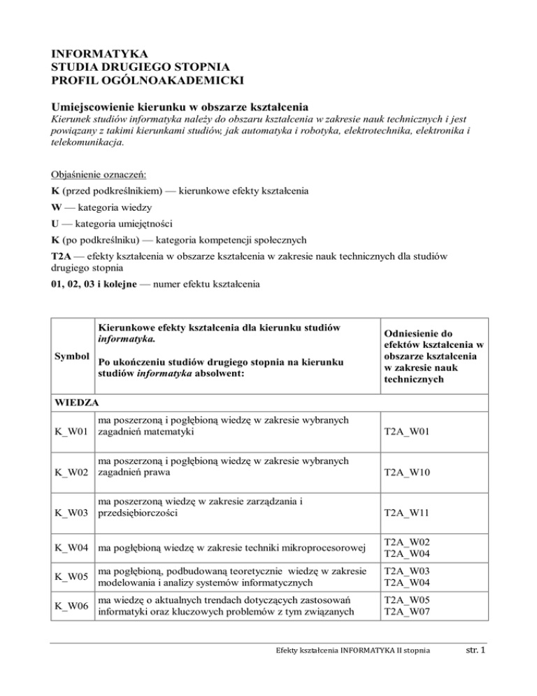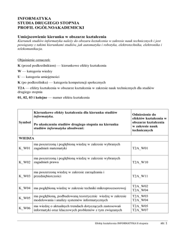 INFORMATYKA STUDIA DRUGIEGO STOPNIA PROFIL OGÓLNOAKADEMICKI Umiejscowienie kierunku w obszarze kształcenia Kierunek studiów informatyka należy do obszaru kształcenia w zakresie nauk technicznych i jest powiązany z takimi kierunkami studiów, jak automatyka i robotyka, elektrotechnika, elektronika i telekomunikacja. Objaśnienie oznaczeń: K (przed podkreślnikiem) — kierunkowe efekty kształcenia W — kategoria wiedzy U — kategoria umiejętności K (po podkreślniku) — kategoria kompetencji społecznych T2A — efekty kształcenia w obszarze kształcenia w zakresie nauk technicznych dla studiów drugiego stopnia 01, 02, 03 i kolejne — numer efektu kształcenia Kierunkowe efekty kształcenia dla kierunku studiów informatyka. Symbol Po ukończeniu studiów drugiego stopnia na kierunku studiów informatyka absolwent: Odniesienie do efektów kształcenia w obszarze kształcenia w zakresie nauk technicznych WIEDZA ma poszerzoną i pogłębioną wiedzę w zakresie wybranych K_W01 zagadnień matematyki T2A_W01 ma poszerzoną i pogłębioną wiedzę w zakresie wybranych K_W02 zagadnień prawa T2A_W10 ma poszerzoną wiedzę w zakresie zarządzania i K_W03 przedsiębiorczości T2A_W11 K_W04 ma pogłębioną wiedzę w zakresie techniki mikroprocesorowej T2A_W02 T2A_W04 K_W05 ma pogłębioną, podbudowaną teoretycznie wiedzę w zakresie modelowania i analizy systemów informatycznych T2A_W03 T2A_W04 K_W06 ma wiedzę o aktualnych trendach dotyczących zastosowań informatyki oraz kluczowych problemów z tym związanych T2A_W05 T2A_W07 Efekty kształcenia INFORMATYKA II stopnia str. 1 K_W07 ma pogłębioną, podbudowaną teoretycznie wiedzę w zakresie integracji i eksploracji danych T2A_W03 T2A_W04 K_W08 ma wiedzę w zakresie zaawansowanych technik i metod programowania T2A_W04 T2A_W07 K_W09 zna podstawowe problemy inżynierii wiedzy i metody ich rozwiązywania T2A_W04 T2A_W07 K_W10 ma pogłębioną wiedzę w zakresie bezpieczeństwa danych T2A_W04 T2A_W07 K_W11 ma pogłębioną wiedzę w zakresie kryptografii i kryptoanalizy T2A_W04 T2A_W07 ma podstawową wiedzę dotyczącą wybranych systemów K_W12 informatycznych charakteryzujących się specyficznymi cechami lub przeznaczeniem T2A_W04 T2A_W10 K_W13 ma wiedzę dotyczącą zarządzania projektami informatycznymi i pracą zespołową T2A_W07 K_W14 ma wiedzę o trendach rozwojowych i najistotniejszych nowych osiągnięciach w zakresie informatyki T2A_W05 UMIEJĘTNOŚCI K_U01 potrafi pozyskiwać informacje z literatury, baz danych i innych źródeł; potrafi integrować uzyskane informacje, dokonywać ich interpretacji i krytycznej oceny, a także wyciągać wnioski oraz formułować i wyczerpująco uzasadniać opinie T2A_U01 K_U02 potrafi określić wyznaczać zadania związane z procesem samokształcenia T2A_U05 K_U03 ma umiejętności językowe z zakresu nauk technicznych zgodne z wymaganiami określonymi dla poziomu B2+ Europejskiego Systemu Opisu Kształcenia Językowego T2A_U02 T2A_U06 K_U04 potrafi opracować szczegółową dokumentację z realizacji eksperymentu, zadania projektowego lub badawczego; potrafi przygotować opracowanie zawierające analizę uzyskanych wyników T2A_U03 K_U05 potrafi modelować i analizować systemy informatyczne T2A_U09 K_U06 potrafi formułować i testować hipotezy dotyczące problemów informatycznych T2A_U11 K_U07 potrafi - przy formułowaniu i rozwiązywaniu problemów informatycznych - integrować wiedzę z różnych dziedzin i dyscyplin naukowych T2A_U10 K_U08 potrafi - pracując w zespole - sformułować specyfikację fragmentów nietypowych lub złożonych systemów informatycznych T2A_U17 K_U09 potrafi - pracując w zespole - zaprojektować i zrealizować fragmenty nietypowych lub złożony systemów informatycznych T2A_U19 Efekty kształcenia INFORMATYKA II stopnia str. 2 K_U10 potrafi stosować zaawansowane narzędzia i technologie informatyczne T2A_U18 K_U11 potrafi ocenić przydatność narzędzi i technologii informatycznych w realizacji konkretnego zadania informatycznego T2A_U12 K_U12 potrafi zaproponować i uzasadnić ulepszenia istniejących rozwiązań informatycznych T2A_U16 KOMPETENCJE SPOŁECZNE K_K01 potrafi myśleć i działać w sposób kreatywny i przedsiębiorczy T2A_K06 K_K02 rozumie potrzebę przekazywania społeczeństwu informacji dotyczących osiągnięć informatyki i innych aspektów działalności inżyniera-informatyka; podejmuje starania, aby przekazać informacje w sposób zrozumiały, przedstawiając różne punkty widzenia T2A_K07 Efekty kształcenia INFORMATYKA II stopnia str. 3