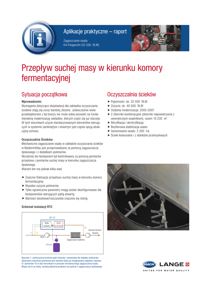 Aplikacje praktyczne – raport Zagęszczanie osadu KA Freigericht (32 500 RLM) Przepływ suchej masy w kierunku komory fermentacyjnej Sytuacja początkowa Oczyszczalnia ścieków Wprowadzenie: Wymagania dotyczące eksploatacji dla zakładów oczyszczania ścieków stają się coraz bardziej złożone. Jednocześnie wiele przedsiębiorstw z tej branży nie może sobie pozwolić na fundamentalną modernizację zakładów, których część się już starzeje. W tych warunkach użycie standaryzowanych elementów sterujących w systemie zamkniętym i otwartym jest często opcją atrakcyjną cenowo. ¢ Pojemność: ok. 32 500 RLM ¢ Zużycie: ok. 40 000 RLM ¢ Ostatnia modernizacja: 2005-2007 ¢ 2 zbiorniki kombinacyjne (zbiorniki napowietrzania z wewnętrznym osadnikiem), razem 10 230 m3 ¢ Nitryfikacja i denitryfikacja ¢ Beztlenowa stabilizacja osadu ¢ Generowanie osadu: 2 200 t/a ¢ Ścieki komunalne i z obiektów przemysłowych Oczyszczalnia Ścieków: Mechaniczne zagęszczanie osadu w zakładzie oczyszczania ścieków w Niedermittlau jest przeprowadzane za pomocą zagęszczacza dyskowego i z dodatkiem polimerów. Wcześniej ten komponent był kontrolowany za pomocą pomiarów przepływu i pomiarów suchej masy w kierunku zagęszczacza dyskowego. Wariant ten ma jednak kilka wad: ¢ Znaczne fluktuacje przepływu suchej masy w kierunku komory fermentacyjnej ¢ Wysokie zużycie polimerów ¢ Tylko ograniczone parametry mogą zostać skonfigurowane dla komponentów sterujących pętlą otwartą ¢ Wartości docelowe/rzeczywiste znacznie się różnią Schemat instalacji RTC RTC-ST Pętla otwarta Q Pętla zamknięta TS TS Komora fermentacyjna Stale Zagęszczacz dyskowy Polimer Rysunek 1: Jednoczesna kontrola pętli otwartej i zamkniętej dla dodatku polimerów. Optymalne mierzenie polimerów jest możliwe tylko po zintegrowaniu objętości ładunku Q i pomiarów TS w obu kierunkach w procesie mechanicznego zagęszczania osadu. Wiąże się to ze stałą, wysoką jakością produktu na wylocie z zagęszczacza dyskowego. Korzyści Standardowe zautomatyzowanie z HACH LANGE dla „mechanicznego zagęszczania osadu” pozwala osiągnąć wyniki obejmujące bardziej stabilne stężenie TS na wpływie do reaktora beztlenowego. Wraz z zależnym od ładunku dodatkiem polimerów połączenie kontroli pętli otwartej i zamkniętej zapewnia większą stabilność procesu i bardziej równomierny przepływ do komory fermentacyjnej. ¢ Stabilniejsze stężenie TS na wpływie do reaktora beztlenowego ¢ Dokładna zawartość TS podczas zagęszczania ¢ Niedrogie rozwiązanie bez fundamentalnych zmian w systemie ¢ Intuicyjna, oparta na menu eksploatacja systemu Dane pomiarowe Stała, wysoka jakość produktu po zagęszczaniu za pomocą dodatku polimerów zależnych od ładunku TS Faktor g/L g/L Czynnik kontrolny L/h Wartość docelowa Osad gęsty TS Polimer [:10] ¢ Instalacja dwóch sond SOLITAX highline sc na wpływie i opróżnianie suchej masy z zagęszczacza dyskowego (instalacja rury) ¢ Pomiar polimerów zależnych od ładunku przez system RTC -ST ¢ Jednoczesna kontrola pętli otwartej i zamkniętej dla dodatku polimerów Osad rzadki TS Rysunek 2: Dodatek polimerów oparty na ładunku w praktyce. Dzięki stałej objętości ładunku zawartość TS w zagęszczaczu (jasnobrązowy) określa dodatek polimerów (purpurowy). Sukces tej strategii to znacznie bardziej spójne pomiary TS po procesie zagęszczania (ciemnobrązowy). Interwencje ze strony zamkniętej pętli w kierunku downstream są przedstawione przez zmienny czynnik kontroli (czerwony). Autor: Frank Fischer Zakład oczyszczalni ścieków Niedermittlau (ARA II) Abwasserverband Freigericht DOC43. 60 .30212.May14 Rozwiązanie