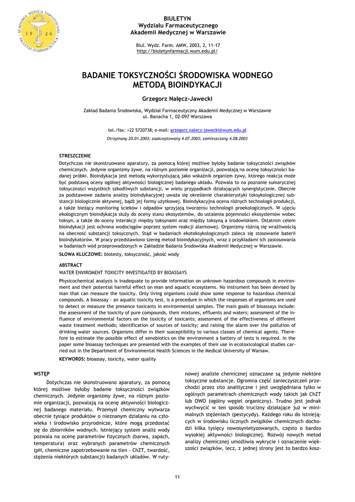 BIULETYN Wydziału Farmaceutycznego Akademii Medycznej w Warszawie Biul. Wydz. Farm. AMW, 2003, 2, 11-17 http://biuletynfarmacji.wum.edu.pl/ BADANIE TOKSYCZNOŚCI ŚRODOWISKA WODNEGO METODĄ BIOINDYKACJI Grzegorz Nałęcz-Jawecki Zakład Badania Środowiska, Wydział Farmaceutyczny Akademii Medycznej w Warszawie ul. Banacha 1, 02-097 Warszawa tel./fax: +22 5720738; e-mail: [email protected] Otrzymany 20.01.2003; zaakceptowany 4.07.2003; zamieszczony 4.08.2003 STRESZCZENIE Dotychczas nie skonstruowano aparatury, za pomocą której możliwe byłoby badanie toksyczności związków chemicznych. Jedynie organizmy żywe, na różnym poziomie organizacji, pozwalają na ocenę toksyczności badanej próbki. Bioindykacja jest metodą wykorzystującą jako wskaźnik organizm żywy, którego reakcja może być podstawą oceny ogólnej aktywności biologicznej badanego układu. Pozwala to na poznanie sumarycznej toksyczności wszystkich szkodliwych substancji, w wielu przypadkach działających synergistycznie. Obecnie za podstawowe zadania analizy bioindykacyjnej uważa się określenie charakterystyki toksykologicznej substancji biologicznie aktywnej, bądź jej formy użytkowej. Bioindykacyjna ocena różnych technologii produkcji, a także bieżący monitoring ścieków i odpadów sprzyjają tworzeniu technologii proekologicznych. W ujęciu ekologicznym bioindykacja służy do oceny stanu ekosystemów, do ustalenia pojemności ekosystemów wobec toksyn, a także do oceny interakcji między toksynami oraz między toksyną a środowiskiem. Ostatnim celem bioindykacji jest ochrona wodociągów poprzez system reakcji alarmowej. Organizmy różnią się wrażliwością na obecność substancji toksycznych. Stąd w badaniach ekotoksykologicznych zaleca się stosowanie baterii bioindykatorów. W pracy przedstawiono szereg metod bioindykacyjnych, wraz z przykładami ich zastosowania w badaniach wód przeprowadzonych w Zakładzie Badania Środowiska Akademii Medycznej w Warszawie. SŁOWA KLUCZOWE: biotesty, toksyczność, jakość wody ABSTRACT WATER ENVIROMENT TOXICITY INVESTIGATED BY BIOASSAYS Physicochemical analysis is inadequate to provide information on unknown hazardous compounds in environment and their potential harmful effect on man and aquatic ecosystems. No instrument has been devised by man that can measure the toxicity. Only living organisms could show some response to hazardous chemical compounds. A bioassay - an aquatic toxicity test, is a procedure in which the responses of organisms are used to detect or measure the presence toxicants in environmental samples. The main goals of bioassays include: the assessment of the toxicity of pure compounds, their mixtures, effluents and waters; assessment of the influence of environmental factors on the toxicity of toxicants; assessment of the effectiveness of different waste treatment methods; identification of sources of toxicity; and raising the alarm over the pollution of drinking water sources. Organisms differ in their susceptibility to various classes of chemical agents. Therefore to estimate the possible effect of xenobiotics on the environment a battery of tests is required. In the paper some bioassay techniques are presented with the examples of their use in ecotoxicological studies carried out in the Department of Environmental Health Sciences in the Medical University of Warsaw. KEYWORDS: bioassay, toxicity, water quality WSTĘP nowej analizie chemicznej oznaczane są jedynie niektóre toksyczne substancje. Ogromna część zanieczyszczeń przechodzi przez sito analityczne i jest uwzględniana tylko w ogólnych parametrach chemicznych wody takich jak ChZT lub OWO (ogólny węgiel organiczny). Trudno jest jednak wychwycić w ten sposób trucizny działające już w minimalnych stężeniach (pestycydy). Każdego roku do istniejących w środowisku licznych związków chemicznych dochodzi kilka tysięcy nowosyntetyzowanych, często o bardzo wysokiej aktywności biologicznej. Rozwój nowych metod analizy chemicznej umożliwia wykrycie i oznaczenie większości związków, lecz, z jednej strony jest to bardzo kosz- Dotychczas nie skonstruowano aparatury, za pomocą której możliwe byłoby badanie toksyczności związków chemicznych. Jedynie organizmy żywe, na różnym poziomie organizacji, pozwalają na ocenę aktywności biologicznej badanego materiału. Przemysł chemiczny wytwarza obecnie tysiące produktów o nieznanym działaniu na człowieka i środowisko przyrodnicze, które mogą przedostać się do zbiorników wodnych. Istniejący system analiz wody pozwala na ocenę parametrów fizycznych (barwa, zapach, temperatura) oraz wybranych parametrów chemicznych (pH, chemiczne zapotrzebowanie na tlen - ChZT, twardość, stężenia niektórych substancji) badanych układów. W ruty- 11 G. Nałęcz-Jawecki /Biul. Wydz. Farm. AMW, 2003, 2, 11-17 towne, z drugiej - nie daje odpowiedzi na dwa podstawowe pytania: - jak dana próbka może działać na organizmy żywe bytujące w środowisku? - jak może wpłynąć bezpośrednio i pośrednio na organizm człowieka? prawodawstwo międzynarodowe i krajowe (także w Polsce). Coroczne sympozja sprzyjają poszerzaniu wykazów organizmów testowych. Lata 80-te i 90-te to okres powstawania prac przeglądowych, a także postępującej internacjonalizacji metod badawczych. Pojawiają się próby wyjaśnienia mechanizmów działania toksyn, zależności działania od struktury związku, a także interakcji między toksynami. Z okresu badań opisowych bioindykacja wkracza w okres opracowań statystycznych, prób modelowania ekosystemów, przewidywania działania nowych związków na podstawie istniejących wyników. Definicja bioindykacji Bioindykacja jest metodą wykorzystującą jako wskaźnik organizm żywy, którego reakcja może być podstawą oceny ogólnej aktywności biologicznej badanego układu. Pozwala to na poznanie sumarycznej toksyczności wszystkich szkodliwych substancji, w wielu przypad