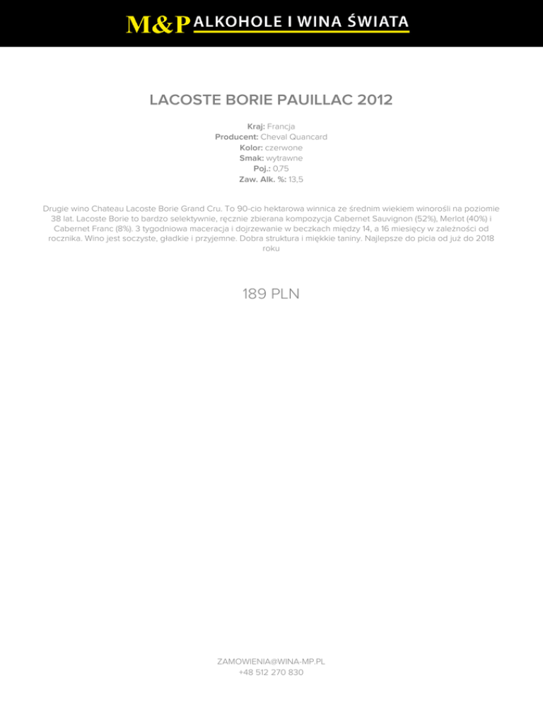 LACOSTE BORIE PAUILLAC 2012 189 PLN