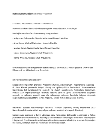DOBRE WIADOMOŚCI NA KONIEC TYGODNIA STUDENCI AKADEMII SZTUKI ZE STYPENDIAMI Studenci Akademii Sztuki wśród stypendystów Miasta Szczecin. Gratulacje! Poniżej lista studentów uhonorowanych stypendiami: -‐ Małgorzata Goliszewska, Wydział Malarstwa i Nowych Mediów -‐ Artur Rozen, Wydział Malarstwa i Nowych Mediów -‐ Mariusz Samól, Wydział Malarstwa i Nowych Mediów -‐ Łukasz Szpatowicz, Wydział Sztuk Wizualnych -‐ Hanna Wysocka, Wydział Sztuk Wizualnych Uroczystość wręczenia stypendiów odbędzie się 13 czerwca 2013 roku o godzinie 17.00 w Sali Filharmonii im. M.Karłowicza w Szczecinie. DR PIOTR KLIMEK NAGRODZONY Szczeciński kompozytor, prorektor Akademii Sztuki ds. artystycznych i współpracy z zagranicą – dr Piotr Klimek ponownie święci triumfy na ogólnopolskich festiwalach. Przedstawienie Najmniejszy bal świata,zdobyło nagrody na dwóch niezależnych festiwalach teatralnych. Podczas XXVI Ogólnopolskiego Festiwalu Teatrów Lalek w Opolu przedstawienie otrzymało nagrody za najlepszy spektakl oraz dla najlepszego reżysera. Dominika Miękus otrzymała nagrodę dla najlepszej aktorki za rolę Migawki, a Piotr Klimek za najlepszą muzykę. Natomiast podczas rzeszowskiego Festiwalu Teatrów Ożywionej Formy Maskarada 2013 Najmniejszy bal świata zdobył nagrodę za najlepszy spektakl w kategorii dziecięcej. Mający swoją premierę w lutym ubiegłego roku Najmniejszy bal świata to pierwsze w Polsce przedstawienie multimedialne, które łączy techniki teatru lalkowego z technikami telewizyjnymi i filmowymi. Przedstawienie zostało pomyślane jako program telewizyjny o nazwie Najmniejszy Bal Świata, w którym toczy się rozmowa o trudnych dzieciach. Muzyki do przedstawienia Najmniejszy Bal Świata można posłuchać na witrynie Sound Cloud: https://soundcloud.com/tags/najmniejszy%20bal%20świata WYSTAWA PROF. KAMILA KUSKOWSKIEGO W BUDAPESZCIE Wystawa NEUE DADA jest próbą rozwinięcia idei dadaizmu w odniesieniu zarówno do niej samej, jak i wykorzystania potencjału eksploracji jaki za sobą ona niesie. Prezentowane na wystawie prace odwołują się bezpośrednio do prac dwójki artystów Marcela Duchampa i Rene Margritta. Tytułowe Neue Dada jest więc recyclingiem ideowym zawartym w pracach artystów, których twórczość stanowi w dużym uogólnieniu fundament sztuki współczesnej. Nadawanie przedmiotom za pomocą gestu artystycznego na zasadzie pewnej przewrotności nowego znaczenia jest jednym z najbardziej istotnych elementów definiujących sztukę nowoczesną. Wystawę można oglądać do 23 sierpnia 2013 roku w Platán Galéria, Andrássy út 32. FINAŁ KURSU MALARSTWA Kurs Malarstwa i Rysunku organizowany przez Wydział Malarstwa i Nowych Mediów Akademii Sztuki w Szczecinie dobiega końca. Po ostatnich zajęciach odbędzie się prezentacja – robocza wystawa prac uczestników kursu. W środę, 29 maja 2013 roku, o godzinie 17.00 w Pałacu pod Globusem odbędzie się uroczyste wręczenie świadectw UKOŃCZENIA KURSU przez pana prorektora ds. nauki – prof. Zbigniewa Romańczuka oraz otwarcie ekspozycji prac uczestników kursu. MARTA KOSTECKA – SŁOWIANKA W WIELKIM MIEŚCIE Marta Kostecka z Mediateki AS wzięła udział w sympozjum Ludzie książki Pomorza Zachodniego organizowanym w ramach Tygodnia Bibliotek przez Stowarzyszenie Bibliotekarzy Polskich, które odbyło się 15 maja 2013 roku w Książnicy Pomorskiej. Wystąpiła z referatem Słowianin w wielkim mieście. Sylwetka Igora Górewicza, właściciela wydawnictwa Triglav. Wszystkie materiały zaprezentowane na sympozjum będą opublikowane przez wydawnictwo Książnicy Pomorskiej. Sympozjum jest zaplanowane jako wydarzenie cykliczne, dzięki temu da możliwość współtworzenia ważnego cyklu publikacji na temat szczecińskich bibliotekarzy, wydawców, księgarzy, drukarzy, bibliofilów, które staną się skarbnicą wiedzy chroniącą od zapomnienia dokonania ludzi książki z naszego regionu. MEDIATEKA NA KONGRESIE BIBLIOTEK Marta Kostecka z Mediateki AS została zaproszona przez Fundację Rozwoju Społeczeństwa Informacyjnego do współpracy przy organizacji tegorocznego kongresu bibliotek. Jest to jedno z najważniejszych wydarzeń w środowisku bibliotekarskim w Polsce. Kongres bibliotek publicznych to doroczne wydarzenie, organizowane przez Fundację Rozwoju Społeczeństwa Informacyjnego, prowadzącą Program Rozwoju Bibliotek. Przez dwa dni blisko 400 bibliotekarek i bibliotekarzy z całej Polski bierze udział w praktycznych zajęciach, zapoznaje się z dobrymi praktykami, wymienia doświadczenia. Spotkanie służy też integracji i wzajemnej inspiracji. W tym roku odbędzie się w dniach 21-‐22 października w Centrum Nauki Kopernik w Warszawie i będzie przebiegać pod hasłem Biblioteka pełna ludzi. Marta Kostecka będzie współautorką programu bloku tematycznego Jak poszerzyć/zwiększyć zasoby biblioteki i będzie sprawowała nad nim opiekę w trakcie trwania kongresu. NAGA AKADEMIA Tekst krytyczno-‐analityczny dr Aleksandry Łukaszewicz Alcaraz (kierowniczki Zakładu Historii i Teorii Sztuki na WMiNM oraz dyrektorki Mediateki) prezentujący prace Łukasza Skąpskiego, Anny Orlikowskiej i Agaty Michowskiej, pt. Konteksty znaczeń przeszłości został umieszczony na stronie internetowej projektu: www.thenaked.nl Pełną treść odnajdą Państwo także w Aktualnościach na stronie internetowej Akademii Sztuki w Szczecinie:http://www.akademiasztuki.eu/pl/uczelnia/wydzia%C5%82y/wydzia%C5%82-‐ malarstwa-‐i-‐nowych-‐medi%C3%B3w/aktualnosci/2013/05/23/akademia-‐sztuki-‐w-‐projekcie-‐the-‐ naked ZAKOŃCZENIE PROJEKTU NIE WYRASTAJ Z MARZEŃ Realizacja projektu artystycznego Nie wyrastaj z marzeń, podczas której współpracowały Mediateka Akademii Sztuki w Szczecinie i Szkoła Podstawowa nr 7 w Szczecinie, dobiegła końca. 20 maja odbyło się wręczenie dyplomów i nagród laureatom I Międzyszkolnego Konkursu Plastycznego oraz uroczyst