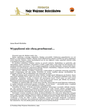 Anna Rosel-Kicińska Wypędzeni nie chcą przebaczać... Wrzesień 1939 rok. Miałam wtedy 7 lat... Byłam najstarszą z czworga rodzeństwa. Rodzice prowadzili 7-hektarowe gospodarstwo we wsi Branica w województwie łódzkim. Właśnie przed kilkunastoma dniami urodziła się nasza najmłodsza siostra Marynia. Rodzice, mimo dochodzących już do nas odgłosów wojny, pojechali ochrzcić córkę w parafialnym kościele w Strpńsku. Ze strachem czekaliśmy z bratem i siostrą na powrót rodziców. Siedzieliśmy na podwórku, gdy usłyszeliśmy warkot samolotów. Patrzyliśmy w niebo i nagle jeden z nich zniżył się nad domami wsi, zaterkotał karabin maszynowy. Co sił w nogach pognaliśmy w zarośla kukurydzy, rosnącej koło domu. Leżeliśmy na szeleszczących, nagrzanych słońcem liściach i słuchaliśmy z bijącymi sercami strzałów, a później skowytu naszej ukochanej suczki Rezedki. Gdy samoloty odleciały, wyszliśmy z kukurydzy i zobaczyliśmy na podwórku martwego szczeniaka Kajtka i rozpaczającą nad nim suczkę. Przytuleni do suczki, wspólnie płacząc, doczekaliśmy się przyjazdu rodziców. Dla nas kilkulatków tak rozpoczęła się wojna. Kilka dni później ojciec postanowił zabrać rodzinę i uciekać przed zbliżającym się frontem. Nasza wieś leżała niedaleko Warty, gdzie już toczyły się zacięte walki. Nie pamiętam dokładnie trasy, którą uciekaliśmy. Jechaliśmy wozem, za którym szły przywiązane krowy. Przed nami i za nami sznury podobnych uciekinierów. Jechaliśmy wolno, często kryjąc się pod wozem, gdy zbliżały się samoloty. Towarzyszyły nam nieustannie odgłosy walk, w nocy łuny pożarów. Niedługo, bo zaledwie kilka dni, trwała nasza ucieczka. Zatrzymała nas przed Zgierzem wiadomość, że wojska radzieckie przekroczyły granicę wschodnią. „To już koniec” – powiedział ojciec i rozpłakał się. Pierwszy i jedyny raz w życiu widziałam go wtedy płaczącego. Wróciliśmy do domu. W drodze powrotnej spotkaliśmy maszerujące zwycięskie oddziały niemieckie. Szli zwartymi kolumnami, w hełmach nasuniętych na czoła, twardo i głośno wybijając krok. W moich dziecięcych oczach wydali mi się złowrodzy i groźni, mimo rzucanych nam cukierków. Mama zabroniła je podnosić. Dotarliśmy do domu. Rodzice zrozpaczeni, my – dzieci chore na biegunkę. Pod koniec września wróciłam do szkoły, do której chodziłam od 6 roku życia. Byłam już w drugiej klasie. Lubiłam swoją malutką 4-klasową szkołę i kochałam naszą nauczycielką panią Marię Wróblową, szczuplutką, malutką, o brzydkiej twarzy i ślicznych, falistych jasnych włosach. Była dla nas tak dobra i serdeczna. Uczyła nie tylko w szkole, odwiedzała w domu, przynosiła książeczki i czasopisma, przyjaźniła się z rodzicami. Jej zawdzięczam miłość do książek, które szybko zaczęłam czytać i opowiadać rodzeństwu. Ten rok szkolny późno się zaczął i jeszcze szybciej skończył. © Fundacja Moje Wojenne Dzieciństwo, 1999 Anna Rosel-Kicińska, Wypędzeni nie chcą przebaczać… 2 W połowie października, gdy siedzieliśmy w klasie, czekając na rozpoczęcie lekcji, otworzyły się drzwi i weszła nasza pani z grubym Niemcem w mundurze. Była bardzo blada, ślady po ospie wyraźnie wystąpiły na jej szczupłą twarz i tylko śliczne, świetliste włosy wydawały się jeszcze jaśniejsze. Cichym głosem tłumaczyła nam ostre, gardłowe słowa Niemca: „Szkoła ma być zamknięta. Mamy wrócić do domu i czekać na dalsze rozporządzenia”. A pani? – zapytało któreś z nas? „Ja muszę wyjechać jeszcze dziś” – odpowiedziała nauczycielka. Jesień 1939 roku to smutne, pełne lęku dni. Co będzie dalej? Co nas jeszcze czeka? Ojciec, jak nigdy, często wychodził do sąsiadów. Mama czekała niespokojna. Wracał z ponurą miną. Szeptali później długo w kuchni, gdy my już leżeliśmy w łóżkach. Te szepty nie pozwoliły mi usnąć. Coraz częściej wychwytywałam z ich rozmów jedno słowo „wysiedlenie”... Nie wiedziałam, co to znaczy. Moje rodzeństwo, zbyt małe, aby cokolwiek zrozumieć, zajęte było swoimi zabawami. Ojciec próbował mnie uczyć, ale brakowało mu czasu, więc uczyłam się sama z książeczek, które zachowałam. Gdy przeczytałam je wszystkie, zabrałam się do biuletynów z Kasy Stefczyka, co tatę bardzo śmieszyło. Coraz bardziej narastał niepokój w naszym domu. Niemcy wpadali niespodziewanie do wsi, oglądali domy i zabudowania gospodarcze, przeprowadzali spisy inwentarza, badali wielkość gospodarstw, krzyczeli na wszystkich. Ojciec schował część ziarna w sąsieku pod słomą. Mama piekła chleb i suszyła suchary, smażyła smalec. Podpatrzyłam, że zamiast guzików, przyszywała do naszych dziecięcych palt 10-złotówki, obszyte tym samym materiałem. W pokoju stały starannie powiązane pakunki. Wreszcie odważyłam się zapytać mamę po co to wszystko? „To na wypadek wysiedlenia”. Co to jest wysiedlenie – zapytałam. „Po prostu Niemcy wyrzucą nas z domu i wywiozą”. Dokąd? „Nie wiemy”. Kto będzie mieszkał w naszym domu? „Niemiec”. Ale to nasz dom! „Tak, ale oni nas napadli i zwyciężyli”. Odtąd już nie mogłam spokojnie spać. Lęk udzielił się nawet bratu i siostrze. Tylko najmłodsza Marynia spokojnie ssała pierś mamy. Pierwsze wojenne Boże Narodzenie mimo braku nafty, opału i wielu innych ograniczeń było dla nas dzieci szczęśliwe. Rodzice jak zawsze ubrali choinkę, przygotowali skromniutkie upominki, a mama sobie tylko znanymi sposobami zdobyła, co potrzeba, i urządziła nam Wigilię i Święta. Przyjechali nasi krewni z Sieradza. Półgłosem toczyły się pełne grozy opowieści o życiu pod okupacją, o śmierci znajomych, aresztowaniach, wywózkach, różnorodnych zakazach i ograniczeniach żywnościowych. Mało z tego jeszcze rozumiałam, ale bałam się coraz bardziej. Schudłam i nie mogłam spać, a zawsze byłam sz