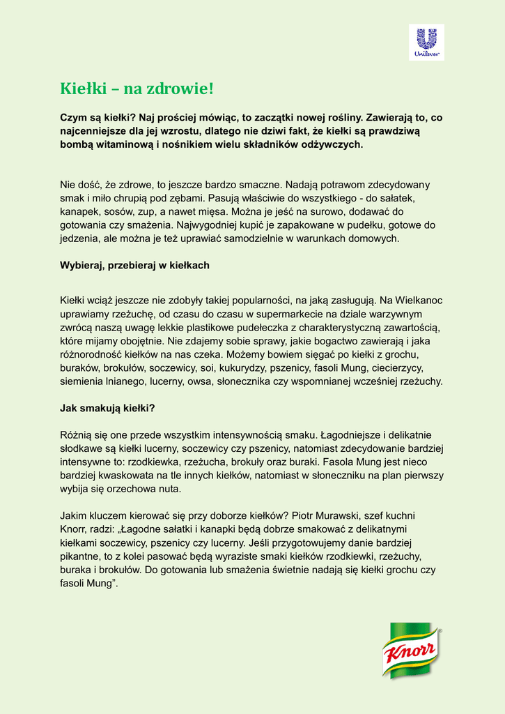 Kiełki – na zdrowie! Czym są kiełki? Naj prościej mówiąc, to zaczątki nowej rośliny. Zawierają to, co najcenniejsze dla jej wzrostu, dlatego nie dziwi fakt, że kiełki są prawdziwą bombą witaminową i nośnikiem wielu składników odżywczych. Nie dość, że zdrowe, to jeszcze bardzo smaczne. Nadają potrawom zdecydowany smak i miło chrupią pod zębami. Pasują właściwie do wszystkiego - do sałatek, kanapek, sosów, zup, a nawet mięsa. Można je jeść na surowo, dodawać do gotowania czy smażenia. Najwygodniej kupić je zapakowane w pudełku, gotowe do jedzenia, ale można je też uprawiać samodzielnie w warunkach domowych. Wybieraj, przebieraj w kiełkach Kiełki wciąż jeszcze nie zdobyły takiej popularności, na jaką zasługują. Na Wielkanoc uprawiamy rzeżuchę, od czasu do czasu w supermarkecie na dziale warzywnym zwrócą naszą uwagę lekkie plastikowe pudełeczka z charakterystyczną zawartością, które mijamy obojętnie. Nie zdajemy sobie sprawy, jakie bogactwo zawierają i jaka różnorodność kiełków na nas czeka. Możemy bowiem sięgać po kiełki z grochu, buraków, brokułów, soczewicy, soi, kukurydzy, pszenicy, fasoli Mung, ciecierzycy, siemienia lnianego, lucerny, owsa, słonecznika czy wspomnianej wcześniej rzeżuchy. Jak smakują kiełki? Różnią się one przede wszystkim intensywnością smaku. Łagodniejsze i delikatnie słodkawe są kiełki lucerny, soczewicy czy pszenicy, natomiast zdecydowanie bardziej intensywne to: rzodkiewka, rzeżucha, brokuły oraz buraki. Fasola Mung jest nieco bardziej kwaskowata na tle innych kiełków, natomiast w słoneczniku na plan pierwszy wybija się orzechowa nuta. Jakim kluczem kierować się przy doborze kiełków? Piotr Murawski, szef kuchni Knorr, radzi: „Łagodne sałatki i kanapki będą dobrze smakować z delikatnymi kiełkami soczewicy, pszenicy czy lucerny. Jeśli przygotowujemy danie bardziej pikantne, to z kolei pasować będą wyraziste smaki kiełków rzodkiewki, rzeżuchy, buraka i brokułów. Do gotowania lub smażenia świetnie nadają się kiełki grochu czy fasoli Mung”. Właściwości kiełków „Kiełki dostarczają różnego rodzaju witamin, makro- i mikroelementy, białka, a te z roślin oleistych, jak słonecznik czy soja, zawierają niewielkie ilości nienasyconych kwasów tłuszczowych. Przyglądając się im szczegółowo, możemy wyliczyć specyficzne korzyści wynikające z jedzenia konkretnego rodzaju kiełków” – tłumaczy Iwonna Niegowska, żywieniowiec marki Knorr. Kiełki słonecznika dostarczają organizmowi cennych mikroelementów takich jak cynk mangan, selen, niezbędnych do wielu procesów metabolicznych naszego organizmu. Kiełki soi są bogate w białko oraz niewielkie ilości witaminy A, B, C. Kiełki pszenicy charakteryzują się natomiast wysoką zawartością cynku, witamin C i E oraz witamin z grupy B. Jak ugryźć kiełki? - najlepsze przepisy Kucharze Knorr spytani o swoje preferencje dotyczące kiełków, twierdzą zgodnie, że najczęściej używają ich podczas przyrządzania sałatek. Kiełki nadają sałatce bardziej wyrazistego smaku, świetnie komponują się z warzywami i stanowią tajemniczy dodatek, który wzbudza zainteresowanie i ciekawość domowników oraz gości. Sałata, sałata, kiełki, sałata Pierwsza propozycja przepisu od szefów kuchni Knorr to barwne połączenie warzyw, przede wszystkim mieszanki sałat, jajek, makaronu i oczywiście kiełków. Poniżej przepis na Sałatkę francuską. Ilość porcji: 4 Czas przygotowania: 15 minut Stopień trudności: łatwe Składniki: - 1 opakowanie Sosu sałatkowego francuskiego Knorr, - 300 g makaronu typu świderki, - 12 czarnych oliwek, - 300 g mieszanki sałat, - 10 pomidorków cherry, - 2 jajka, - 1 łyżka kaparów, - 4 łyżki oliwy, - małe opakowanie kiełków. Przygotowanie: 1. Sałaty umyj, podziel na mniejsze kawałki, osusz ręcznikiem papierowym. Pomidory pokrój na cząstki, oliwki na połówki. 2. Jajka ugotuj na twardo, makaron gotuj do miękkości. 3. Sos sałatkowy Knorr połącz z oliwą i dwiema łyżkami wody, aby stworzyć aromatyczny sos. Dokładnie wymieszaj. 4. Makaron odcedź, dodaj sos sałatkowy, pomidorki, oliwki, kapary i listki sałaty. Wszystko wymieszaj. Sałatkę wyłóż do salaterki, udekoruj ćwiartkami jajka i kiełkami. Piotr Murawski, kucharz Knorr, poleca dodać do sałatki również anchois - co uczyni sałatkę bardziej wykwintną w smaku. Z mozzarrellą w duecie Na wiosnę i latem lubimy jeść lekko i zdrowo. Na stołach króluje sałata, pomidory i mozzarella. Jeśli to Twoje ulubione połączenie, to pewnie ucieszysz się, że pasują do niego kiełki. Poniżej szybki i łatwy przepis na Sałatkę włoską z mozzarellą. Ilość porcji: 4 Czas przygotowania: 15 minut Stopień trudności: łatwe Składniki: - 1 opakowanie Sosu sałatkowego włoskiego Knorr, - 400 g zielonej sałaty, - 250 g pomidorów cherry, - 2 kulki mozzarelli, - 4 łyżki oliwy, - sok z 1 cytryny, - małe opakowanie kiełków lucerny. Przygotowanie: 1. Umyj sałatę, podziel na małe listki, przełóż do salaterki. 2. Pomidorki cherry pokrój na połówki, mozzarellę pokrój na małe kawałki. 3. Aby przyrządzić smaczny sos, Sos sałatkowy Knorr połącz z oliwą i sokiem z cytryny. Dokładnie wymieszaj. 4. Wszystkie składniki sałatki połącz ze sobą. Wierzch dania posyp kiełkami. Podawaj ze świeżym pieczywem. Dodatkowo możesz dodać do sałatki tarty ser parmezan. Głębia smaku i koloru W kolejnym przepisie możesz użyć kiełków o bardziej wyrazistym smaku, np. kiełków rzodkiewki, gdyż i pozostałe składniki są dość charakterystyczne: cebula, papryka, czarne oliwki. Wypróbuj przepis na Kolorową sałatkę paprykową. Ilość porcji: 4 Czas przygotowania: 15 minut Stopień trudności: łatwe Składniki: - 1 opakowanie Sosu sałatkowego paprykowo-ziołowego Knorr, - 300 g makaronu typu penne, - 3 różnokolorowe papryki (np. czerwona, zielo