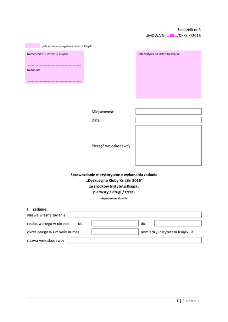 Załącznik nr 3 UMOWA Nr …00…/DKK/IK/2016 pola zacienione wypełnia Instytut Książki Numer rejestru Instytutu Książki: Data wpływu do Instytutu Książki: ………………………………………………………………… Nabór, nr: ………………………………………………………………… Miejscowość Data Pieczęć wnioskodawcy Sprawozdanie merytoryczne z wykonania zadania „Dyskusyjne Kluby Książki 2016” ze środków Instytutu Książki pierwszy / drugi / trzeci (niepotrzebne skreślić) I. Zadanie: Nazwa własna zadania realizowanego w okresie od: określonego w umowie numer do: pomiędzy Instytutem Książki, a nazwa wnioskodawcy 1|Strona Dane ogólne: a. Dyskusyjne Kluby Książki ogółem Liczba Dyskusyjnych Klubów Książki dorosłych w tym klubów dla dzieci i młodzieży miejskich w tym klubów działających na terenie gmin miejsko-wiejskich wiejskich ogółem Liczba spotkań Dyskusyjnych Klubów Książki dorosłych w tym klubów dla dzieci i młodzieży b. Uczestnicy spotkań Dyskusyjnych Klubów Książki ogółem Liczba osób uczestniczących w spotkaniach DKK dorosłych w tym klubów dla dzieci i młodzieży Średnia liczba osób uczestniczących w spotkaniach DKK ogółem dorosłych w tym klubów dla dzieci i młodzieży Liczba stałych członków DKK ogółem dorosłych w tym klubów dla dzieci i młodzieży c. Spotkania autorskie w ramach programu Dyskusyjne Kluby Książki razem dorosłych dzieci Liczba uczestników spotkań autorskich w tym spotkań autorskich dla poza programem dotacyjnym ogółem Liczba spotkań autorskich w tym liczba spotkań autorskich dla w ramach programu dotacyjnego ogółem dorosłych dzieci 2|Strona d. Uczestnicy (odbiorcy) programu Dyskusyjne Kluby Książki Liczba osób uczestniczących w spotkaniach DKK razem poza programem dotacyjnym w ramach programu dotacyjnego w tym liczba osób uczestniczących w spotkaniach DKK nie dotyczy w tym liczba osób uczestniczących w spotkaniach autorskich w tym liczba osób uczestnicząca w inicjatywach realizowanych przez bibliotekę wojewódzką nie dotyczy ogółem: e. Zakupione książki do Dyskusyjnych Klubów Książki ogółem Liczba zakupionych książek w tym do klubów dla dorosłych tytuły woluminy dzieci i młodzieży 3|Strona II. Najczęściej omawiane książki: a. Literatura piękna (w porządku alfabetycznych wg tytułu książki) Lp. Tytuł Nazwisko i imię autora Ile razy Nazwisko i imię autora Ile razy 1. 2. 3. 4. 5. 6. 7. 8. 9. 10. b. Literatura faktu (w porządku alfabetycznych wg tytułu książki) Lp. Tytuł 1. 2. 3. 4. 5. 6. 7. 8. 9. 10. c. Literatura dla dzieci i młodzieży (w porządku alfabetycznych wg tytułu książki) Lp. Tytuł Nazwisko i imię autora Ile razy 1. 2. 3. 4. 5. 6. 7. 8. 9. 10. 4|Strona III. Najczęściej czytani autorzy: a. Literatura piękna (w porządku alfabetycznych wg nazwiska autora) Lp. Nazwisko i imię autora Ile razy 1. 2. 3. 4. 5. 6. 7. 8. 9. 10. b. Literatura faktu (w porządku alfabetycznych wg nazwiska autora) Lp. Nazwisko i imię autora Ile razy 1. 2. 3. 4. 5. 6. 7. 8. 9. 10. c. Literatura dla dzieci i młodzieży (w porządku alfabetycznych wg nazwiska autora) Lp. Nazwisko i imię autora Ile razy 1. 2. 3. 4. 5. 6. 7. 8. 9. 10. 5|Strona IV. Spotkania autorskie: Ogółem: Nazwa biblioteki uczestników spotkania poza zadaniem Data w ramach zadania Nazwisko i imię autora Inni Lp. Literatura piękna Literatura faktu Literatura dla dzieci Ludzie mediów Płatne Liczba Ogółem: 1. 2. 3. 4. 5. 6. 7. 8. 9. 10. 6|Strona V. Ważniejsze inicjatywy podejmowane przez Dyskusyjne Kluby Książki w ramach programu: VI. Osoba odpowiedzialna za przygotowanie sprawozdania merytorycznego (imię i nazwisko, stanowisko/funkcja, nr telefonu, nr faksu, e-mail) pieczęć Zleceniobiorcy imię i nazwisko, podpis osoby upoważnionej lub imiona i nazwiska podpisy osób upoważnionych do składania oświadczeń woli w imieniu Zleceniobiorcy zgodnie z wpisem do rejestru instytucji kultury 7|Strona Adnotacje urzędowe (nie wypełniać) Raport sprawdzono pod względem merytorycznym. Cel i zakres merytoryczny zadania określone w umowie: a. wykonano w całości b. wykonano częściowo ....................................................................................................................., c. nie wykonano* * właściwe zakreślić Data i czytelny podpis pracownika odpowiedzialnego merytorycznie Data i podpis dyrektora Instytutu Książki WSKAZÓWKI 1. Sprawozdania merytoryczne częściowe i końcowe sporządzać należy w okresach i terminach określonych w umowie: a. pierwszy (częściowy) do 20 czerwca 2016 roku za okres 1 stycznia-31 maja 2016 roku b. drugi (częściowy) do 20 września 2016 za okres 1 stycznia-31 sierpnia 2016 roku c. trzeci (końcowy) do 31 grudnia 2016 za okres 1 stycznia-15 grudnia 2016 roku 2. Sprawozdanie merytoryczne – w jednym egzemplarzu, w formie papierowej – należy złożyć osobiście lub nadesłać przesyłką w przewidzianym w regulaminie terminie na adres Instytutu Książki: Instytut Książki / Biuro w Warszawie pl. Defilad 1 (PKiN, IX piętro, pok. 911) 00-901 Warszawa z dopiskiem „Dyskusyjne Kluby Książki 2016 – SPROAWOZDANIE MERYTORYCZNE” 3. Sprawozdanie merytoryczne – w formie elektronicznej (edytowalnej) – należy przesłać na adres poczty elektronicznej: [email protected] 4. Do sprawozdania można dołączyć – w formie elektronicznej (na płycie CD) – dodatkowe materiały mogące dokumentować działania faktyczne podjęte przy realizacji zadania (np. listy uczestników projektu, publikacje wydane w ramach projektu, raporty, wyniki prowadzonych ewaluacji). 8|Strona