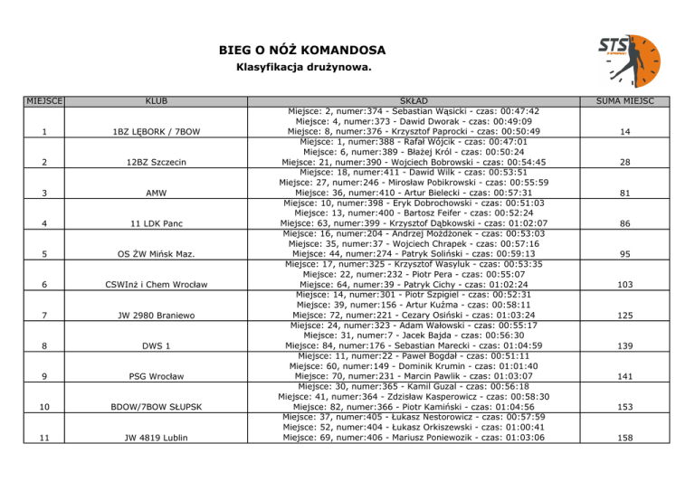BIEG O NÓŻ KOMANDOSA Klasyfikacja drużynowa. MIEJSCE KLUB 1 1BZ LĘBORK / 7BOW 2 12BZ Szczecin 3 AMW 4 11 LDK Panc 5 OS ŻW Mińsk Maz. 6 CSWInż i Chem Wrocław 7 JW 2980 Braniewo 8 DWS 1 9 PSG Wrocław 10 BDOW/7BOW SŁUPSK 11 JW 4819 Lublin SKŁAD Miejsce: 2, numer:374 - Sebastian Wąsicki - czas: 00:47:42 Miejsce: 4, numer:373 - Dawid Dworak - czas: 00:49:09 Miejsce: 8, numer:376 - Krzysztof Paprocki - czas: 00:50:49 Miejsce: 1, numer:388 - Rafał Wójcik - czas: 00:47:01 Miejsce: 6, numer:389 - Błażej Król - czas: 00:50:24 Miejsce: 21, numer:390 - Wojciech Bobrowski - czas: 00:54:45 Miejsce: 18, numer:411 - Dawid Wilk - czas: 00:53:51 Miejsce: 27, numer:246 - Mirosław Pobikrowski - czas: 00:55:59 Miejsce: 36, numer:410 - Artur Bielecki - czas: 00:57:31 Miejsce: 10, numer:398 - Eryk Dobrochowski - czas: 00:51:03 Miejsce: 13, numer:400 - Bartosz Feifer - czas: 00:52:24 Miejsce: 63, numer:399 - Krzysztof Dąbkowski - czas: 01:02:07 Miejsce: 16, numer:204 - Andrzej Możdżonek - czas: 00:53:03 Miejsce: 35, numer:37 - Wojciech Chrapek - czas: 00:57:16 Miejsce: 44, numer:274 - Patryk Soliński - czas: 00:59:13 Miejsce: 17, numer:325 - Krzysztof Wasyluk - czas: 00:53:35 Miejsce: 22, numer:232 - Piotr Pera - czas: 00:55:07 Miejsce: 64, numer:39 - Patryk Cichy - czas: 01:02:24 Miejsce: 14, numer:301 - Piotr Szpigiel - czas: 00:52:31 Miejsce: 39, numer:156 - Artur Kuźma - czas: 00:58:11 Miejsce: 72, numer:221 - Cezary Osiński - czas: 01:03:24 Miejsce: 24, numer:323 - Adam Wałowski - czas: 00:55:17 Miejsce: 31, numer:7 - Jacek Bajda - czas: 00:56:30 Miejsce: 84, numer:176 - Sebastian Marecki - czas: 01:04:59 Miejsce: 11, numer:22 - Paweł Bogdał - czas: 00:51:11 Miejsce: 60, numer:149 - Dominik Krumin - czas: 01:01:40 Miejsce: 70, numer:231 - Marcin Pawlik - czas: 01:03:07 Miejsce: 30, numer:365 - Kamil Guzal - czas: 00:56:18 Miejsce: 41, numer:364 - Zdzisław Kasperowicz - czas: 00:58:30 Miejsce: 82, numer:366 - Piotr Kamiński - czas: 01:04:56 Miejsce: 37, numer:405 - Łukasz Nestorowicz - czas: 00:57:59 Miejsce: 52, numer:404 - Łukasz Orkiszewski - czas: 01:00:41 Miejsce: 69, numer:406 - Mariusz Poniewozik - czas: 01:03:06 SUMA MIEJSC 14 28 81 86 95 103 125 139 141 153 158 BIEG O NÓŻ KOMANDOSA Klasyfikacja drużynowa. MIEJSCE KLUB 12 Śląski Oddział Straży Granicznej 13 10 BLog Opole ŚOW 14 WSOWL Wrocław 15 WAT Warszawa 16 Wyższa Szkoła Policji w Szczytni 17 JW 1551 Sieradz 18 JW 4391 19 KM PSP Leszno 20 32 Baza Lotnictwa Taktycznego 21 Areszt Śledczy Kraków 22 AZS WAT Warszawa SKŁAD Miejsce: 26, numer:5 - Tomasz Bachorski - czas: 00:55:50 Miejsce: 61, numer:258 - Paweł Ryś - czas: 01:01:50 Miejsce: 76, numer:268 - Eugeniusz Słobodzian - czas: 01:03:49 Miejsce: 51, numer:354 - Jacek Żuk - czas: 01:00:32 Miejsce: 54, numer:307 - Michał Śmitkowski - czas: 01:00:49 Miejsce: 68, numer:330 - Krzysztof Więcek - czas: 01:02:57 Miejsce: 38, numer:150 - Michał Krzal - czas: 00:58:00 Miejsce: 88, numer:337 - Piotr Wojnarowski - czas: 01:05:34 Miejsce: 90, numer:322 - Tycjan Wagner - czas: 01:05:41 Miejsce: 34, numer:169 - Wiktor Łuckoś - czas: 00:57:15 Miejsce: 93, numer:89 - Marcin Guziński - czas: 01:05:54 Miejsce: 100, numer:129 - Konrad Kobyliński - czas: 01:06:23 Miejsce: 3, numer:336 - Maciej Wojciechowski - czas: 00:48:57 Miejsce: 109, numer:94 - Sebastian Hulin - czas: 01:07:23 Miejsce: 168, numer:290 - Krzysztof Suchodolski - czas: 01:12:21 Miejsce: 15, numer:319 - Michał Urbanowicz - czas: 00:52:45 Miejsce: 101, numer:40 - Wojciech Ciołek - czas: 01:06:39 Miejsce: 189, numer:73 - Paweł Gąska - czas: 01:14:04 Miejsce: 43, numer:69 - Wojciech Gadzina - czas: 00:59:10 Miejsce: 110, numer:126 - Paweł Knap - czas: 01:07:27 Miejsce: 152, numer:318 - Adam Udziela - czas: 01:10:49 Miejsce: 58, numer:55 - Sławomir Durka - czas: 01:01:32 Miejsce: 94, numer:209 - Tomasz Musiał - czas: 01:05:59 Miejsce: 169, numer:207 - Piotr Mulczyński - czas: 01:12:24 Miejsce: 107, numer:382 - Sylwester Pyszak - czas: 01:07:17 Miejsce: 115, numer:159 - Paweł Kwiatkowski - czas: 01:07:43 Miejsce: 116, numer:234 - Jarosław Pękala - czas: 01:08:05 Miejsce: 32, numer:348 - Bogusław Zakrzewski - czas: 00:56:47 Miejsce: 155, numer:95 - Dawid Hull - czas: 01:10:57 Miejsce: 206, numer:8 - Radosław Bakulas - czas: 01:17:07 Miejsce: 118, numer:14 - Przemysław Białobrzeski - czas: 01:08:12 Miejsce: 120, numer:131 - Łukasz Koguciuk - czas: 01:08:17 Miejsce: 155, numer:138 - Arkadiusz Kotłowski - czas: 01:10:57 SUMA MIEJSC 163 173 216 227 280 305 305 321 338 393 393 BIEG O NÓŻ KOMANDOSA Klasyfikacja drużynowa. MIEJSCE KLUB 23 KM PSP w Katowicach 24 WKB Meta Lubliniec 25 JW 1872 Słupsk 26 Straż Miejska Łódź 27 KPP Olesno 28 OSP Mroczeń 29 Straż Zamkowa Wawel 30 NSZZ Policjantów KMP Piekary Śląskie 31 KMP Ruda Ślaska 32 Zakład Karny Wadowice 33 10 Wpsam Warszawa SKŁAD Miejsce: 67, numer:88 - Robert Gunther - czas: 01:02:49 Miejsce: 81, numer:289 - Rafał Stwora - czas: 01:04:42 Miejsce: 246, numer:58 - Tomasz Dziechciarz - czas: 01:25:02 Miejsce: 125, numer:2 - Roman Polko - czas: 01:08:29 Miejsce: 126, numer:193 - Stanisław Miluk - czas: 01:08:33 Miejsce: 144, numer:292 - Aleksy Szablicki - czas: 01:09:54 Miejsce: 111, numer:137 - Mariusz Kostecki - czas: 01:07:29 Miejsce: 128, numer:123 - Rafał Kickmunter - czas: 01:08:35 Miejsce: 172, numer:372 - Damian Cichała - czas: 01:12:31 Miejsce: 62, numer:21 - Roman Bodył - czas: 01:01:56 Miejsce: 169, numer:162 - Michał Lesiecki - czas: 01:12:24 Miejsce: 182, numer:46 - Piotr Czyżewski - czas: 01:13:14 Miejsce: 98, numer:64 - Stanisław Filak - czas: 01:06:18 Miejsce: 140, numer:228 - Krzysztof Palej - czas: 01:09:44 Miejsce: 198, numer:419 - Janusz Kochman - czas: 01:15:30 Miejsce: 137, numer:392 - Grzegorz Kupczak - czas: 01:09:16 Miejsce: 139, numer:115 - Rafał Kania - czas: 01:09:40 Miejsce: 164, numer:391 - Marek Zaremba - czas: 01:11:57 Miejsce: 142, numer:191 - Zbigniew Mikuła - czas: 01:09:49 Miejsce: 14