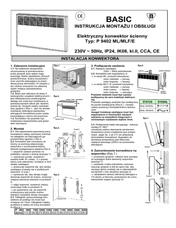 BASIC INSTRUKCJA MONTAŻU I OBSŁUGI Elektryczny konwektor ścienny Typ: P 9402 ML/MLF/E 230V ~ 50Hz, IP24, IK08, kl.II, CCA, CE INSTALACJA KONWEKTORA 1. Zalecenia instalacyjne Rys.1. 1.1. Na stabilność temperatury utrzymywanej w pomieszczeniu przez grzejnik duży wpływ mają przeciągi, bliskie sąsiedztwo zimnych powierzchni(np. ściany szczytowe) i inne czynniki wpływające na prawidłową pracę termostatu. W związku z tym istotne znaczenie ma właściwy wybór miejsca zainstalowania grzejnika. 1.2. Basic jest zaliczany do klasy II izolacyjności urządzeń elektrycznych i jest zabezpieczony antybryzgowo, dlatego też może być instalowany w pomieszczeniach takich jak: łazienki, pralnie itp. Grzejnik należy zainstalować zgodnie z Rys.1., aby nie istniała możliwość dotknięcia elementów sterujących konwektora przez osobę korzystającą z wanny lub prysznica. 1.3. Konwektor nie powinien być instalowany bezpośrednio pod gniazdem sieciowym. Rys.2. 2. Montaż Rys.4. parapet / półka – głęb.200mm min. 200 wymiary w mm Rys.6. 3.1. Napięcie zasilające: wspornik 230V ~ 50Hz jednofazowe 3.2. Konwektor jest wyposażony w: w wersji ML: przewód dwużyłowy; kolor niebieski zerowy kolor brązowy fazowy w wersji MLF i E: przewód trzyżyłowy; kolor niebieski zerowy kolor czarny fazowy kolor brązowy sterujący Przewód niebieski musi być zawsze podłączony do zera instalacji elektrycznej. STATUS Przewód zasilający powinien być podłączony do puszki instalacyjnej (Rys.6.) - montaż temp. komfortu należy powierzyć kompetentnemu fachowcowi. temp. obniżona Uwaga! Instalacja zasilająca musi być wyposażona w mechanizm odcięcia zasilania na wszystkich biegunach z Rys.7. minimalnym rozstawem styków 3mm. 3. Podłączenie zasilania min. 200 min. 150 Pozycja 2 2.1. Dla zapewnienia poprawnej pracy odginane konwektora należy zachować minimalpodkładki ne odległości od otaczających go Pozycja 1 przedmiotów zgodnie z Rys.2. 2.2. Konwektor jest mocowany do ściany za pomocą załączonego wspornika z ocynkowanej blachy. Sposób postępowania wyjaśnia Rys.4. otwory wspornik ustawić pionowo na ustalające podłodze i oprzeć o ścianę (pozycja 1) zaznaczyć punkty, wywiercić i osadzić kołki: B z lewej , C z prawej strony (lub odwrotnie), umieścić w nich wkręty ustalające. przesunąć wspornik tak, aby wkręty ustalające znalazły się w podłużnych otworach: H oraz I. wyrównać tak, aby wkręty mogły Rys.5. docisnąć wspornik do ściany, oznaczyć miejsca wiercenia otworów w punktach A. zdjąć wspornik, wywiercić otwory, umocować kołki w punktach A. po upewnieniu się ,że wspornik umieszczony jest prosto można dokręcić wszystkie wkręty mocujące. 2.3. Odległość zamocowanego konwymiary w mm wektora od podłogi nie może być mniejsza niż 15cm. Odległość między punktami A zależy od mocy konwektora (Rys.5.) P (W) 500 750 1000 1250 1500 1750 2000 2500 3000 A(mm) 113.3 193.5 273.5 353.4 433.5 593.5 673.5 833.4 835.4 3.3. Podłączenie kabla sterującego - dotyczy modelu E i MLF. Umożliwia zdalne sterowanie obniżeniem temperatury przez urządzenia typu programator, zegar itp. o ok.4C od ustawionej termostatem konwektora. Sygnałem do obniżenia temperatury jest obecność napięcia fazowego (230V) na przewodzie sterującym. Pozycja 1 4. Zamontowanie konwektora na wsporniku (Rys.7.) przechylić grzejnik i nałożyć dwa zaczepy na wystające dolne elementy wspornika (pozycja 1) podnieść o kilka milimetrów i pionowo nasunąć grzejnik w dół do oporu tak, aby zaczepy górne znalazły się w odpowiednich wycięciach z tyłu obudowy (pozycja 2) wkrętakiem obrócić elementy blokujące o 1/4 obrotu w kierunku przeciwnym do ruchu wskazówek zegara (pozycja 3) Pozycja 2 Pozycja 3 puszka instalacyjna przewód zasilający SYGNAŁ URUCHOMIENIE GRZEJNIKA Podczas pierwszego włączenia z grzejnika może wydobywać się para. Jest to zjawisko normalne i nie występuje przy normalnej eksploatacji. Rys.8. 1. Opis elementów regulacyjnych (Rys.8.) 1.1. Wyłącznik zasilania umieszczony jest na prawym boku obudowy konwektora: pozycja „0” : odłączone napięcie zasilające pozycja „I” : podłączone napięcie zasilające 1.2. Pokrętło termostatu wyskalowane od do 8 usytuowane na prawym boku obudowy konwektora. 1.3. Dodatkowo model E jest wyposażony w świetlny sygnalizator włączenia grzania (zlokalizowany obok pokrętła termostatu). ZDEJMOWANIE GRZEJNIKA UWAGA: Wszelkie czynności nie związane z normalną eksploatacją grzejnika powinny być wykonywane przez kwalifikowanego fachowca, po odłączeniu zasilania. 1. Zdejmowanie konwektora przed zdjęciem konwektora ze wspornika należy ustawić wyłącznik zasilania w pozycji „0” wkrętakiem obrócić o 1/4 obrotu elementy blokujące w kierunku zgodnym z ruchem wskazówek zegara (Rys.7 ,poz.3) unieść konwektor pionowo do góry, aż do zdjęcia z zaczepów wspornika odłączyć kabel zasilający z puszki instalacyjnej 2. Wymiana kabla zasilającego Podczas wymiany kabla zasilającego należy przestrzegać poniższych zaleceń: 1. Zdjąć konwektor 2. Zdjąć tylną osłonę 3. Odkręcić wkręt mocujący kabel 4. Odłączać przewody kabla zasilającego notując kolory i miejsca podłączeń wewnętrznych 5. Wyjąć kabel Rys.10. 6. Podłączyć nowy-tylko fabryczny lub uzgodniony z autoryzowanym serwisem BARDZO WAŻNE: 2. Skalowanie termostatu Aby prawidłowo wyregulować ustawienie termostatu należy: 2.1. W środku ogrzewanego pomieszczenia umieścić termometr na wysokości ok.1,20m od podłogi (przy zamkniętych drzwiach i oknach). 2.2. Wyłącznik zasilania ustawić w pozycji „I”. 2.3. Pokrętło termostatu ustawić w pozycji „8” (max.) 2.4. W momencie gdy temperatura powietrza w pomieszczeniu osiągnie pożądaną wartość - np.20C, należy obracając pokrętłem termostatu doprowadzić do wyłączenia grzejnika (w modelu E zgaśnie sygnalizator). Tak ustawiony termosta