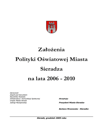 ZałoŜenia Polityki Oświatowej Miasta Sieradza na lata 2006 - 2010 Opracował: Zespół pod kierunkiem Naczelnika Wydziału Infrastruktury i Komunikacji Społecznej Urzędu Miasta Sieradz Jadwigi Maciejewskiej Akceptuję: Prezydent Miasta Sieradza Barbara Mrozowska - Nieradko _______________________________________________________________ Sieradz, grudzień 2005 roku ZałoŜenia Polityki Oświatowej Miasta Sieradza na lata 2006 – 2010 SPIS TREŚCI I Wstęp II Część zasadnicza - Cel strategiczny - Kierunki działań oświatowych - Standardy oświatowe Miasta Sieradza - Działania zmierzające do osiągnięcia standardów oświatowych III Zakończenie - Tryb wdraŜania „ZałoŜeń polityki oświatowej Miasta Sieradza na lata 2006 – 2010” - Monitoring i ewaluacja „ZałoŜeń polityki oświatowej Miasta Sieradza na lata 2006 – 2010” 2 ZałoŜenia Polityki Oświatowej Miasta Sieradza na lata 2006 – 2010 Wstęp Podstawą prawną opracowania „ZałoŜeń Polityki Oświatowej Miasta Sieradza do roku 2010” są postanowienia art. 5, 5a i art. 17 ustawy z dnia 7 września 1991r. o systemie oświaty, art. 18 ust. 1 – ustawy z dnia 8 marca 1990r. o samorządzie gminnym oraz przepisy wykonawcze do tychŜe ustaw. Dokumentem wskazującym kierunki rozwoju polskiej oświaty jest „Strategia Rozwoju Edukacji na lata 2007 – 2013” przygotowana przez Ministerstwo Edukacji Narodowej i Sportu w sierpniu 2005 roku. Punktem wyjścia do niniejszego opracowania jest „Raport o stanie oświaty w mieście Sieradzu”, który został przyjęty Uchwałą Nr XXVIII/ 251/2005 Rady Miejskiej w Sieradzu z dnia 10 lutego 2005 r. w sprawie przyjęcia „raportu o stanie oświaty w mieście Sieradzu” i stanowiący załącznik do uchwały. Wypełniając zapisy Uchwały Nr VII/73/2003 Rady Miejskiej w Sieradzu z dnia 10 kwietnia 2003 roku w sprawie powołania zespołu do spraw opracowania „ZałoŜeń Polityki Oświatowej Miasta Sieradza”, Zarządzeniem Prezydenta Miasta Sieradza Nr 139/2005 z dnia 30 sierpnia 2005 ustalona została liczba przedstawicieli do składu zespołu zobowiązanego do przygotowania projektu „ZałoŜeń....”. W skład zespołu weszli przedstawiciele Rady Miejskiej w Sieradzu, Delegatury w Sieradzu Kuratorium Oświaty w Sieradzu, Urzędu Miasta Sieradz, dyrektorów szkół i przedszkoli prowadzonych przez miasto Sieradz, rad rodziców ze szkół i przedszkoli prowadzonych przez miasto Sieradz, instytucji kultury, organizacji związkowych zrzeszających pracowników oświaty, młodzieŜy: Jolanta Alagierska Anna Baran Małgorzata Bartkowiak Grzegorz Błaszczyk Krystyna Brodowska Zbigniew Czarnek Romuald Erenc Jacek Goc Wanda Gudowicz Regina Jaworska Zbigniew Kęsiak Łukasz Krakowski Halina Leśniowska Zbigniew Łuczak Jadwiga Maciejewska Barbara Majewska Jolanta Mańkowska Ewa Owczarek Teresa Paprocka - Rada Rodziców Gimnazjum nr 1 Rada Rodziców Gimnazjum nr 2 Szkoła Podstawowa nr 9 Rada Miejska w Sieradzu Rada Miejska w Sieradzu Urząd Miasta Sieradz Miejski Dom Kultury Szkoła Podstawowa nr 4 Rada Miejska w Sieradzu Związek Nauczycielstwa Polskiego Rada Rodziców Przedszkola nr 5 MłodzieŜowa Rada Miasta Urząd Miasta Sieradz Miejska Biblioteka Publiczna Urząd Miasta Sieradz Rada Rodziców Szkoły Podstawowej nr 1 Gimnazjum nr 2 Przedszkole nr 2 Delegatura w Sieradzu Kuratorium Oświaty w Łodzi 3 ZałoŜenia Polityki Oświatowej Miasta Sieradza na lata 2006 – 2010 Małgorzata Pawełczyk Małgorzata Pęczek Helena Rajewska ElŜbieta RóŜycka Andrzej Sroczyński Emilia Szczepańska Jolanta Szymańska - Rada Rodziców Przedszkola nr 3 Rada Rodziców Szkoły Podstawowej nr 7 Gimnazjum nr 3 Delegatura w Sieradzu Kuratorium Oświaty w Łodzi Rada Miejska w Sieradzu Terenowa Komisja NSZZ „Solidarność” Podregion Sieradz Przedszkole nr 6 Opracowany przez pracowników Wydziału Infrastruktury i Komunikacji Społecznej Urzędu Miasta Sieradza „Raport o stanie oświaty w mieście” obejmuje informacje w zakresie placówek oświatowych funkcjonujących w latach 2002-2004 na terenie miasta wraz z analizą finansową, analizą jakości pracy tych placówek i podkreśleniem mocnych stron oraz wskazaniem problemów nurtujących sieradzką oświatę. Kierunki działań oświatowych, standardy oświatowe miasta i działania zmierzające do osiągnięcia standardów zawarte w „ZałoŜeniach Polityki Oświatowej Miasta Sieradza do roku 2010” powinny pozwolić na: - podniesienie jakości edukacji, - wyrównanie szans edukacyjnych, - wszechstronny rozwój dzieci i młodzieŜy z róŜnych środowisk, - zwiększenie efektywności zarządzania placówkami oświatowymi i finansowania zadań edukacyjnych, - zapewnienie wewnętrznej spójności i droŜności systemu edukacji rozumianego w perspektywie kształcenia ustawicznego i osiągania mobilności zawodowej, - upowszechnianie wykształcenia wyŜszego. ZałoŜenia polityki oświatowej samorządu sieradzkiego są spójne z polityką państwa, polityka oświatową naszego regionu i uwzględniają istniejące w naszym środowisku uwarunkowania. Edukacja jako bardzo istotny czynnik rozwoju społeczeństwa i gospodarki opartej na wiedzy i wykształceniu, musi być potraktowana jako najwaŜniejsza inwestycja w przyszłość naszego społeczeństwa. Jeśli chcemy sprostać międzynarodowej konkurencji gospodarczej, musimy umoŜliwić swoim obywatelom wszechstronny rozwój od najmłodszych lat Ŝycia i tak prowadzić edukację oraz poszukiwać takich rozwiązań, aby się zbliŜyć do standardów europejskich. Samorząd jako organ prowadzący odpowiada za dystrybucję i racjonalne wykorzystanie środków finansowych przeznaczonych na realizację zadań oświatowych, a w szczególności za tworzenie materialnych i organizacyjnych warunków funkcjonowania placówek oświatowych na terenie miasta. Dlatego opracowano propozycje załoŜeń polityki 4 ZałoŜenia Polityki Oświatowej Miasta Sieradza na lata 2006 – 2010 oświato