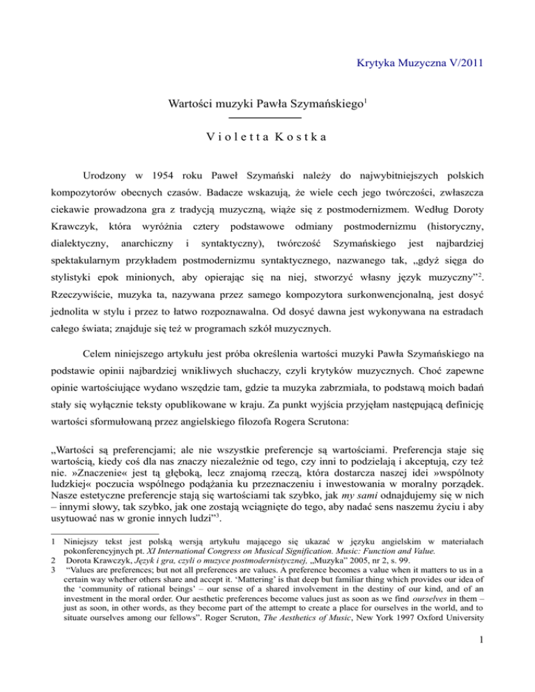 Krytyka Muzyczna V/2011 Wartości muzyki Pawła Szymańskiego1 Violetta Kostka Urodzony w 1954 roku Paweł Szymański należy do najwybitniejszych polskich kompozytorów obecnych czasów. Badacze wskazują, że wiele cech jego twórczości, zwłaszcza ciekawie prowadzona gra z tradycją muzyczną, wiąże się z postmodernizmem. Według Doroty Krawczyk, dialektyczny, która wyróżnia anarchiczny cztery i podstawowe syntaktyczny), odmiany twórczość postmodernizmu Szymańskiego jest (historyczny, najbardziej spektakularnym przykładem postmodernizmu syntaktycznego, nazwanego tak, „gdyż sięga do stylistyki epok minionych, aby opierając się na niej, stworzyć własny język muzyczny” 2. Rzeczywiście, muzyka ta, nazywana przez samego kompozytora surkonwencjonalną, jest dosyć jednolita w stylu i przez to łatwo rozpoznawalna. Od dosyć dawna jest wykonywana na estradach całego świata; znajduje się też w programach szkół muzycznych. Celem niniejszego artykułu jest próba określenia wartości muzyki Pawła Szymańskiego na podstawie opinii najbardziej wnikliwych słuchaczy, czyli krytyków muzycznych. Choć zapewne opinie wartościujące wydano wszędzie tam, gdzie ta muzyka zabrzmiała, to podstawą moich badań stały się wyłącznie teksty opublikowane w kraju. Za punkt wyjścia przyjęłam następującą definicję wartości sformułowaną przez angielskiego filozofa Rogera Scrutona: „Wartości są preferencjami; ale nie wszystkie preferencje są wartościami. Preferencja staje się wartością, kiedy coś dla nas znaczy niezależnie od tego, czy inni to podzielają i akceptują, czy też nie. »Znaczenie« jest tą głęboką, lecz znajomą rzeczą, która dostarcza naszej idei »wspólnoty ludzkiej« poczucia wspólnego podążania ku przeznaczeniu i inwestowania w moralny porządek. Nasze estetyczne preferencje stają się wartościami tak szybko, jak my sami odnajdujemy się w nich – innymi słowy, tak szybko, jak one zostają wciągnięte do tego, aby nadać sens naszemu życiu i aby usytuować nas w gronie innych ludzi”3. 1 Niniejszy tekst jest polską wersją artykułu mającego się ukazać w języku angielskim w materiałach pokonferencyjnych pt. XI International Congress on Musical Signification. Music: Function and Value. 2 Dorota Krawczyk, Język i gra, czyli o muzyce postmodernistycznej, „Muzyka” 2005, nr 2, s. 99. 3 “Values are preferences; but not all preferences are values. A preference becomes a value when it matters to us in a certain way whether others share and accept it. ‘Mattering’ is that deep but familiar thing which provides our idea of the ‘community of rational beings’ – our sense of a shared involvement in the destiny of our kind, and of an investment in the moral order. Our aesthetic preferences become values just as soon as we find ourselves in them – just as soon, in other words, as they become part of the attempt to create a place for ourselves in the world, and to situate ourselves among our fellows”. Roger Scruton, The Aesthetics of Music, New York 1997 Oxford University 1 Krytyka Muzyczna V/2011 Od tegoż filozofa przejęłam też informacje o tym, że wartości mogą ujawniać się w języku na trzy sposoby: (1) bezpośrednio, (2) jako zwroty określające wpływ dzieła na słuchaczy i (3) jako estetyczne opisy bez sądów wartościujących4. Po przejrzeniu wszystkich tekstów na temat muzyki Pawła Szymańskiego wybrałam z nich wypowiedzi wartościujące pierwszego i drugiego typu, a z wypowiedzi trzeciego typu – tylko niektóre, zwykle najkrótsze. Wybrane sądy wartościujące zostały podzielone na dwie grupy: (1) odnoszące się do całej, ewentualnie części twórczości i (2) odnoszące się do pojedynczych utworów. W dalszej kolejności poszukiwałam opinii zbliżonych do siebie, z których uformowałam ostatecznie listę wartości. Wyniki moich badań przedstawiają trzy poniższe tabele. Tabela 1. Sądy wartościujące odnoszące się do całej, ewentualnie części twórczości Pawła Szymańskiego Krytyk Andrzej Chłopecki Sąd wartościujący „W rozmaity sposób buduje więc Paweł Szymański iluzoryczny pejzaż swej muzyki, działającej jednocześnie na intelekt (ależ to zmyślne!) i na zmysły (ależ to piękne!). Tu jednak też mamy jedność owej swoistej dialektyki, gdyż konstrukcja jest piękna, a zmysłowość wyrachowana. Gdyż muzyka Pawła Szymańskiego jest nieustanną grą” (2006 a, s. 100) „Szymański jest mistrzem w rozpętywaniu muzykanckiego żywiołu grania, zmysłowej, upojnej, niekiedy zatraceńczej, niekiedy szalonej, fizycznej lub zgoła fizjologicznej uciechy produkowania muzyki tętniącej i brawurowej, pysznej, bezwstydnej, niemal… lubieżnej. (…) Szymański jest mistrzem budowania z zimną krwią sytuacji czułych w muzyce. (…) Szymański jest mistrzem fakturalnego przyspieszenia i zwalniania toku narracji. Jest też mistrzem dekomponowania” (2006 a, s. 25) „Sztukę Szymańskiego (…) można rozumieć też jako krytykę współczesnej, powierzchownej percepcji muzyki przeszłości, z której do wyobraźni społeczeństwa fonograficznego najsilniej przemawiają niemal wyłącznie obiegowe zwroty i konwencjonalne gesty” (2006 a, s. 86) „zgoła metafizyczna siła oddziaływania muzyki Pawła Szymańskiego” (2006 b, s. 26) „W wielu przypadkach mamy w tej twórczości do czynienia ze szczególną rozgrywką, w której chodzi o ostateczny wynik, o uzyskanie muzycznej kategorii sacrum” (2006 b, s. 26) 4 Press, p. 369-370. Tłumaczenie autorki. J.w., s. 370-374. 2 Krytyka Muzyczna V/2011 „Brawurowa i wirtuozowska gra Pawła Szymańskiego z idiomami przeszłości, zawsze realizowana w ścisłej, konstruktywistycznej dyscyplinie, muzyka, która zdumiewa raz metafizyczną głębią, innym razem fajerwerkiem niemal ludycznej zmysłowości, muzyka hipnotycznego często piękna iluzorycznych konstrukcji to jedno z najbardziej znaczących zjawisk 