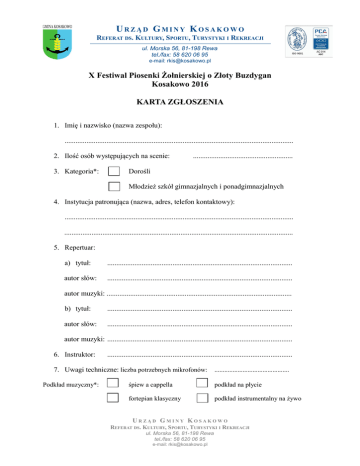 URZĄD GMINY KOSAKOWO REFERAT DS. KULTURY, SPORTU, TURYSTYKI I REKREACJI ul. Morska 56, 81-198 Rewa tel./fax: 58 620 06 95 e-mail: [email protected] X Festiwal Piosenki Żołnierskiej o Złoty Buzdygan Kosakowo 2016 KARTA ZGŁOSZENIA 1. Imię i nazwisko (nazwa zespołu): .............................................................................................................................. 2. Ilość osób występujących na scenie: 3. Kategoria*: ....................................................... Dorośli Młodzież szkół gimnazjalnych i ponadgimnazjalnych 4. Instytucja patronująca (nazwa, adres, telefon kontaktowy): .............................................................................................................................. .............................................................................................................................. 5. Repertuar: a) tytuł: ...................................................................................................... autor słów: ...................................................................................................... autor muzyki: ...................................................................................................... b) tytuł: ...................................................................................................... autor słów: ...................................................................................................... autor muzyki: ...................................................................................................... 6. Instruktor: ...................................................................................................... 7. Uwagi techniczne: liczba potrzebnych mikrofonów: ............................................. Podkład muzyczny*: śpiew a cappella podkład na płycie fortepian klasyczny podkład instrumentalny na żywo URZĄD GMINY KOSAKOWO REFERAT DS. KULTURY, SPORTU, TURYSTYKI I REKREACJI ul. Morska 56, 81-198 Rewa tel./fax: 58 620 06 95 e-mail: [email protected] URZĄD GMINY KOSAKOWO REFERAT DS. KULTURY, SPORTU, TURYSTYKI I REKREACJI ul. Morska 56, 81-198 Rewa tel./fax: 58 620 06 95 e-mail: [email protected] instrument: .................................................................................................................... Czy do instrumentu jest potrzebne dodatkowe nagłośnienie? ....................................... Uwaga: Organizator zapewnia maksymalnie 8 przewodowych mikrofonów (łącznie z ewentualnym nagłośnieniem instrumentu). 8. Informacje o wykonawcy / zespole: ........................................................................................................................................... ........................................................................................................................................... ........................................................................................................................................... 9. Oświadczam, że zapoznałem się z Regulaminem Festiwalu oraz wyrażam zgodę na zarejestrowanie występu na nośnikach cyfrowych oraz wykorzystanie ich w środkach masowego przekazu. ............................................................................. (podpis pełnoletniego uczestnika lub opiekuna prawnego) * Prosimy zaznaczyć krzyżykiem odpowiedni kwadrat. URZĄD GMINY KOSAKOWO REFERAT DS. KULTURY, SPORTU, TURYSTYKI I REKREACJI ul. Morska 56, 81-198 Rewa tel./fax: 58 620 06 95 e-mail: [email protected]