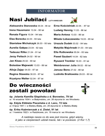 INFORMATOR Nasi Jubilaci LUTY-KWIECIEŃ Aleksandra Stanowska 05.04 - 96 lat Erna Kościelniak 22.04. - 87 lat Renata Figura 10.04 - 94 lata Maria Antosz 13.03 - 86 lat Irena Hausmann 13.04 - 95 lat Elza Borecka 22.03 - 93 lata Stanisław Michalczyk 26.03 - 93 lata Aurelia Gałęza 23.04 - 92 lata Tadeusz Rilke 21.04 - 91 lat Jerzy Peitsch 24.02 - 90 lat Jan Kisza 25.02 - 90 lat Bolesław Majewski 13.03 - 89 lat Alicja Zając 04.03 - 87 lat Regina Stawska 30.03 - 87 lat Krystyna Walter 02.04 - 87 lat Ludwig Hennig 11.03 - 86 lat Milada Łobaczewska 19.03 - 85 lat Urszula Dudek 03.02 - 84 lata Matylda Majchrzak 01.03 - 84 lata Ella Rutkowska 05.04 - 83 lata Paweł Szubert 14.04 - 82 lata Ryszard Trenkler 16.03 - 81 lat Weinbrenner Julia 09.02 - 80 lat Janusz Bens 27.02 - 80 lat Ludmiła Braiłowska 29.03 - 80 lat Do wieczności zostali powołani śp. Jolanta Kamilla Glapińska z d. Borowiec, 79 lat ur. 16 września 1934 r. w Białymstoku, zm. 26 stycznia br. we Wrocławiu śp. Edyta Elżbieta Piaczńska z d. Lanc, 72 lata ur. 8 lipca 1941 r. w Bielsku-Białej, zm. 29 stycznia br. w Bielsku-Białej śp. Erika Kaźmierczak z d. Zistel, 91 lat ur. 1 kwietnia 1922 r. w Radzikowie, zm. 19 marca br. we Wrocławiu A nadzieja nasza co do was jest mocna, gdyż wiemy, iż jako w cierpieniach udział macie, tak i w pociesze. (2 Kor 1,7) Słowo Parafialne 89/IV/2014 39 Wielkanoc 2014 Błogosławieństwa pewnego starego człowieka Błogosławieni, którzy okazują zrozumienie dla mojej potykającej się nogi i drżącej ręki! Błogosławieni, którzy rozumieją, że moje ucho musi się wysilać, aby usłyszeć, co się do mnie mówi! Błogosławieni, którzy zdają się wiedzieć, że moje oko jest mętne, a moje myśli ociężałe! Błogosławieni, którzy przez przyjacielski uśmiech dowodzą, że pragną ze mną pogawędzić! Błogosławieni, Błogosławieni, którzy dają do zrozumienia, że jestem miłowany, poważany i nie pozostawiony sobie samemu! Błogosławieni, którzy w swej dobroci ułatwiają mi dni pozostałe na drodze do wiecznej Ojczyzny! Diakonische Werk in Hannover Tłumaczył: ks. Jan Krzywoń SŁOWO PARAFIALNE Parafii Ewangelicko-Augsburskiej we Wrocławiu ul. Kazimierza Wielkiego 29, 50-077 Wrocław tel.: (+71) 34 34 730, faks: (+71) 37 23 748 e-mail: [email protected] Redakcja i skład: Marcin Orawski Kącik dla dzieci: Anna Piszczek Korekta: Agnieszka Ściepuro Wykorzystano fotografie z: PhotoXpress.com Druk: Agencja Wydawnicza „Argi“, www.argi.pl 40 Słowo Parafialne 89/IV/2014 Fot. David Jones/filckr.com (CC BY-NC 2.0) którzy nigdy nie powiedzą: „Tę historię opowiadał/a/ mi Pan/i/ już dwa razy!”