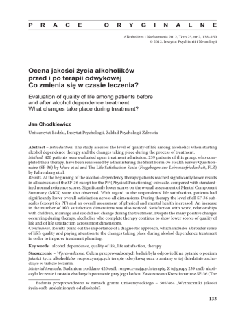 P R A C E O R Y G I N A L N E Alkoholizm i Narkomania 2012, Tom 25, nr 2, 133–150 © 2012, Instytut Psychiatrii i Neurologii Ocena jakości życia alkoholików przed i po terapii odwykowej Co zmienia się w czasie leczenia? Evaluation of quality of life among patients before and after alcohol dependence treatment What changes take place during treatment? Jan Chodkiewicz Uniwersytet Łódzki, Instytut Psychologii, Zakład Psychologii Zdrowia Abstract – Introduction. The study assesses the level of quality of life among alcoholics when starting alcohol dependence therapy and the changes taking place during the process of treatment. Method. 420 patients were evaluated upon treatment admission. 239 patients of this group, who completed their therapy, have been reassessed by administering the Short Form-36 Health Survey Questionnaire (SF-36) by Ware et al and The Life Satisfaction Scale (Fragebogen zur Lebenszufriedenheit, FLZ) by Fahrenberg et al. Results. At the beginning of the alcohol-dependency therapy patients reached significantly lower results in all subscales of the SF-36 except for the PF (Physical Functioning) subscale, compared with standardized normal reference scores. Significantly lower scores on the overall assessment of Mental Component Summary (MCS) were also observed. With regard to the respondents’ life satisfaction, patients had significantly lower overall satisfaction across all dimensions. During therapy the level of all SF-36 subscales (except for PF) and an overall assessment of physical and mental health increased. An increase in the number of life’s satisfaction dimensions was also noticed. Satisfaction with work, relationships with children, marriage and sex did not change during the treatment. Despite the many positive changes occurring during therapy, alcoholics who complete therapy continue to show lower scores of quality of life and of life satisfaction across most dimensions. Conclusions. Results point out the importance of a diagnostic approach, which includes a broader sense of life’s quality and paying attention to the changes taking place during alcohol dependence treatment in order to improve treatment planning. Key words: alcohol dependence, quality of life, life satisfaction, therapy Streszczenie – Wprowadzenie. Celem przeprowadzonych badań była odpowiedź na pytanie o poziom jakości życia alkoholików rozpoczynających terapię odwykową oraz o zmiany w tej dziedzinie zachodzące w trakcie leczenia. Materiał i metoda. Badaniom poddano 420 osób rozpoczynających terapię. Z tej grupy 239 osób ukończyło leczenie i zostało zbadanych ponownie przy jego końcu. Zastosowano Kwestionariusz SF-36 (The Badania przeprowadzono w ramach grantu uniwersyteckiego – 505/464 „Wyznaczniki jakości życia osób uzależnionych od alkoholu”. 133 Jan Chodkiewicz Short Form-36 Health Survey Questionnaire) Ware`a i wsp. oraz Kwestionariusz Zadowolenia z Życia (Fragebogen zur Lebenszufriedenheit, FLZ) Fahrenberga i wsp. Wyniki. Osoby uzależnione od alkoholu osiągnęły na początku terapii istotnie niższe, w porównaniu z grupą normalizacyjną, wyniki we wszystkich podskalach SF-36, poza podskalą PF badającą sprawność fizyczną. Istotnie niższe były także wyniki dotyczące ogólnej oceny zdrowia psychicznego (MCS). Badani pacjenci charakteryzowali się istotnie niższym ogólnym zadowoleniem z życia oraz dotyczącym wszystkich jego wymiarów. W trakcie terapii wzrósł poziom wszystkich, poza PF, podskal kwestionariusza SF-36 oraz ogólna ocena zdrowia fizycznego i psychicznego. Zanotowano także wzrost niektórych wymiarów zadowolenia z życia. W czasie leczenia nie zmieniło się natomiast zadowolenie z pracy, z relacji z dziećmi, małżeństwa oraz seksu. Pomimo wielu pozytywnych zmian zachodzących w czasie leczenia, osoby uzależnione kończąc terapię nadal charakteryzują się istotnie obniżoną jakością życia i niskim zadowoleniem w obrębie większości analizowanych sfer. Wnioski. Otrzymane wyniki wskazują na potrzebę diagnozowania pacjentów w dziedzinie szeroko rozumianej jakości życia oraz zwracania uwagi na zmiany, jakie zachodzą w tym wymiarze w trakcie leczenia uzależnień, także w aspekcie planowania terapii. Słowa kluczowe: uzależnienie od alkoholu, jakość życia, zadowolenie z życia, terapia WSTĘP Problematyka związana z jakością życia (Quality of Life – QOL) budzi nieustannie duże zainteresowanie przedstawicieli wielu dziedzin nauki, w tym medycyny i psychologii. Wśród przyczyn jej popularności w medycynie wymienić należy przede wszystkim zmianę w podejściu do zdrowia ujmowanego obecnie, zgodnie z definicją WHO, jako dobrostan biopsychospołeczny, a nie tylko jako brak choroby (1). Zmiana ta przyczyniła się do ugruntowania przekonania, że dla zrozumienia samopoczucia i funkcjonowania osób chorych nie wystarczają wyłącznie medyczne wskaźniki (1, 2, 3, 4, 5, 6). Nie bez znaczenia była również wzrastająca liczba osób cierpiących na choroby przewlekłe, których nie da się wyleczyć, ale których przebieg i ich wpływ na pacjentów można kontrolować. Istotne okazały się także rosnące koszty opieki zdrowotnej i związane z tym wymagania udowodnienia skuteczności stosowanych środków leczniczych (7). Cel leczenia zaczęto widzieć nie tylko w doprowadzeniu do ustąpienia objawów choroby, ale także w poprawie dobrostanu pacjentów, dlatego naturalne stało się podejmowanie wysiłków w kierunku konceptualizacji i operacjonalizacji pojęcia „jakość życia” (4, 8). W odniesieniu do zdrowia psychicznego podejście takie jest zgodne z trójczłonowym modelem zdrowia psychicznego i zmiany w terapii autorstwa Struppa i Handley (9, 10, 11). W modelu tym przyjęto trzy perspektywy oceny zdrowia psychicznego: społeczną (przystosowanie jednostki i wypełnianie przez nią ról życiowych), pacjenta (odczuwany przez niego dobrostan) oraz perspektywę specjalistów w 