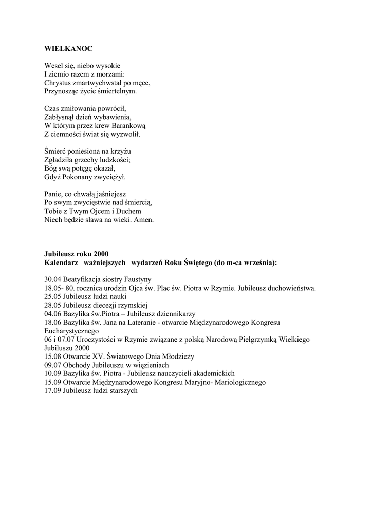 WIELKANOC Wesel się, niebo wysokie I ziemio razem z morzami: Chrystus zmartwychwstał po męce, Przynosząc życie śmiertelnym. Czas zmiłowania powrócił, Zabłysnął dzień wybawienia, W którym przez krew Barankową Z ciemności świat się wyzwolił. Śmierć poniesiona na krzyżu Zgładziła grzechy ludzkości; Bóg swą potęgę okazał, Gdyż Pokonany zwyciężył. Panie, co chwałą jaśniejesz Po swym zwycięstwie nad śmiercią, Tobie z Twym Ojcem i Duchem Niech będzie sława na wieki. Amen. Jubileusz roku 2000 Kalendarz ważniejszych wydarzeń Roku Świętego (do m-ca września): 30.04 Beatyfikacja siostry Faustyny 18.05- 80. rocznica urodzin Ojca św. Plac św. Piotra w Rzymie. Jubileusz duchowieństwa. 25.05 Jubileusz ludzi nauki 28.05 Jubileusz diecezji rzymskiej 04.06 Bazylika św.Piotra – Jubileusz dziennikarzy 18.06 Bazylika św. Jana na Lateranie - otwarcie Międzynarodowego Kongresu Eucharystycznego 06 i 07.07 Uroczystości w Rzymie związane z polską Narodową Pielgrzymką Wielkiego Jubiluszu 2000 15.08 Otwarcie XV. Światowego Dnia Młodzieży 09.07 Obchody Jubileuszu w więzieniach 10.09 Bazylika św. Piotra - Jubileusz nauczycieli akademickich 15.09 Otwarcie Międzynarodowego Kongresu Maryjno- Mariologicznego 17.09 Jubileusz ludzi starszych Do zmartwychwstania idziemy z radością... Ks. Wiesław Wiosna już powoli rozgaszcza się radośnie delikatną zielenią. Słońce coraz wolniej powraca do nocy, a wiatr przyjaźniej głaszcze nasze twarze. Ziemia tak długo przygnieciona grobowym milczeniem teraz śpiewa pieśń życia, w której jakoś dziwnie wyjaśnia się Wielkanoc. W niej już teraz możemy świętować swą chwalebną przyszłość, którą rozpoczął Chrystus kiedy powstał z grobu. Biblia wielokrotnie zaświadcza, że to wydarzenie stało się pierwszym przedmiotem apostolskiej kerygmy (Dz 2,24). Później w jego świetle ujrzano wartość krzyża i aktualność słów Chrystusa wypowiedzianych od chrztu w Rzece Jordan aż po to ostatnie: Oto Ja jestem z wami (Mt 28,20). Dopiero na końcu pojawiło się pytanie, jaki był początek życia Tego, który umarł a potem zmartwychwstał. Nie trudno zauważyć, że treść apostolskiego głoszenia radosnej nowiny zdradza wewnętrzną hierarchię, gdzie na czele stoi wieść o zmartwychwstaniu. To ono zaważyło na tym, że znamy Chrystusa, i że wieść o Nim się niesie aż po krańce ziemi (Dz, 1,8). Wydarzenie to ma ciągle znaczenie nadrzędne, bez niego próżna byłaby wiara i sens życia niepełny (1 Kor 15,17). W zmartwychwstaniu Chrystusa mamy wzór naszej przyszłości, bo skoro On zmartwychwstał to i my zmartwychwstaniemy (l Kor 15,20). I chociaż kształt tego wzoru tak trudno uchwycić, bo wymyka się zmysłom i wszystkim słowom ludzkim, to jedną mamy pewność, że będzie to życie naznaczone nowością (Rz 6,4). Nigdy jednak ono nie straci tożsamości z tym życiem, które złoży się w grobie (J 20,4-10). Z obrazu tego życia znikną łzy i smutki (Ap21,4). Wypełnią je boskie rysy: chwała, światło i pokój (1 Kor 15,35-53). Będzie to życie w pełni, do którego właśnie tęskni codzienność nasza, drżąca, niespokojna, często tak szara jak jesienne pola. Do zmartwychwstania idziemy, do życia bez śmierci śpieszą się kroki nasze, sekundy, godziny. Taka jest przyszłość nasza, gdy powierzamy ją Temu, który przyszedł po to, aby nikt nie zginął (J 3,16). On też zapewnia z nadzwyczajną mocą, każdy kto we Mnie wierzy, nie umrze na wieki (J 11,26). W Nim już czas nie błądzi i grób staje się bramą- przejściem cudownym z ziemi wygnania (Rdz 3 ) do Ziemi Ojczystej (Flp 3,20), przygotowanej przez Boga, ozdobionej miłością. Trzeba więc wstać odważnie, zerwać przyjaźń z grzechem, odnowić się w myśleniu i pójść za Chrystusem. On jest pasterzem (J 10,11) i drogą, światłem, prawdą i życiem (J 14,6). Warto iść za Nim codziennie, by nie błądzić w ciemności, lecz mieć światło życia (J 8,12). Warto iść nawet wtedy, gdy smutek cierpienia lub trwoga konania powalają na ziemię (Hi). Droga ta jest pewna jak złoto najczystsze, co przetrwało ogień. Na drodze tej jest łaska - przedziwny znak opieki - jakby manna z nieba i woda ze skały (Wj 1617). Nadto droga ta jest drogą wolności (Ga 5,1), gdyż każdy na niej wybór pomnaża dobro w świecie i radość w sercach innych. Ogłoszenia Msza Rezurekcyjna rozpocznie się w Niedzielę Wielkanocną o godzinie 6.00 UWAGA DZIECI! Skarbonki Jałmużny Wielkanocnej można składać w Niedzielę Palmową w czasie Mszy św. o godz 11.30. Wierzyć sercem, świadczyć życiem... Z ŻYCIA PARAFIALNEGO ODDZIAŁU AKCJI KATOLICKIEJ Andrzej Balk Bogactwo wydarzeń Roku Jubileuszowego sprawiło, że w działalności formacyjnej odwołano się do pomocy Asystenta Kościelnego czyli naszego księdza proboszcza, który w ramach comiesięcznych spotkań pogłębia teologiczne rozumienie omawianych wydarzeń. Ważnym elementem życia chrześcijańskiego jest uczestnictwo w pielgrzymkach szczególnie do wyznaczonych sanktuariów, w których można uzyskać odpust zupełny, jubileuszowy. W naszej archidiecezji ustanowiono 8 kościołów odpustowych a najbliższym jest oczywiście oliwska archikatedra. Trzeba podkreślić, że jubileuszowemu pielgrzymowaniu Ojciec Święty poświęcił specjalny list. W naszej parafii istnieje duża możliwość włączenia się w ten jubileuszowy ruch pielgrzymkowy. Można zarówno wyjechać do Ziemi Świętej, aby przejść śladami Chrystusa, jak i pojechać z pielgrzymką do Rzymu, a można również udać się do bliżej położonych sanktuariów. Najbliższy wyjazd to pielgrzymka na Misterium Męki Pańskiej do Górki Klasztornej. Następny wyjazd to pielgrzymka do Lichenia, na którą jak co roku lista chętnych zawsze przewyższa przewidywania organizatorów. Czym jeszcze powinien zaznaczyć się w życiu chrześcijanina Rok Jubileuszowy? Jak napisano w Libreria Edit