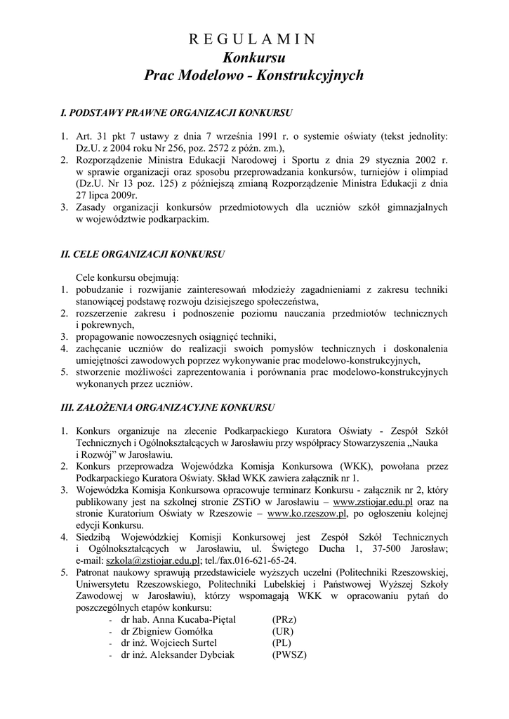 REGULAMIN Konkursu Prac Modelowo - Konstrukcyjnych I. PODSTAWY PRAWNE ORGANIZACJI KONKURSU 1. Art. 31 pkt 7 ustawy z dnia 7 września 1991 r. o systemie oświaty (tekst jednolity: Dz.U. z 2004 roku Nr 256, poz. 2572 z późn. zm.), 2. Rozporządzenie Ministra Edukacji Narodowej i Sportu z dnia 29 stycznia 2002 r. w sprawie organizacji oraz sposobu przeprowadzania konkursów, turniejów i olimpiad (Dz.U. Nr 13 poz. 125) z późniejszą zmianą Rozporządzenie Ministra Edukacji z dnia 27 lipca 2009r. 3. Zasady organizacji konkursów przedmiotowych dla uczniów szkół gimnazjalnych w województwie podkarpackim. II. CELE ORGANIZACJI KONKURSU Cele konkursu obejmują: 1. pobudzanie i rozwijanie zainteresowań młodzieży zagadnieniami z zakresu techniki stanowiącej podstawę rozwoju dzisiejszego społeczeństwa, 2. rozszerzenie zakresu i podnoszenie poziomu nauczania przedmiotów technicznych i pokrewnych, 3. propagowanie nowoczesnych osiągnięć techniki, 4. zachęcanie uczniów do realizacji swoich pomysłów technicznych i doskonalenia umiejętności zawodowych poprzez wykonywanie prac modelowo-konstrukcyjnych, 5. stworzenie możliwości zaprezentowania i porównania prac modelowo-konstrukcyjnych wykonanych przez uczniów. III. ZAŁOŻENIA ORGANIZACYJNE KONKURSU 1. Konkurs organizuje na zlecenie Podkarpackiego Kuratora Oświaty - Zespół Szkół Technicznych i Ogólnokształcących w Jarosławiu przy współpracy Stowarzyszenia „Nauka i Rozwój” w Jarosławiu. 2. Konkurs przeprowadza Wojewódzka Komisja Konkursowa (WKK), powołana przez Podkarpackiego Kuratora Oświaty. Skład WKK zawiera załącznik nr 1. 3. Wojewódzka Komisja Konkursowa opracowuje terminarz Konkursu - załącznik nr 2, który publikowany jest na szkolnej stronie ZSTiO w Jarosławiu – www.zstiojar.edu.pl oraz na stronie Kuratorium Oświaty w Rzeszowie – www.ko.rzeszow.pl, po ogłoszeniu kolejnej edycji Konkursu. 4. Siedzibą Wojewódzkiej Komisji Konkursowej jest Zespół Szkół Technicznych i Ogólnokształcących w Jarosławiu, ul. Świętego Ducha 1, 37-500 Jarosław; e-mail: [email protected]; tel./fax.016-621-65-24. 5. Patronat naukowy sprawują przedstawiciele wyższych uczelni (Politechniki Rzeszowskiej, Uniwersytetu Rzeszowskiego, Politechniki Lubelskiej i Państwowej Wyższej Szkoły Zawodowej w Jarosławiu), którzy wspomagają WKK w opracowaniu pytań do poszczególnych etapów konkursu: - dr hab. Anna Kucaba-Piętal (PRz) - dr Zbigniew Gomółka (UR) - dr inż. Wojciech Surtel (PL) - dr inż. Aleksander Dybciak (PWSZ) 6. Patronat techniczny sprawują: Owens Illinois Produkcja Polska, WSK PZL Rzeszów S.A., które są jednocześnie głównym fundatorem nagród dla Laureatów Konkursu. 7. Ponadto organizację Konkursu mogą wspierać inne instytucje i zakłady wytwórcze z naszego regionu oraz stowarzyszenia techniczne. IV. POSTANOWIENIA OGÓLNE KONKURSU 1. Prace modelowo-konstrukcyjne zgłaszane na Konkurs muszą mieć charakter działających urządzeń (modeli) różnego przeznaczenia z zakresu następujących dziedzin oraz ich połączeń: a) mechaniki, b) motoryzacji, c) elektroniki, d) elektrotechniki, e) telekomunikacji. 2. Praca powinna być wykonana tylko przez jednego ucznia i stanowić jego własność. 3. Dopuszcza się wykorzystanie do jej wykonania gotowych podzespołów. 4. Wraz z pracą należy dostarczyć – w wersji elektronicznej – prezentację w programie PowerPoint, która powinna uwzględniać: a) opis pracy, cel jej wykonania i zastosowanie pracy, a także kod jej autora, b) zasadę działania i istotę rozwiązań technicznych zastosowanych w pracy, c) pomysły i rozwiązania autora zastosowane w pracy (w sytuacji, gdy w pracy zostaną zastosowane gotowe podzespoły). 5. Praca musi być w widocznym miejscu opisana. Opis pracy powinien zawierać tytuł pracy, dziedzinę oraz kod wygenerowany w momencie zgłoszenia ucznia do udziału w Konkursie. 6. Do pracy powinno być dołączone oświadczenie, którego treść stanowi załącznik nr 3, stwierdzające samodzielne wykonanie pracy, podpisane przez ucznia i jego prawnego opiekuna. 7. Praca zgłoszona do Konkursu nie może być wystawiana wcześniej w innych konkursach ani stanowić odwzorowania prac z lat ubiegłych. 8. Praca w całości jest finansowana przez jej autora. 9. Najlepsze prace będą prezentowane podczas finału konkursu oraz w czasie pokonkursowej wystawy prac, po zakończeniu, której będą do odebrania w siedzibie Zespołu Szkół Technicznych i Ogólnokształcących w Jarosławiu. 10. Prace nieodebrane w terminie do 2 miesięcy od daty zakończenia wystawy stają się własnością Zespołu Szkół Technicznych i Ogólnokształcących w Jarosławiu. 11. Organizatorzy zastrzegają sobie możliwość odwołania Konkursu – prac modelowokonstrukcyjnych w przypadku niewielkiej ilości prac konkursowych. 12. Finalistami Konkursu są wszyscy uczniowie zakwalifikowani do III etapu (finału) Konkursu Wiedzy Technicznej. 13. Tytuł Laureata Konkursu uzyska 3 uczniów, których praca uzyskała największą liczbę punktów. 14. Wyniki Konkursu zostaną opublikowane na stronie internetowej Podkarpackiego Kuratora Oświaty www.ko.rzeszow.pl oraz Zespołu Szkół Technicznych i Ogólnokształcących w Jarosławiu www.zstiojar.edu.pl. V. PRZEBIEG KONKURSU PRAC MODELOWO – KONSTRUKCYJNYCH. 1. Konkurs jest organizowany w trzech etapach: Etap I – eliminacje szkolne, Etap II (półfinał) i III (finał) – w siedzibie Zespołu Szkół Technicznych i Ogólnokształcących w Jarosławiu. 2. Eliminacje szkolne (I etap) przeprowadzi Komisja Szkolna Konkursu powołana przez Dyrektora Gimnazjum. 3. O zakwalifikowaniu prac do II etapu konkursu decyduje Komisja Szkolna według kryteriów określonych w punkcie III. 4. Do II etapu należy zgłaszać tylko te prace modelowo-konstrukcyjne, które w etapie szkolnym zajęły trzy pierwsze miejsca. 5. Prace modelowo-konstrukcyjne należy dostarczyć do siedziby ZSTiO w Jarosławiu w