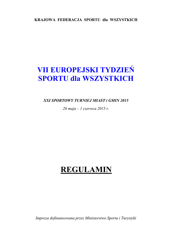 KRAJOWA FEDERACJA SPORTU dla WSZYSTKICH VII EUROPEJSKI TYDZIEŃ SPORTU dla WSZYSTKICH XXI SPORTOWY TURNIEJ MIAST i GMIN 2015 26 maja – 1 czerwca 2015 r. REGULAMIN Impreza dofinansowana przez Ministerstwo Sportu i Turystyki Do wójtów, burmistrzów i prezydentów miast! Do dyrektorów przedszkoli, szkół i rektorów wyższych uczelni! Do dyrektorów przedsiębiorstw, prezesów i dyrektorów spółek! Do właścicieli firm prywatnych! Do trenerów, instruktorów, nauczycieli wychowania fizycznego, działaczy sportowych, działaczy turystycznych i animatorów kultury fizycznej! W roku 2015 po raz siódmy, w terminie od 26 maja do 1 czerwca (od Dnia Matki do Dnia Dziecka), na podobnych zasadach, organizujemy Europejski Tydzień Sportu dla Wszystkich, w ramach którego rozegrany zostanie XXI Sportowy Turniej Miast i Gmin. Niezmiennie głównym celem imprezy jest aktywizacja ruchowa jak największej liczby naszych obywateli, szczególnie tych, którzy nie uprawiają sportu, nie ćwiczą codziennie, nie prowadzą aktywnego fizycznie trybu życia. Sportowy Turnieju Miast i Gmin jest polską wersją Światowego Dnia Sportu – Challenge Day, organizowanego corocznie przez TAFISA (The Association For International Sport for All, w ostatnią środę maja. W imprezie międzynarodowej zgłoszone miasta losowane są w pięciu grupach, w zależności od liczby mieszkańców, a rywalizacja odbywa się w parach. Jedynym kryterium oceny jest procent liczby startujących do liczby mieszkańców danego miasta. Challenge Day do tej pory rozgrywany jest na tych samych zasadach. W latach 2009 – 2014 Krajowa Federacja Sportu dla Wszystkich na zlecenie Ministerstwa Sportu i Turystyki organizowała Europejski Tydzień Sportu dla Wszystkich, w ramach którego rozgrywane były kolejne edycje Sportowego Turnieju Miast i Gmin. W ubiegłorocznym VI Europejskim Tygodniu Sportu dla Wszystkich – XX Sportowym Turnieju Miast i Gmin 2014 – objętym Patronatem Honorowym przez Prezydenta Rzeczypospolitej Polskiej Bronisława Komorowskiego, sklasyfikowano 452 miasta i gminy, które zorganizowały imprezy turniejowe dla ponad 1 mln osób. Centralna Komisja Turniejowa wyraża serdeczne podziękowanie władzom samorządowym i wszystkim mieszkańcom miast i gmin uczestniczącym w Turnieju. Szczególnie słowa uznania kierujemy pod adresem bezpośrednich organizatorów imprez: działaczy stowarzyszeń kultury fizycznej, pracowników samorządowych, dyrektorów szkół i przedszkoli, nauczycieli, trenerów, prezesów klubów sportowych, wolontariuszy. Bez ich zaangażowania i pracy osiągnięcie tego imponującego wyniku nie byłoby możliwe. Krajowa Federacja Sportu dla Wszystkich zwraca się ponownie do samorządów terytorialnych o wykorzystanie wielorakiego wymiaru społecznego tej imprezy do promowania na niwie sportu postaw pro europejskich. Zwracamy się z apelem o przygotowanie bogatego programu sportowego, turystycznego i rekreacyjnego. Proponujemy zorganizowanie „Dni Rekreacji i Sportu Powszechnego” w przedszkolach, szkołach, uczelniach, jednostkach wojskowych, jednostkach ochotniczych straży pożarnych, w drużynach harcerskich. Gdy kierownictwa firm, zakładów pracy i urzędów stworzą warunki dla swojej załogi do aktywności ruchowej – osiągniemy zakładany cel. Ze sportowym pozdrowieniem Zarząd Krajowej Federacji Sportu dla Wszystkich 2 VII EUROPEJSKI TYDZIEŃ SPORTU dla WSZYSTKICH XXI SPORTOWY TURNIEJ MIAST i GMIN 2015 26 maja – 1 czerwca 2015 r. 1. ORGANIZATORZY. 1.1 Organizatorem Europejskiego Tygodnia Sportu dla Wszystkich jest Krajowa Federacja Sportu dla Wszystkich na zlecenie Ministerstwa Sportu i Turystyki. 1.2 Na szczeblu gminy miejskiej lub wiejskiej organizatorem Turnieju jest samorząd terytorialny, który powołuje własnego koordynatora albo zleca to zadanie wybranej jednostce organizacyjnej lub stowarzyszeniu kultury fizycznej na swoim terenie. 2. CEL. 2.1 Promowanie aktywności ruchowej jako najlepszej formy spędzania wolnego czasu i zdrowego stylu życia oraz integracji rodzinnej. 2.2 Uświadomienie potrzeby systematycznego ćwiczenia u osób nieaktywnych ze wszystkich środowisk, grup zawodowych i społecznych, osób w każdym wieku i o różnym poziomie sprawności fizycznej, w tym również niepełnosprawnych. 2.3 Rozbudzanie postaw prospołecznych i obywatelskich, zmierzające do angażowania przy organizacji imprez jak największej liczby wolontariuszy. 2.4 Poszerzenie i wzmocnienie współpracy władz samorządowych, organizacji pozarządowych, przedsiębiorstw, placówek oświatowo-wychowawczych w obszarze sportu powszechnego i promowania zdrowego trybu życia. 3. ZAŁOŻENIA ORGANIZACYJNE. 3.1 Centralną Komisję Turniejową powołuje Zarząd Krajowej Federacji Sportu dla Wszystkich. Siedzibą Komisji jest biuro KFSdW w Warszawie. 3.2 Centralna Komisja Turniejowa ustala zasady współpracy z mediami: ogólnopolską prasą, radiem i telewizją. 3.3 Centralna Komisja Turniejowa dokonuje podsumowania wyników ogólnopolskich i na ich podstawie przyznaje nagrody z dofinansowania Ministerstwa Sportu i Turystyki. 3.4 Wojewódzkie Komisje Turniejowe zostaną utworzone w oparciu o członków zwyczajnych Krajowej Federacji Sportu dla Wszystkich lub innych stowarzyszeń, z którymi Zarząd KFSdW podpisze stosowne porozumienie o współdziałaniu. 4. TERMIN. VII Europejski Tydzień Sportu dla Wszystkich i rozgrywany w jego ramach XXI Sportowy Turniej Miast i Gmin odbędzie się w dniach 26 maja – 1 czerwca 2015 r. 5. UCZESTNICTWO. 5.1 W Sportowym Turnieju Miast i Gmin startować mogą wszyscy mieszkańcy danego miasta lub gminy, m.in.: osoby dorosłe, przedszkolaki, uczniowie szkół, studenci, pracownicy działających tam firm, żołnierze, strażacy, policjanci, harcerze, wczasowicze itp. Warunkiem zaliczenia uczestnictwa w Turnieju jest czynny udział w imprezach turniejowych zorganizowanych w ramach VII Europejskiego Tygodnia Sportu dla Wszystkich. 5.2 Imprezą turniejową