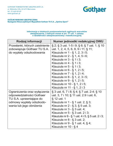 Gothaer Towarzystwo Ubezpieczeń S.A. ul. Wołoska 22A, 02-675 Warszawa tel. 22 469 69 69 www.gothaer.pl OGÓLNE WARUNKI UBEZPIECZENIA Następstw Nieszczęśliwych Wypadków Gothaer TU S.A. „Optima Sport” Informacja o istotnych postanowieniach ogólnych warunków ubezpieczenia, o których mowa w art. 17 ust. 1 ustawy o działalności ubezpieczeniowej i reasekuracyjnej Rodzaj informacji Numer jednostki redakcyjnej OWU Przesłanki, których zaistnienie § 2; § 3 ust. 1-5 i 9; § 6; § 7 ust. 1; § 10 zobowiązuje Gothaer TU S.A. ust. 1, 2, 4, 5, 6, 8, 9 i 11; § 11; do wypłaty odszkodowania Klauzula nr 1 - § 1, 2, 3 i 5; Klauzula nr 2 - § 1, 4, 5 i 6; Klauzula nr 3 - § 1 i 3; Klauzula nr 4 - § 1 i 3; Klauzula nr 5 - § 1 i 3; Klauzula nr 6 - § 1, 2 i 5; Klauzula nr 7 - § 1, 2 i 4; Klauzula nr 8 - § 1, 2, 3 i 5; Klauzula nr 9 - § 1, 2 i 5; Klauzula nr 10 - § 1, 2 i 5; Klauzula nr 11 - § 1, 2 i 3 Ograniczenia oraz wyłączenia § 3 ust. 6, 7 i 8; § 4; § 7 ust. 2-4; § 10 odpowiedzialności Gothaer ust. 3, 7 i 10; § 11 ust. 2.9 i ust. 6, § 12 ust. 1 TU S.A. uprawniające do Klauzula nr 1 - § 1 ust. 2, § 3; odmowy wypłaty odszkodowania lub jego obniżenia Klauzula nr 2 - § 3, § 5 ust. 3; Klauzula nr 3 - § 3 ust. 4; Klauzula nr 5 - § 3 ust. 2 i 3; Klauzula nr 6 - § 1 ust. 4 i 5, § 5 ust. 2 i 3; Klauzula nr 8 - § 3 ust. 2; Klauzula nr 9 - § 1 ust. 4, § 4; Klauzula nr 10 - § 4 Spis treści § 1 Postanowienia ogólne § 2 Definicje § 3 Przedmiot i zakres ubezpieczenia § 4 Wyłączenia odpowiedzialności Gothaer TU S.A. § 5 Umowa ubezpieczenia § 6 Początek i koniec odpowiedzialności Gothaer TU S.A. § 7 Suma ubezpieczenia § 8 Składka ubezpieczeniowa § 9 Odstąpienie i wypowiedzenie umowy ubezpieczenia § 10Obowiązki Ubezpieczającego i Ubezpieczonego oraz postępowanie w razie zajścia zdarzenia objętego ochroną ubezpieczeniową § 11 Ustalenie wysokości świadczenia § 12Wypłata świadczenia § 13Roszczenia regresowe § 14Reklamacje § 15Postanowienia końcowe KLAUZULE KLAUZULA NR 1 KLAUZULA NR 2 KLAUZULA NR 3 KLAUZULA NR 4 KLAUZULA NR 5 KLAUZULA NR 6 KLAUZULA NR 7 Strona 4 4 5 6 6 7 7 8 8 9 10 12 12 12 13 Koszty leczenia następstw nieszczęśliwych wypadków (KL) 14 Zasiłek dzienny z tytułu niezdolności do uprawiania sportu, do wykonywania pracy, do nauki lub pobytu w szpitalu (ZD) 15 Świadczenie z tytułu całkowitej niezdolności do uprawiania sportu (NS) 16 Świadczenie z tytułu pokrycia kosztów pogrzebu ubezpieczonego (KP) 17 Świadczenie z tytułu śmierci osób bliskich ubezpieczonego wskutek nieszczęśliwego wypadku (ŚOB) 17 Świadczenie z tytułu poważnego zachorowania lub operacji chirurgicznej (PZ) 18 Zadośćuczynienie za ból doznany wskutek wypadku (ZB) 19 KLAUZULA NR 8 KLAUZULA NR 9 KLAUZULA NR 10 KLAUZULA NR 11 Koszty poszukiwań i ratownictwa (KR) 20 Ubezpieczenie odpowiedzialności cywilnej (OC) 21 Ubezpieczenie odpowiedzialności cywilnej (OC) osoby fizycznej wykonującej zawód trenera lub instruktora sportowego 22 Usługi assistance 24 § 1 . Postanowienia ogólne 1. Na podstawie niniejszych Ogólnych Warunków Ubezpieczenia następstw nieszczęśliwych wypadków Gothaer TU S.A. OPTIMA SPORT, zwanych dalej OWU, Gothaer Towarzystwo Ubezpieczeń S.A., zwane dalej Gothaer TU S.A., zawiera umowy ubezpieczenia z osobami fizycznymi, osobami prawnymi lub innymi jednostkami organizacyjnymi nieposiadającymi osobowości prawnej. 2.Umowę ubezpieczenia można także zawrzeć na cudzy rachunek. Postanowienia OWU stosuje się wówczas odpowiednio również do osoby trzeciej, wymienionej w umowie ubezpieczenia, na rachunek której zawarto umowę ubezpieczenia. 3.Za porozumieniem stron, do umowy ubezpieczenia mogą być wprowadzone postanowienia dodatkowe lub odmienne od ustalonych w OWU, jednakże postanowienia te oraz wszelkie zmiany zawartej już umowy ubezpieczenia muszą być sporządzone na piśmie, pod rygorem nieważności. 4.Na podstawie OWU, Gothaer TU S.A. udziela ochrony ubezpieczeniowej osobom fizycznym w zakresie następstw nieszczęśliwych wypadków powstałych na terytorium Rzeczypospolitej Polskiej (RP) oraz pozostałych krajów świata, chyba że inaczej wynika z postanowień Klauzuli. § 2. Definicje Przez użyte w OWU pojęcia rozumie się: 1) amatorskie uprawianie sportu – forma aktywności fizycznej podejmowana przez ubezpieczonego dla wypoczynku i odnowy sił psychofizycznych, będąca jedną z form czynnego wypoczynku; 2)bójka – wzajemne starcie połączone z naruszeniem nietykalności cielesnej jej uczestników, którzy wspólnie wymieniają uderzenia, występując zarazem jako napastnicy oraz broniący się. Braniem udziału w bójce nie jest włączenie się do zajścia w celu przywrócenia porządku lub spokoju publicznego związane z wykonywaniem czynności służbowych oraz działanie w ramach obrony koniecznej; 3)choroba – reakcja organizmu na działanie czynnika chorobotwórczego objawiająca się zaburzeniami funkcji lub uszkodzeniem struktury organizmu, wywołująca niepożądane objawy, różniące się od czynników zdrowego organizmu; 4)choroba zawodowa – choroba wymieniona w wykazie chorób zawodowych, charakteryzująca się tym, że w wyniku oceny warunków pracy można stwierdzić bezspornie lub z dużym prawdopodobieństwem, że została spowodowana działaniem czynników szkodliwych dla zdrowia występujących w środowisku pracy albo w związku ze sposobem wykonywania pracy; 5)klauzula – dodatkowe postanowienia umowy ubezpieczenia, wprowadzone do niej na wniosek ubezpieczającego, powodujące, odpowiednio, rozszerzenie zakresu ochrony ubezpieczeniowej w zakresie następstw nieszczęśliwych wypadków lub uzupełnienie umowy ubezpieczenia o ubezpieczenie dodatkowe. Klauzula stanowi integralną część OWU; 6)leczenie usprawniające – terapia medyczna zalecona przez lekarza, mająca na celu przywrócenie możliwie najpełniejszej sprawności psychofizycznej układu kostno–mię