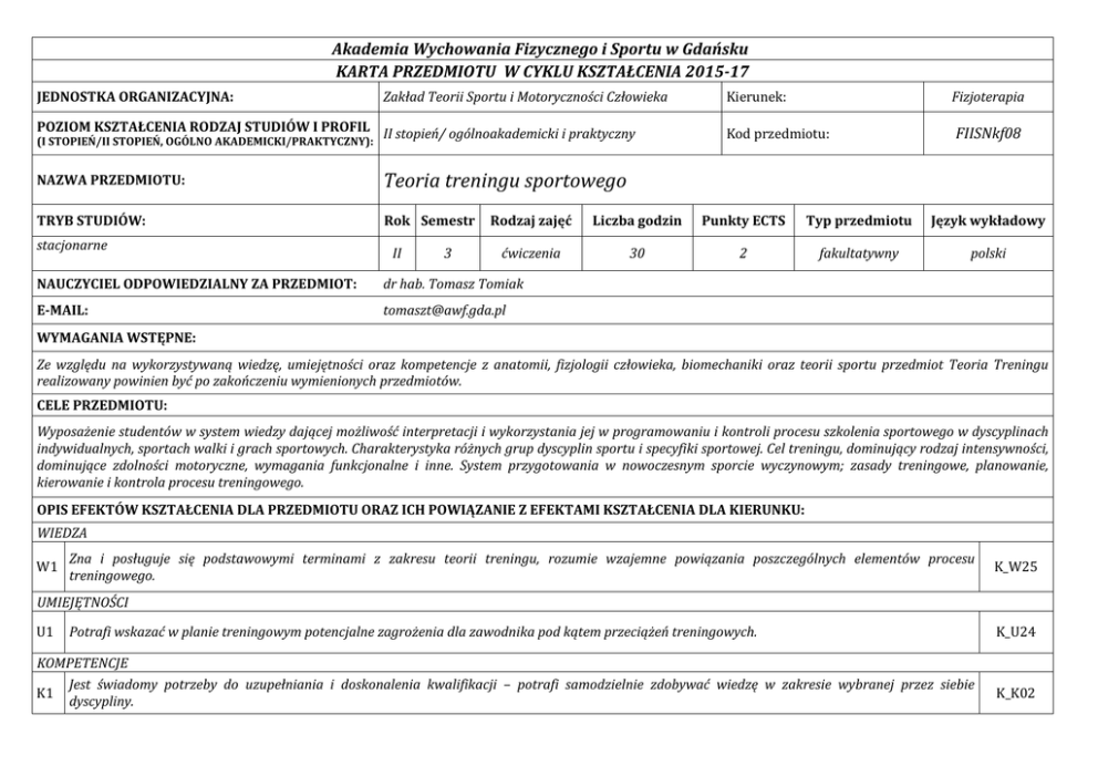 Akademia Wychowania Fizycznego i Sportu w Gdańsku KARTA PRZEDMIOTU W CYKLU KSZTAŁCENIA 2015-17 JEDNOSTKA ORGANIZACYJNA: Zakład Teorii Sportu i Motoryczności Człowieka POZIOM KSZTAŁCENIA RODZAJ STUDIÓW I PROFIL II stopień/ ogólnoakademicki i praktyczny (I STOPIEŃ/II STOPIEŃ, OGÓLNO AKADEMICKI/PRAKTYCZNY): NAZWA PRZEDMIOTU: Teoria treningu sportowego TRYB STUDIÓW: Rok Semestr stacjonarne II 3 Kierunek: Fizjoterapia Kod przedmiotu: FIISNkf08 Rodzaj zajęć Liczba godzin Punkty ECTS Typ przedmiotu Język wykładowy ćwiczenia 30 2 fakultatywny polski NAUCZYCIEL ODPOWIEDZIALNY ZA PRZEDMIOT: dr hab. Tomasz Tomiak E-MAIL: [email protected] WYMAGANIA WSTĘPNE: Ze względu na wykorzystywaną wiedzę, umiejętności oraz kompetencje z anatomii, fizjologii człowieka, biomechaniki oraz teorii sportu przedmiot Teoria Treningu realizowany powinien być po zakończeniu wymienionych przedmiotów. CELE PRZEDMIOTU: Wyposażenie studentów w system wiedzy dającej możliwość interpretacji i wykorzystania jej w programowaniu i kontroli procesu szkolenia sportowego w dyscyplinach indywidualnych, sportach walki i grach sportowych. Charakterystyka różnych grup dyscyplin sportu i specyfiki sportowej. Cel treningu, dominujący rodzaj intensywności, dominujące zdolności motoryczne, wymagania funkcjonalne i inne. System przygotowania w nowoczesnym sporcie wyczynowym; zasady treningowe, planowanie, kierowanie i kontrola procesu treningowego. OPIS EFEKTÓW KSZTAŁCENIA DLA PRZEDMIOTU ORAZ ICH POWIĄZANIE Z EFEKTAMI KSZTAŁCENIA DLA KIERUNKU: WIEDZA W1 Zna i posługuje się podstawowymi terminami z zakresu teorii treningu, rozumie wzajemne powiązania poszczególnych elementów procesu treningowego. K_W25 UMIEJĘTNOŚCI U1 Potrafi wskazać w planie treningowym potencjalne zagrożenia dla zawodnika pod kątem przeciążeń treningowych. KOMPETENCJE Jest świadomy potrzeby do uzupełniania i doskonalenia kwalifikacji – potrafi samodzielnie zdobywać wiedzę w zakresie wybranej przez siebie K1 dyscypliny. K_U24 K_K02 KRYTERIA I METODY OCENY OSIĄGNIĘTYCH EFEKTÓW KSZTAŁCENIA: Umiejętności i kompetencje nabywane w trakcie ćwiczeń i wykładów ocenione zostaną poprzez ocenę wykonania przez studenta planu treningowego w wybranej przez niego dyscyplinie lub konkurencji. Ocena dostateczna za umieszczenie w przygotowanym planie co najmniej 4 z siedmiu obowiązkowych elementów planu. Wiedza na bazie wyników sprawdzianu z terminologii stosowanej w teorii treningu sportowego. Trzy pytania, za każde można uzyskać 2 punkty. Ocena bdb – 6p punktów; db – 5 punktów; dost – 4 punkty. Aby uzyskać zaliczenie przedmiotu na ocenę dostateczną student musi osiągnąć wszystkie wymienione przedmiotowe efekty kształcenia METODY I FORMY REALIZACJI PRZEDMIOTU: Przedmiot realizowany jest w formie ćwiczeń. Ćwiczenia audytoryjne: dyskusja moderowana, analiza tekstów z dyskusją, zadania w grupach do realizacji. TREŚCI KSZTAŁCENIA: Ćwiczenia: Różnice pomiędzy rekreacją a treningiem, treningiem zdrowotnym a sportowym. Problemy natury etyczno filozoficznej współczesnego sportu. Charakterystyka wybranej przez studenta (kierunkowej) dyscypliny sportu – praca studyjna na podstawie doświadczeń własnych i danych z piśmiennictwa. Kontrola bieżąca, przykłady i konkretne rozwiązania w dyscyplinach. Kontrola operacyjna, przykłady i konkretne rozwiązania w dyscyplinach. Kontrola etapowa, przykłady i konkretne rozwiązania w dyscyplinach. Planowanie i analiza obciążeń treningowych. FORMA ZALICZENIA: Zaliczenie z oceną LITERATURA: 1. Bompa T. (1990), Teoria i metodyka treningu. RCMSKFiS. Warszawa. 2. Płatonow W.N. Sozański H. (1991), (red.) Optymalizacja struktury treningu sportowego. RCMSKFiS. Warszawa. 3. Naglak Z. (1991), Metodyka trenowania sportowca. AWF Wrocław. 4. Przybylski W. (1997) Kontrola treningu i obciążeń treningowych w piłce nożnej. AWF Gdańsk. 5. Raczek J. (1991), Podstawy szkolenia sportowego dzieci i młodzieży. Biblioteka Trenera. RCMSKFiS. Warszawa. 6. Sozański H., Zaporożanow W. (1993), Kierowanie jako czynnik optymalizacji treningu. RCMSKFiS. Warszawa. 7. Sozański H. (1993), Podstawy teorii treningu sportowego. RCMSKFiS. Warszawa. 8. Sozański H., Śledziewski D. (1995), Obciążenia treningowe dokumentowanie i opracowywanie danych. RCMSKFiS. Warszawa. 9. Sport Wyczynowy – miesięcznik. 10.Trenig – kwartalnik. Bilans punktów ECTS (1 pkt ECTS – 25-30 godz. pracy studenta): AKTYWNOŚĆ STUDENTA Udział w ćwiczeniach Przygotowanie się do ćwiczeń Całkowite obciążenie pracą studenta Punkty ECTS za przedmiot Obciążenie studenta 30 godz. 30 godz. 60 godz. 2 ECTS Opracował kartę przedmiotu: dr hab. Tomasz Tomiak