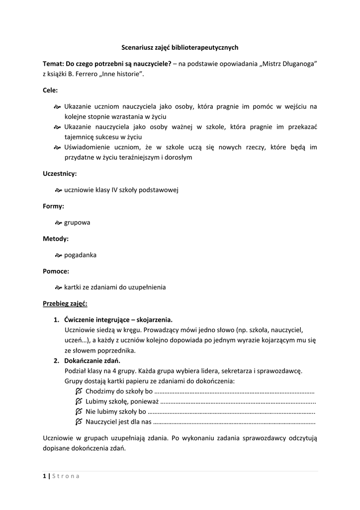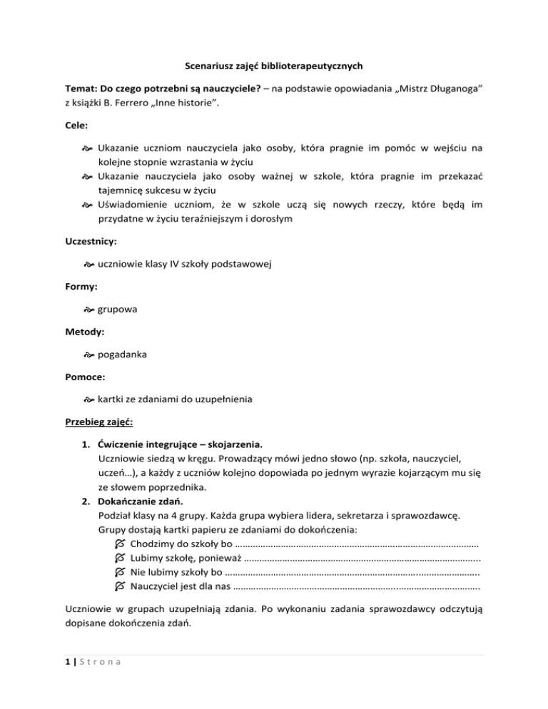 Scenariusz zajęć biblioterapeutycznych Temat: Do czego potrzebni są nauczyciele? – na podstawie opowiadania „Mistrz Długanoga” z książki B. Ferrero „Inne historie”. Cele: [ Ukazanie uczniom nauczyciela jako osoby, która pragnie im pomóc w wejściu na kolejne stopnie wzrastania w życiu [ Ukazanie nauczyciela jako osoby ważnej w szkole, która pragnie im przekazać tajemnicę sukcesu w życiu [ Uświadomienie uczniom, że w szkole uczą się nowych rzeczy, które będą im przydatne w życiu teraźniejszym i dorosłym Uczestnicy: [ uczniowie klasy IV szkoły podstawowej Formy: [ grupowa Metody: [ pogadanka Pomoce: [ kartki ze zdaniami do uzupełnienia Przebieg zajęć: 1. Ćwiczenie integrujące – skojarzenia. Uczniowie siedzą w kręgu. Prowadzący mówi jedno słowo (np. szkoła, nauczyciel, uczeń…), a każdy z uczniów kolejno dopowiada po jednym wyrazie kojarzącym mu się ze słowem poprzednika. 2. Dokańczanie zdań. Podział klasy na 4 grupy. Każda grupa wybiera lidera, sekretarza i sprawozdawcę. Grupy dostają kartki papieru ze zdaniami do dokończenia: ³ Chodzimy do szkoły bo …………………………………………………………………………………… ³ Lubimy szkołę, ponieważ ………………………………………………………………………………... ³ Nie lubimy szkoły bo …………………………………………………………………..………………….. ³ Nauczyciel jest dla nas ………………………………………………………..………………………….. Uczniowie w grupach uzupełniają zdania. Po wykonaniu zadania sprawozdawcy odczytują dopisane dokończenia zdań. 1 | S t r o n a 3. Odczytanie opowiadania „Mistrz Długanoga”: MISTRZ DŁUGANOGA W swym małym gospodarstwie pośród pól, biedny wieśniak skarżył się: „Również i w tym roku żyto, owies, jęczmień nie udały się i niewiele są warte! Na tym terenie .jedynie brzoskwinie rosłyby dobrze. Ale mogę ich szukać .jedynie w Innym Kraju. Kraj ten leży jednak zbyt daleko a nie mam sił ani czasu". Słysząc te narzekania jego syn Sandrino powiedział zdecydowanie: ‐ Mogę pójść tam ja i moja siostra Loretta. Jesteśmy już dorośli i pragniemy zobaczyć Inny Kraj! Rodzice westchnęli ciężko. Bali się pozwolić na wyprawę do tak odległego kraju. Ale w końcu zgodzili się. Kupili dzieciom mocne buty i napełnili ich plecaki żywnością. Dzieci wyruszyły z ochotą. Wędrowały, wędrowały, wreszcie znalazły się na skraju Wielkiego Bagna. Dwa szczudła Zbliżyła się do nich czapla o długich nogach i powiedziała: ‐ Jestem Mistrzem Długanoga, panem Bagna. Kim wy jesteście i czego szukacie? ‐ Jesteśmy rodzeństwem i chcemy przejść przez Bagno. ‐ Niemożliwe ‐ stwierdziła czapla ‐ aby przejść potrzebne są długie nogi, takie jak moje, by nie ugrzęznąć w błocie aż po szyję. ‐ Spróbuję jednak ‐ powiedział Sandrino i wysunął się naprzód. Natychmiast zaczął topić się w błocie. ‐ Ratuj mnie Loretto! Dziewczynka wyciągnęła rękę i ciągnąc z całych sił pomogła bratu wyjść na brzeg. ‐ Hm ‐ burknęła czapla ‐ znalazłby się sposób. Usiądźcie i posłuchajcie mnie. Możecie zbudować sobie szczudła z długich gałęzi, będziecie mieli w ten sposób nogi drewniane, które pomogą wam przejść przez Bagno. Dzieci znalazły cztery długie gałęzie i czapla pokazała im jak zrobić mocne szczudła. Gdy je skończyli, Sandrino i Loretta założyli drewniane szczudła, podziękowali czapli i przeszli przez Bagno. Mistrz Czteryręce ‐ Uf! Udało się nam! ‐ westchnął Sandrino, gdy przeszli przez Wielkie Bagno. Loretta wędrowała jednak zatroskana. ‐ Spójrz na tę ścianę skał przed nami. Jest wysoka jak wieża i nie widać jej końca! ‐ Spróbujmy! ‐ powiedział Sandrino i zaczął wspinać się, ale zaraz ześliznął się na ziemię. ‐ Co zrobimy? ‐ zapytała Loretta. 2 | S t r o n a Jakaś małpka zbliżyła się do nich i powiedziała: ‐ Jestem mistrzem Czteryręce. Kim jesteście i czego chcecie? ‐ Jesteśmy dwojgiem dzieci i chcemy wspiąć się na Skałę ‐ odpowiedzieli. ‐ Niemożliwe! ‐ powiedziała małpka. ‐ Aby wejść na wielką Skałę, trzeba być tak zwinnym jak ja. Ale jest pewien sposób. Z waszych szczudeł i z małej ilości drewna można zrobić drabinę. Gdy drabina była gotowa, dzieci podziękowały małpce i z łatwością weszły na szczyt Skały, zeszły z niej po drugiej stronie i na nowo podjęły wędrówkę. Szybko posuwały się naprzód, aż dotarły na brzeg wielkiego jeziora. Mistrz Pomyślnywiatr Sandrino wykrzyknął: ‐ Popatrz, tam widać Inny Kraj, tam rosną brzoskwinie! Loretta westchnęła: ‐ Możliwe, ale czy nie widzisz, jak szerokie jest jezioro? Nie dostaniemy się nigdy na drugi brzeg! ‐ Spróbujmy przepłynąć! ‐ powiedział Sandrino i wskoczył do wody. Ale woda była lodowata. ‐ Brr‐jęknął Sandrino. W tym momencie wielka kaczka płynąc po wodzie zbliżyła się do nich i powiedziała: ‐ Jestem Mistrzem Pomyślnymwiatrem. Kim wy jesteście i czego chcecie? ‐ Jesteśmy dziećmi i chcemy przepłynąć jezioro. Kaczka stwierdziła: ‐ Niemożliwe! Nie możecie przepłynąć. Woda jest zbyt zimna a jezioro szerokie. Ale jest pewien sposób. Usiądźcie i posłuchajcie. Możecie unosić się na wodzie tak jak ja, jeżeli zbudujecie sobie łódkę i wiosła z tej drabiny i odrobiny drewna. Wówczas przepłyniecie jezioro. Sandrino i Loretta pracowali z zapałem pod kierunkiem kaczki i wkrótce łódka została ukończona.Dzieci podziękowały i energicznie wiosłując dotarły na drugi brzeg. Inny Kraj był bardzo piękny, pełen niebieskich pagórków i kwitnących drzewek brzoskwiniowych. Właśnie, gdy Sandrino i Loretta wyskakiwali z łodzi, przechodził tam syn króla. ‐ Och, co za piękna łódka! ‐ zawołał książę. – Podo