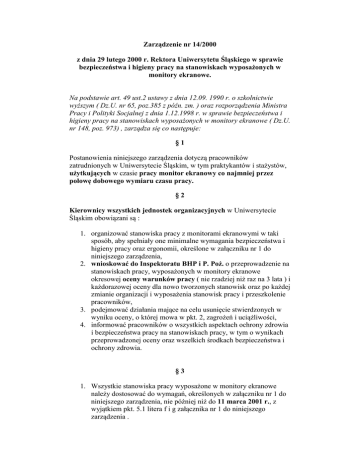 Zarządzenie nr 14/2000 z dnia 29 lutego 2000 r. Rektora Uniwersytetu Śląskiego w sprawie bezpieczeństwa i higieny pracy na stanowiskach wyposażonych w monitory ekranowe. Na podstawie art. 49 ust.2 ustawy z dnia 12.09. 1990 r. o szkolnictwie wyższym ( Dz.U. nr 65, poz.385 z późn. zm. ) oraz rozporządzenia Ministra Pracy i Polityki Socjalnej z dnia 1.12.1998 r. w sprawie bezpieczeństwa i higieny pracy na stanowiskach wyposażonych w monitory ekranowe ( Dz.U. nr 148, poz. 973) , zarządza się co następuje: §1 Postanowienia niniejszego zarządzenia dotyczą pracowników zatrudnionych w Uniwersytecie Śląskim, w tym praktykantów i stażystów, użytkujących w czasie pracy monitor ekranowy co najmniej przez połowę dobowego wymiaru czasu pracy. §2 Kierownicy wszystkich jednostek organizacyjnych w Uniwersytecie Śląskim obowiązani są : 1. organizować stanowiska pracy z monitorami ekranowymi w taki sposób, aby spełniały one minimalne wymagania bezpieczeństwa i higieny pracy oraz ergonomii, określone w załączniku nr 1 do niniejszego zarządzenia, 2. wnioskować do Inspektoratu BHP i P. Poż. o przeprowadzenie na stanowiskach pracy, wyposażonych w monitory ekranowe okresowej oceny warunków pracy ( nie rzadziej niż raz na 3 lata ) i każdorazowej oceny dla nowo tworzonych stanowisk oraz po każdej zmianie organizacji i wyposażenia stanowisk pracy i przeszkolenie pracowników, 3. podejmować działania mające na celu usunięcie stwierdzonych w wyniku oceny, o której mowa w pkt. 2, zagrożeń i uciążliwości, 4. informować pracowników o wszystkich aspektach ochrony zdrowia i bezpieczeństwa pracy na stanowiskach pracy, w tym o wynikach przeprowadzonej oceny oraz wszelkich środkach bezpieczeństwa i ochrony zdrowia. §3 1. Wszystkie stanowiska pracy wyposażone w monitory ekranowe należy dostosować do wymagań, określonych w załączniku nr 1 do niniejszego zarządzenia, nie później niż do 11 marca 2001 r., z wyjątkiem pkt. 5.1 litera f i g załącznika nr 1 do niniejszego zarządzenia . 2. Nowe stanowiska pracy wyposażone w monitory ekranowe należy organizować z zachowaniem wszystkich wymagań bezpieczeństwa i higieny pracy, zawartych w załączniku nr 1 do niniejszego zarządzenia. §4 Pracownikom, o których mowa w § 1 należy zapewnić : a) łączenie przemienne pracy związanej z obsługą monitora ekranowego z innymi rodzajami prac nie obciążających wzroku lub co najmniej 5 minutową przerwę, po każdej godzinie pracy przy obsłudze monitora wliczoną do czasu pracy, b) zwrot kosztów, w zakresie podstawowego standardu, okularów korygujących wzrok, w przypadku gdy wynik badania okulistycznego, przeprowadzonego w ramach profilaktycznej opieki zdrowotnej, wykaże potrzebę ich stosowania podczas pracy przy obsłudze monitora ekranowego. §5 1. Prorektor ds. Studenckich i Finansowych w porozumieniu z Komisją Bezpieczeństwa i Higieny Pracy w Uniwersytecie Śląskim ustala corocznie, kwotę refundowania przez Uniwersytet, w zakresie podstawowego standardu, zakupu przez pracownika okularów korygujących ( a dofinansowania w przypadku zakupu okularów w cenie powyżej podstawowego standardu), na podstawie analizy średniego kosztu zakupu okularów w specjalistycznych punktach usługowych. 2. W przypadku, gdy rzeczywisty koszt zakupu okularów będzie wyższy od ustalonego, różnicę pokrywa pracownik. §6 1. Koszty zakupu okularów korygujących wzrok obciążają daną jednostkę organizacyjną, na podstawie przedłożonego przez pracownika zaświadczenia od lekarza okulisty, stanowiącego załącznik nr 2 do niniejszego zarządzenia oraz faktury VAT . 2. Obsługę medyczną w zakresie profilaktycznych badań okresowych dla pracowników Uniwersytetu Śląskiego prowadzą: Samodzielny Publiczny Zakład Opieki Zdrowotnej w Katowicach, ul. Szkolna 7 i Poliklinika dr Bessera w Sosnowcu, ul. Sucha 7a - dla pracowników zatrudnionych w Katowicach, Sosnowcu, Jastrzębiu Zdroju i Chorzowie, a dla pracowników zatrudnionych w filii UŚl. w Cieszynie - Służba Medycyny Pracy, ul. Bielska 37, Cieszyn. 3. . Faktura VAT winna być wystawiona na: "Uniwersytet Śląski, ul. Bankowa 12, 40-007 Katowice, NIP 634- 019-71-34 ". 4. Faktura winna być na odwrocie opisana przez pracownika w następujący sposób: " Refundowanie / dofinansowanie do okularów korekcyjnych w kwocie........."i parafowana przez kierownika jednostki, w której pracownik jest zatrudniony. 5. Przed oddaniem faktury VAT wraz z zaświadczeniem , do rozliczenia w Dziale Finansowym, należy ją zarejestrować w "Rejestrze udzielania zamówień publicznych" prowadzonym dla danej jednostki oraz komórce administracyjno - gospodarczej prowadzącej dla pracowników kartoteki osobistego wyposażenia pracownika. 6. Działy administracyjno - gospodarcze prowadzące "Kartoteki osobistego wyposażenia pracownika" obowiązane są odnotować fakt zakupu okularów korygujących wzrok przez pracownika w tej kartotece. §7 Główny Informatyk Uczelni oraz Dział Aparatury i Zaopatrzenia zobowiązane są przy sporządzaniu specyfikacji zakupu sprzętu komputerowego i wyposażenia stanowisk pracy z monitorami ekranowymi, uwzględniać minimalne wymagania bezpieczeństwa i higieny pracy oraz ergonomii, jakie powinny spełniać stanowiska pracy wyposażone w monitory ekranowe, o których mowa w załączniku nr 1 do niniejszego zarządzenia. §8 Zarządzenie wchodzi w życie z dniem podpisania . Rektor Prof. dr hab. Tadeusz Sławek