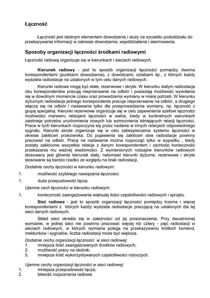 Łączność Łączność jest istotnym elementem dowodzenia i służy na szczeblu pododdziału do przekazywania informacji w zakresie dowodzenia, współdziałania i alarmowania. Sposoby organizacji łączności środkami radiowymi Łączność radiową organizuje się w kierunkach i sieciach radiowych. Kierunek radiowy - jest to sposób organizacji łączności pomiędzy dwoma korespondentami (punktami dowodzenia), z dowódcami, sztabami itp., z których każdy wydziela radiostacje na ustalonych w tym celu danych radiowych. Kierunki radiowe mogą być stałe, rezerwowe i skryte. W kierunku stałym radiostacje obu korespondentów pracują nieprzerwanie na odbiór i posiadają możliwość wywołania się w dowolnym momencie czasu oraz prowadzenia wymiany w miarę potrzeb. W kierunku dyżurnym radiostacja jednego korespondenta pracuje nieprzerwanie na odbiór, a drugiego włącza się na odbiór i nadawanie tylko dla przeprowadzenia wymiany, np. łączność z grupą specjalną. Kierunki rezerwowe organizuje się w celu zapewnienia szefowi łączności możliwości manewru relacjami łączności w walce, kiedy w konkretnych warunkach zaistnieje potrzeba uruchomienia nowych lub wzmocnienia istniejących relacji łączności. Prace w tych kierunkach rozpoczyna się przez nadanie w innych relacjach odpowiedniego sygnału. Kierunki skryte organizuje się w celu zabezpieczenia systemu łączności w okresie zakłóceń przeciwnika. Do pojawienia się zakłóceń obie radiostacje powinny pracować na odbiór. Pracę na nadawanie można rozpocząć tylko w wypadku , kiedy zostały zakłócone wszystkie relacje z danym korespondentem i zachodzi konieczność przekazania mu ważnej wiadomości. Z wymienionych rodzajów kierunków radiowych stosowany jest głównie kierunek stały, natomiast kierunki dyżurne, rezerwowe i skryte stosowane są bardzo rzadko ze względu na brak radiostacji. Dodatnie cechy łączności w kierunku radiowym: 1. możliwość szybkiego nawiązania łączności; 1. duża przepustowość łącza. Ujemne cech łączności w kierunku radiowym: 1. konieczność zaangażowania większej ilości częstotliwości radiowych i sprzętu. Sieć radiowa - jest to sposób organizacji łączności pomiędzy trzema i więcej korespondentami z których każdy wydziela radiostacje pracującą na ustalonych dla tej sieci danych radiowych. Skład sieci określa się w zależności od jej przeznaczenia. Przy dwustronnej wymianie, w jednej sieci nie powinno pracować więcej niż cztery - pięć radiostacji w sieciach radiowych, w których wymiana polega na przekazywaniu krótkich komend, meldunków i sygnałów, liczba radiostacji może być większa. Dodatnie cechy organizacji łączności w sieci radiowej: 1. mniejsza ilość zaangażowanych środków radiowych; 2. możliwość pracy na okólnik; 3. mniejsza ilość wykorzystywanych częstotliwości roboczych. 1. 2. Ujemne cechy organizacji łączności w sieci radiowej: mniejsza przepustowość łącza; łatwość rozpoznania radiowe. W każdej sieci i w każdym kierunku radiowym wyznacza się zawsze radiostację główną, którą w łączności dowodzenia jest z reguły radiostacja przełożonego (dowódcy, sztabu), a w kierunkach i sieciach współdziałania wyznacza sztab organizujący współdziałanie. W celu zapewnienia łączności dowodzenia, współdziałania oraz przekazywania sygnałów alarmowania w kompanii stosuje się środki radiowe i sygnalizacyjne. Decydujące znaczenie we wszystkich rodzajach działań bojowych mają środki radiowe, ponieważ tylko dzięki nim można zapewnić ciągłą łączność w ruchu, na postoju, w każdych warunkach terenowych i atmosferycznych. Łączność dowodzenia Na szczeblu pododdziału zmechanizowanego (do kompanii włącznie) kierowanie łącznością leży w obowiązkach dowódcy kompanii. Do realizacji dowodzenia podległymi plutonami dowódca kompanii wykorzystuje radiostacje pokładowe UKF i radiostacje kompanijne UKF. W kompanii organizuje się dwie sieci radiowe dowódcy kompanii: 1. Sieć radiowa na radiostacjach pokładowych UKF (R-123) dowódcy kompanii w wypadku działania kompanii na bojowych wozach piechoty w składzie: 1. dowódca kompanii (radiostacja główna); 2. dowódcy plutonów; 3. dowódcy drużyn (radiostacje dowódców drużyn pracują „na nasłuch”). 4. Sieć radiowa na radiostacjach kompanijnych UKF (K) w wypadku spieszenia kompanii w składzie: 1. dowódca kompanii (radiostacja główna); 2. dowódcy plutonów; 3. pomocnicy dowódców plutonów (okresowo według potrzeb). Dowódca kompanii utrzymuje łączność radiową z dowódcami plutonów za pomocą radiostacji pokładowych UKF z wozu dowódczego BWP-1K oraz wozów bojowych BWP w S/R dowódcy kompanii. W wypadku spieszenia kompanii jej dowódca utrzymuje łączność z dowódcami plutonów za pomocą radiostacji kompanijnych UKF w S/R dowódcy kompanii na okres spieszania. W skład tej sieci wchodzą okresowo według potrzeb dla utrzymania współdziałania środków ogniowych ze spieszoną piechotą – radiostacje pokładowe UKF wozów bojowych, którymi dowodzą pomocnicy dowódców plutonów po ich uprzednim przestrojeniu na częstotliwość S/R dowódcy kompanii na okres spieszenia. Jeżeli możliwości techniczne (zbieżność zakresów częstotliwości, dogodność przejścia na inne częstotliwości) pozwolą, zakłada się możliwość „wejścia” dowódcy plutonu do S/R dowódcy kompanii w celu wywołania „ognia” wozów bojowych swojego plutonu. Łączność współdziałania Łączność współdziałania między plutonami zapewnia się w S/R dowódcy kompanii za zezwoleniem radiostacji głównej. Pododdziały wzmocnienia kompanii włącza się do sieci radiowej dowódcy kompanii np. dowódca plutonu czołgów pracuje w sieci radiowej dowódcy kompanii. Łączność alarmowania Na potrzeby alarmowania wykorzystuje się wszystkie relacje łączność dowodzenia, współdziałania prz