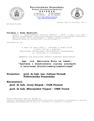 POLITECHNIKA POZNAŃSKA WYDZIAŁ TECHNOLOGII CHEMICZNEJ D Z I E K A N ul. Piotrowo 3 tel. 061 6652351 60-965 POZNAŃ fax 061 6652852 E-mail: [email protected] http://www.fct.put.poznan.pl Poznań, dnia 24 kwietnia 2012 r. DC-0010/5/2012 Dziekan i Rada Wydziału zgodnie z Rozporządzeniem Ministra Edukacji i Nauki z dnia 15.12.2005 w sprawie szczegółowego trybu przeprowadzania czynności w przewodach doktorskim i habilitacyjnym oraz w postępowaniu o nadanie tytułu profesora (Dziennik Ustaw nr 252 poz.2125 z dn.22.12.2005 r.) zawiadamiają, że: w dniu 29 maja 2012 r. (wtorek) o godz.12:00 w sali 123 na I piętrze Biblioteki Technicznej Politechniki Poznańskiej, ul. Piotrowo 2 w Poznaniu. odbędzie się publiczna obrona rozprawy doktorskiej mgr inż. Mariusza Kota na temat: "Synteza i właściwości cieczy jonowych z kationem dialkilometyloamoniowym" Promotor: prof. dr hab. inż. Juliusz Pernak Politechnika Poznańska Recenzenci: prof. dr hab. Jerzy Siepak – UAM Poznań prof. dr hab. Mieczysław Trypuć – UMK Toruń Praca doktorska jest do wglądu w: Czytelni Informacyjno-Bibliograficznej Biblioteki Politechniki Poznańskiej w Centrum Wykładowo-Konferencyjnym PP przy ul. Piotrowo 2 (I piętro) w Poznaniu