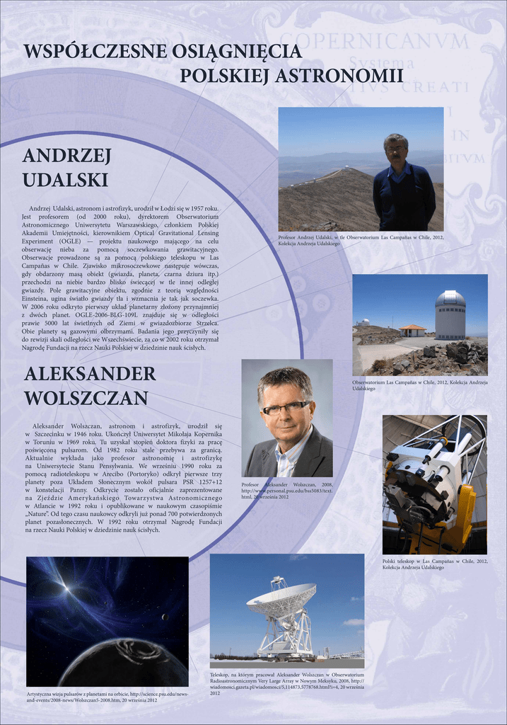 WSPÓŁCZESNE OSIĄGNIĘCIA POLSKIEJ ASTRONOMII ANDRZEJ UDALSKI Andrzej Udalski, astronom i astrofizyk, urodził w Łodzi się w 1957 roku. Jest profesorem (od 2000 roku), dyrektorem Obserwatorium Astronomicznego Uniwersytetu Warszawskiego, członkiem Polskiej Akademii Umiejętności, kierownikiem Optical Gravitational Lensing Experiment (OGLE) — projektu naukowego mającego na celu obserwację nieba za pomocą soczewkowania grawitacyjnego. Obserwacje prowadzone są za pomocą polskiego teleskopu w Las Campañas w Chile. Zjawisko mikrosoczewkowe następuje wówczas, gdy obdarzony masą obiekt (gwiazda, planeta, czarna dziura itp.) przechodzi na niebie bardzo blisko świecącej w tle innej odległej gwiazdy. Pole grawitacyjne obiektu, zgodnie z teorią względności Einsteina, ugina światło gwiazdy tła i wzmacnia je tak jak soczewka. W 2006 roku odkryto pierwszy układ planetarny złożony przynajmniej z dwóch planet. OGLE-2006-BLG-109L znajduje się w odległości prawie 5000 lat świetlnych od Ziemi w gwiazdozbiorze Strzelca. Obie planety są gazowymi olbrzymami. Badania jego przyczyniły się do rewizji skali odległości we Wszechświecie, za co w 2002 roku otrzymał Nagrodę Fundacji na rzecz Nauki Polskiej w dziedzinie nauk ścisłych. Profesor Andrzej Udalski, w tle Obserwatorium Las Campañas w Chile, 2012, Kolekcja Andrzeja Udalskiego ALEKSANDER WOLSZCZAN Obserwatorium Las Campañas w Chile, 2012, Kolekcja Andrzeja Udalskiego Aleksander Wolszczan, astronom i astrofizyk, urodził się w Szczecinku w 1946 roku. Ukończył Uniwersytet Mikołaja Kopernika w Toruniu w 1969 roku. Tu uzyskał stopień doktora fizyki za pracę poświęconą pulsarom. Od 1982 roku stale przebywa za granicą. Aktualnie wykłada jako profesor astronomię i astrofizykę na Uniwersytecie Stanu Pensylwania. We wrześniu 1990 roku za pomocą radioteleskopu w Arecibo (Portoryko) odkrył pierwsze trzy planety poza Układem Słonecznym wokół pulsara PSR 1257+12 w konstelacji Panny. Odkrycie zostało oficjalnie zaprezentowane na Zjeździe Amerykańskiego Towarzystwa Astronomicznego w Atlancie w 1992 roku i opublikowane w naukowym czasopiśmie „Nature”. Od tego czasu naukowcy odkryli już ponad 700 potwierdzonych planet pozasłonecznych. W 1992 roku otrzymał Nagrodę Fundacji na rzecz Nauki Polskiej w dziedzinie nauk ścisłych. Profesor Aleksander Wolszczan, 2008, http://www.personal.psu.edu/bss5083/text. html, 20 września 2012 Polski teleskop w Las Campañas w Chile, 2012, Kolekcja Andrzeja Udalskiego Artystyczna wizja pulsarów z planetami na orbicie, http://science.psu.edu/newsand-events/2008-news/Wolszczan5-2008.htm, 20 września 2012 Teleskop, na którym pracował Aleksander Wolszczan w Obserwatorium Radioastronomicznym Very Large Array w Nowym Meksyku, 2008, http:// wiadomosci.gazeta.pl/wiadomosci/5,114873,5778768.html?i=4, 20 września 2012