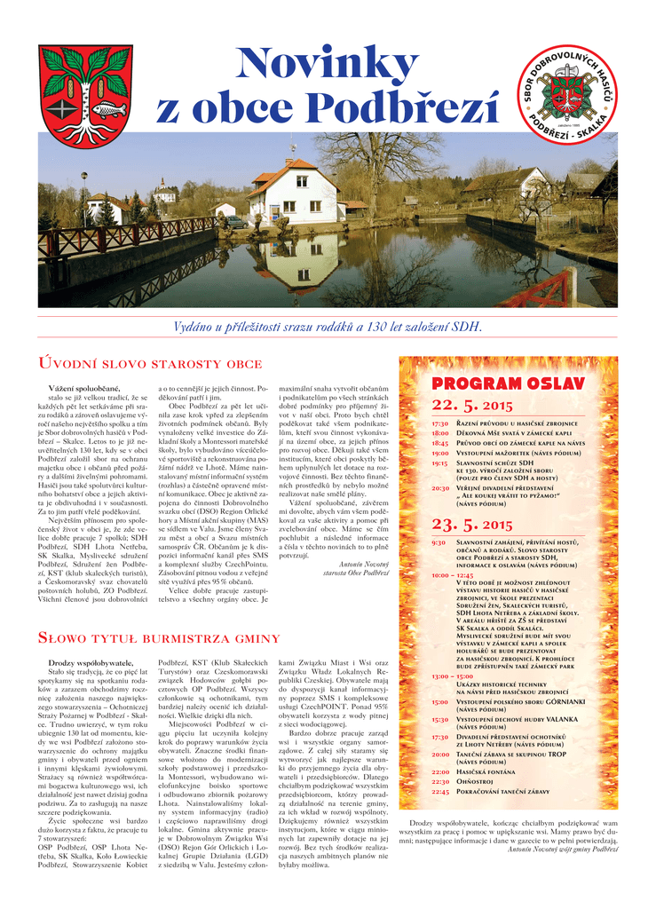 Novinky z obce Podbřezí Vydáno u příležitosti srazu rodáků a 130 let založení SDH. Ú VODNÍ SLOVO STAROSTY OBCE Vážení spoluobčané, stalo se již velkou tradicí, že se každých pět let setkáváme při srazu rodáků a zároveň oslavujeme výročí našeho největšího spolku a tím je Sbor dobrovolných hasičů v Podbřezí – Skalce. Letos to je již neuvěřitelných 130 let, kdy se v obci Podbřezí založil sbor na ochranu majetku obce i občanů před požáry a dalšími živelnými pohromami. Hasiči jsou také spolutvůrci kulturního bohatství obce a jejich aktivita je obdivuhodná i v současnosti. Za to jim patří vřelé poděkování. Největším přínosem pro společenský život v obci je, že zde velice dobře pracuje 7 spolků; SDH Podbřezí, SDH Lhota Netřeba, SK Skalka, Myslivecké sdružení Podbřezí, Sdružení žen Podbřezí, KST (klub skaleckých turistů), a Českomoravský svaz chovatelů poštovních holubů, ZO Podbřezí. Všichni členové jsou dobrovolníci S ŁOWO a o to cennější je jejich činnost. Poděkování patří i jim. Obec Podbřezí za pět let učinila zase krok vpřed za zlepšením životních podmínek občanů. Byly vynaloženy velké investice do Základní školy a Montessori mateřské školy, bylo vybudováno víceúčelové sportoviště a rekonstruována požární nádrž ve Lhotě. Máme nainstalovaný místní informační systém (rozhlas) a částečně opravené místní komunikace. Obec je aktivně zapojena do činnosti Dobrovolného svazku obcí (DSO) Region Orlické hory a Místní akční skupiny (MAS) se sídlem ve Valu. Jsme členy Svazu měst a obcí a Svazu místních samospráv ČR. Občanům je k dispozici informační kanál přes SMS a komplexní služby CzechPointu. Zásobování pitnou vodou z veřejné sítě využívá přes 95 % občanů. Velice dobře pracuje zastupitelstvo a všechny orgány obce. Je maximální snaha vytvořit občanům i podnikatelům po všech stránkách dobré podmínky pro příjemný život v naší obci. Proto bych chtěl poděkovat také všem podnikatelům, kteří svou činnost vykonávají na území obce, za jejich přínos pro rozvoj obce. Děkuji také všem institucím, které obci poskytly během uplynulých let dotace na rozvojové činnosti. Bez těchto finančních prostředků by nebylo možné realizovat naše smělé plány. Vážení spoluobčané, závěrem mi dovolte, abych vám všem poděkoval za vaše aktivity a pomoc při zvelebování obce. Máme se čím pochlubit a následné informace a čísla v těchto novinách to to plně potvrzují. Antonín Novotný starosta Obce Podbřezí TYTUŁ BURMISTRZA GMINY Drodzy współobywatele, Stało się tradycją, że co pięć lat spotykamy się na spotkaniu rodaków a zarazem obchodzimy rocznicę założenia naszego największego stowarzyszenia – Ochotniczej Straży Pożarnej w Podbřezí - Skałce. Trudno uwierzyć, w tym roku ubiegnie 130 lat od momentu, kiedy we wsi Podbřezí założono stowarzyszenie do ochrony majątku gminy i obywateli przed ogniem i innymi klęskami żywiołowymi. Strażacy są również współtwórcami bogactwa kulturowego wsi, ich działalność jest nawet dzisiaj godna podziwu. Za to zasługują na nasze szczere podziękowania. Życie społeczne wsi bardzo dużo korzysta z faktu, że pracuje tu 7 stowarzyszeń: OSP Podbřezí, OSP Lhota Netřeba, SK Skałka, Koło Łowieckie Podbřezí, Stowarzyszenie Kobiet Podbřezí, KST (Klub Skałeckich Turystów) oraz Czeskomorawski związek Hodowców gołębi pocztowych OP Podbřezí. Wszyscy członkowie są ochotnikami, tym bardziej należy ocenić ich działalności. Wielkie dzięki dla nich. Miejscowości Podbřezí w ciągu pięciu lat uczyniła kolejny krok do poprawy warunków życia obywateli. Znaczne środki finansowe włożono do modernizacji szkoły podstawowej i przedszkola Montessori, wybudowano wielofunkcyjne boisko sportowe i odbudowano zbiornik pożarowy Lhota. Nainstalowaliśmy lokalny system informacyjny (radio) i częściowo naprawiliśmy drogi lokalne. Gmina aktywnie pracuje w Dobrowolnym Związku Wsi (DSO) Rejon Gór Orlickich i Lokalnej Grupie Działania (LGD) z siedzibą w Valu. Jesteśmy człon- kami Związku Miast i Wsi oraz Związku Władz Lokalnych Republiki Czeskiej. Obywatele mają do dyspozycji kanał informacyjny poprzez SMS i kompleksowe usługi CzechPOINT. Ponad 95% obywateli korzysta z wody pitnej z sieci wodociągowej. Bardzo dobrze pracuje zarząd wsi i wszystkie organy samorządowe. Z całej siły staramy się wytworzyć jak najlepsze warunki do przyjemnego życia dla obywateli i przedsiębiorców. Dlatego chciałbym podziękować wszystkim przedsiębiorcom, którzy prowadzą działalność na terenie gminy, za ich wkład w rozwój wspólnoty. Dziękujemy również wszystkim instytucjom, które w ciągu minionych lat zapewniły dotacje na jej rozwój. Bez tych środków realizacja naszych ambitnych planów nie byłaby możliwa. PROGRAM OSLAV 22. 5. 2015 17:30 18:00 18:45 19:00 19:15 20:30 Řazení průvodu u hasičské zbrojnice Děkovná Mše svatá v zámecké kapli Průvod obcí od zámecké kaple na náves Vystoupení mažoretek (náves pódium) Slavnostní schůze SDH ke 130. výročí založení sboru (pouze pro členy SDH a hosty) Veřejné divadelní představení „ Ale koukej vrátit to pyžamo!“ (náves pódium) 23. 5. 2015 9:30 Slavnostní zahájení, přivítání hostů, občanů a rodáků. Slovo starosty obce Podbřezí a starosty SDH, informace k oslavám (náves pódium) 10:00 – 12:45 V této době je možnost zhlédnout výstavu historie hasičů v hasičské zbrojnici, ve škole prezentaci Sdružení žen, Skaleckých turistů, SDH Lhota Netřeba a základní školy. V areálu hřiště za ZŠ se představí SK Skalka a oddíl Skaláci. Myslivecké sdružení bude mít svou výstavku v zámecké kapli a spolek holubářů se bude prezentovat za hasičskou 