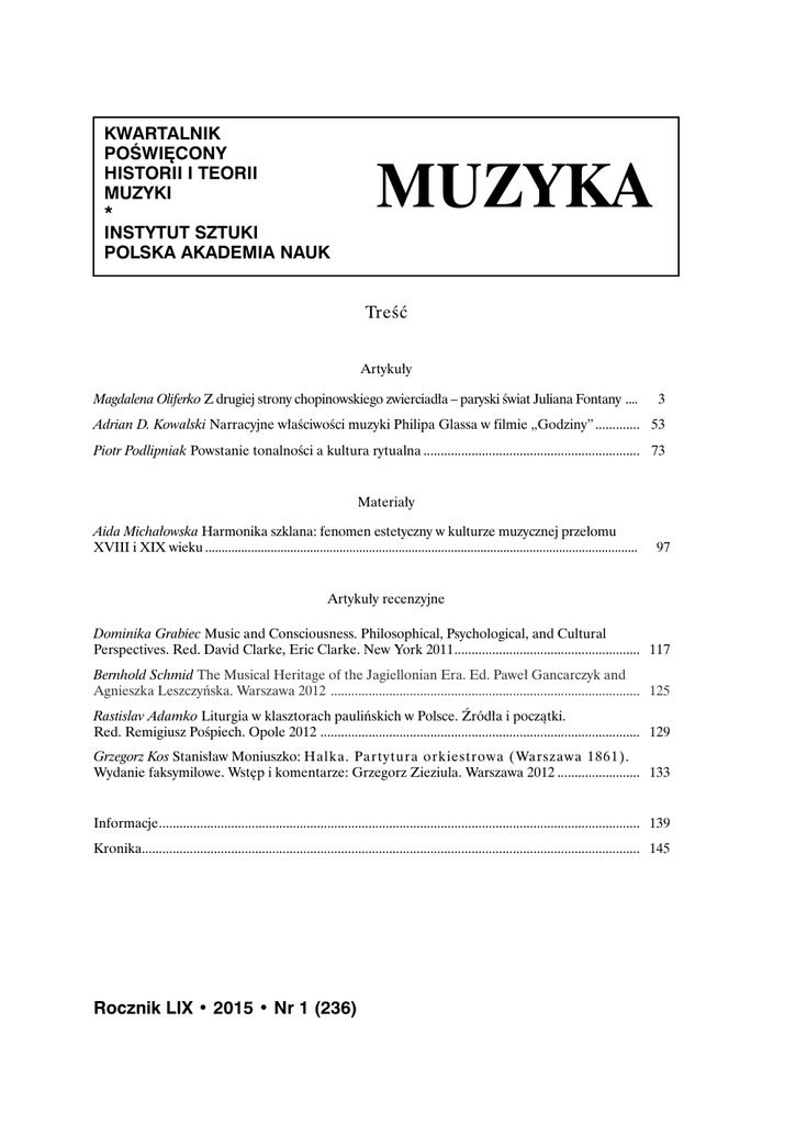 KWARTALNIK POŚWIĘCONY HISTORII I TEORII MUZYKI * INSTYTUT SZTUKI POLSKA AKADEMIA NAUK MUZYKA Treść Artykuły Magdalena Oliferko Z drugiej strony chopinowskiego zwierciadła – paryski świat Juliana Fontany ..... 3 Adrian D. Kowalski Narracyjne właściwości muzyki Philipa Glassa w filmie „Godziny”.............. 53 Piotr Podlipniak Powstanie tonalności a kultura rytualna................................................................ 73 Materiały Aida Michałowska Harmonika szklana: fenomen estetyczny w kulturze muzycznej przełomu XVIII i XIX wieku..................................................................................................................................... 97 Artykuły recenzyjne Dominika Grabiec Music and Consciousness. Philosophical, Psychological, and Cultural Perspectives. Red. David Clarke, Eric Clarke. New York 2011....................................................... 117 Bernhold Schmid The Musical Heritage of the Jagiellonian Era. Ed. Paweł Gancarczyk and Agnieszka Leszczyńska. Warszawa 2012 . ......................................................................................... 125 Rastislav Adamko Liturgia w klasztorach paulińskich w Polsce. Źródła i początki. Red. Remigiusz Pośpiech. Opole 2012 . ............................................................................................ 129 Grzegorz Kos Stanisław Moniuszko: Halka. Partytura orkiestrowa (Warszawa 1861). Wydanie faksymilowe. Wstęp i komentarze: Grzegorz Zieziula. Warszawa 2012......................... 133 Informacje............................................................................................................................................. 139 Kronika................................................................................................................................................. 145 Rocznik LIX • 2015 • Nr 1 (236) Contents Articles Magdalena Oliferko On the Other Side of the Chopin’s Mirror – The Parisian World of Julian Fontana........................................................................................................................................................ 3 Adrian D. Kowalski The narrative qualities of Philip Glass’ score for Stephen Daldry’s film The Hours.............................................................................................................................................. 53 Piotr Podlipniak The emergence of tonality and the culture of the ritual...................................... 73 Materials Aida Michałowska The glass harmonica: an aesthetic episode in the music culture at the turn of the 18th and 19th centuries................................................................................................................... 97 Review articles Dominika Grabiec Music and Consciousness. Philosophical, Psychological, and Cultural Perspectives. Red. David Clarke, Eric Clarke. New York 2011....................................................... 117 Bernhold Schmid The Musical Heritage of the Jagiellonian Era. Ed. Paweł Gancarczyk and Agnieszka Leszczyńska. Warszawa 2012..................................................................................... 125 Rastislav Adamko Liturgia w klasztorach paulińskich w Polsce. Źródła i początki. Red. Remigiusz Pośpiech. Opole 2012 . ............................................................................................ 129 Grzegorz Kos Stanisław Moniuszko: Halka. Partytura orkiestrowa (Warszawa 1861). Wydanie faksymilowe. Wstęp i komentarze: Grzegorz Zieziula. Warszawa 2012......................... 133 Informations......................................................................................................................................... 139 Chronicle............................................................................................................................................... 145