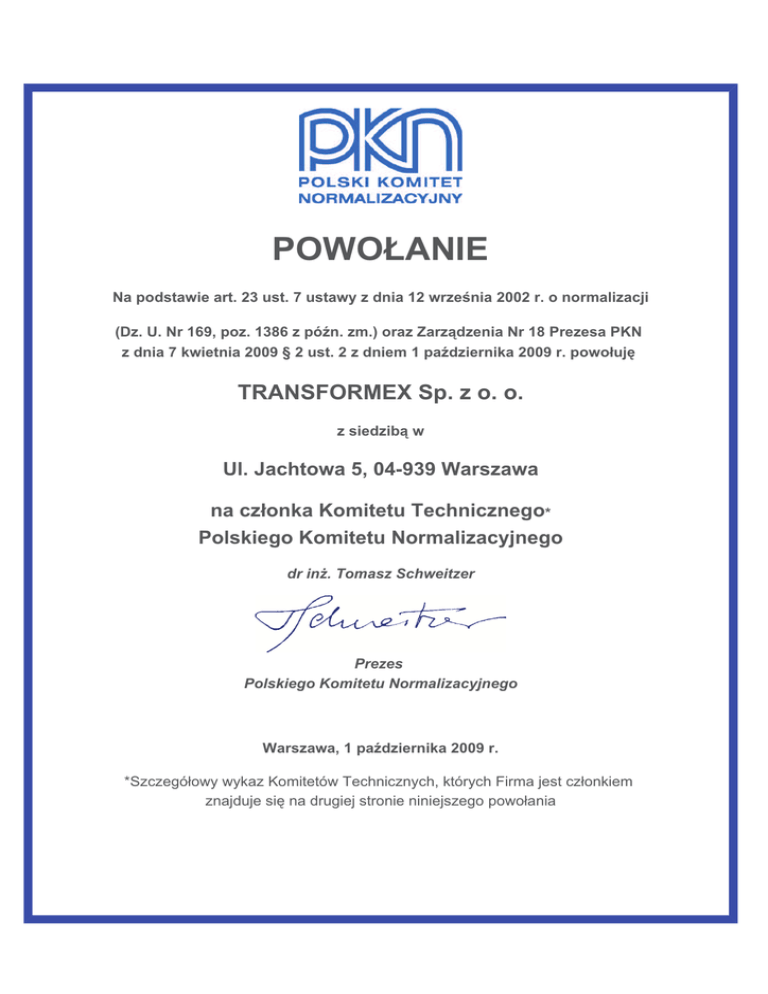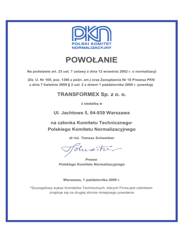 POWOŁANIE Na podstawie art. 23 ust. 7 ustawy z dnia 12 września 2002 r. o normalizacji (Dz. U. Nr 169, poz. 1386 z późn. zm.) oraz Zarządzenia Nr 18 Prezesa PKN z dnia 7 kwietnia 2009 § 2 ust. 2 z dniem 1 października 2009 r. powołuję TRANSFORMEX Sp. z o. o. z siedzibą w Ul. Jachtowa 5, 04-939 Warszawa na członka Komitetu Technicznego* Polskiego Komitetu Normalizacyjnego dr inż. Tomasz Schweitzer Prezes Polskiego Komitetu Normalizacyjnego Warszawa, 1 października 2009 r. *Szczegółowy wykaz Komitetów Technicznych, których Firma jest członkiem znajduje się na drugiej stronie niniejszego powołania Firma TRANSFORMEX Sp. z o. o. jest członkiem następujących Komitetów Technicznych Polskiego Komitetu Normalizacyjnego KT nr 81 ds. Przekładników i Transformatorów Małej Mocy