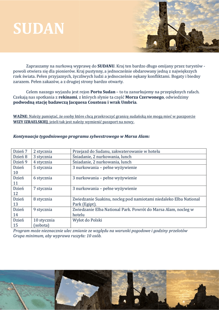SUDAN Zapraszamy na nurkową wyprawę do SUDANU.. Kraj ten bardzo długo omijany przez turystów powoli otwiera się dla pionierów. Kraj pustynny, a jednocześnie obdarowany jedną z największych rzek świata. Pełen przyjaznych, życzliwych ludzi a jednocześnie nękany konfliktami. Bogaty i biedny zarazem. Pełen łen zakazów, a z drugiej strony bardzo otwarty. Celem naszego wyjazdu jest rejon Portu Sudan – to tu zanurkujemy na przepięknych rafach. Czekają nas spotkania z rekinami,, z których słynie ta część Morza Czerwonego, Czerwonego odwiedzimy podwodną stację badawczą Jacquesa Cousteau i wrak Umbria. Umbria WAŻNE:: Należy pamiętać, że osoby które chcą przekroczyć granicę sudańską nie mogą mieć w paszporcie WIZY IZRAELSKIEJ,, jeżeli tak jest należy wymienić paszport na nowy. Kontynuacja tygodniowego programu sylwestrowego w Marsa Mar Alam: Dzień 7 2 stycznia Przejazd do Sudanu, zakwaterowanie w hotelu Dzień 8 3 stycznia Śniadanie, 2 nurkowania, lunch Dzień 9 4 stycznia Śniadanie, 2 nurkowania, lunch Dzień 5 stycznia 3 nurkowania – pełne wyżywienie 10 Dzień 6 stycznia 3 nurkowania – pełne wyżywienie 11 Dzień 7 stycznia 3 nurkowania – pełne wyżywienie 12 Dzień 8 stycznia Zwiedzanie Suakinu, nocleg pod namiotami niedaleko Elba National Park (Egipt). 13 Dzień 9 stycznia Zwiedzanie Elba National Park. Powrót do Marsa Alam, nocleg w 14 hotelu Dzień 10 stycznia Wylot do Polski 15 (sobota) Program może nieznacznie ulec zmianie ze względu na warunki pogodowe i godziny przelotów Grupa minimum, aby wyprawa ruszyła: 10 osób. osób Cena: 2350 usd W cenie: • • • • • • • • • • • • Transfer Marsa Alam – Port Sudan – Marsa Alam 3 dniowe safari nurkowe (pełne wyżywienie) 2 noclegi w hotelu blisko portu, ze śniadaniami 2 dni po 2 nurkowania z łodzi Opłaty portowe oraz za wstęp do Parku Narodowego Lunche w dni nurkowe Butle z powietrzem, pasy balastowe, opieka lokalnych przewodników nurkowych, transfery tran do miejsc nurkowych Zwiedzanie Suakinu, wraz z biletami wstępu 1 Nocleg na pustyni pod namiotami 1 Nocleg w hotelu w Marsa Alam ze śniadaniem Opieka polskiego przewodnika z CTP Nautica Ubezpieczenie KL, NNW obejmujące nurkowanie Cena nie zawiera: • • • Posiłków osiłków nie wymienionych w programie Napiwków Wizy do Sudanu Terminy płatności: Przy rezerwacji: 500 usd Druga rata: do 31 sierpnia – 600 usd Trzecia rata: do 30 września – 600 usd Dopłata do całości: do 31 października – 650 usd PORT SUDAN Został ostał założony przez Brytyjczyków w 1909 roku jako końcowa stacja linii kolejowej łączącej Morze Czerwone z rzeką Nil. Znajduje się tu port, który przejął funkcje portu w Suakin. Linia kolejowa przebiegająca przez miasto była używana do transportu przeznaczonej na eksport bawełny, sezamu oraz sorgo uprawianych nad Nilem. SUAKIN (arab. , Sawākīn) Miasto iasto portowe położone na przybrzeżnej wyspie w północno-wschodnim północno wschodnim Sudanie, na wybrzeżu wybrz Morza Czerwonego. W swoim czasie (do lat 30. XX wieku) był to główny port sudański, ale później stracił znaczenie na rzecz miasta Port Sudan, położonego zaledwie 47 kilometrów na północ. Stare miasto, zbudowane głównie z białego korala i znane jako ostatnie atnie centrum handlu niewolnikami, leży dziś w ruinach. Port w Suakin obsługuje głównie żeglugę promową do Dżuddy w Arabii Saudyjskiej, miasta leżącego na trasie pielgrzymek do Mekki. INFORMACJE DODATKOWE Ciekawość świata: Sudan jest krajem wyznaniowym co oznacza, że prawnie nakazane bądź zakazane są pewne zachowania i należy ich przestrzegać. Niektóre normy wynikające z przepisów nie będą dla nas wystarczająco jasne, dlatego kierujemy się intuicją i szacunkiem dla odmienności, odmienności, ale pytajmy o wszystko co jest dla nas niejasne. Sudańczycy z wielka chęcią opowiadają o swoich obyczajach, wierzeniach; o swoim kraju, swojej kulturze i religii. Religią bezsprzecznie dominująca w Sudanie północnym jest islam, ale jako że turystyka nie n jest tu rozwinięta zaskoczy nas obowiązujący zwyczaj dawania jałmużny. Jałmużna jest jednym z "nakazów" Koranu i w Sudanie ludzie proszący o pieniądze najczęściej je dostają. Często jałmużnę daje się również tym, którzy nie proszą jako dzielenie sie z biedniejszymi. iedniejszymi. Dobrze jest mieć na podorędziu podoręd drobne funty. Szczepienia Nie ma obowiązku profilaktycznych szczepień, aczkolwiek mogą występować zagrożenia sanitarnosanitarno epidemiologiczne, dlatego jak przy wszystkich wyjazdach w kraje egzotyczne zalecane są szczepienia: szcz WZW A i B, dur brzuszny, błonica , tężec i polio. Zalecane są również środki antymalaryczne, ze względu na występującą malarię. Z uwagi na skalę zagrożeń epidemiologicznych (w tym również AIDS i febrę) oraz częste w tym kraju zatrucia pokarmowe należy leży przestrzegać zasad higieny, spożywać produkty tylko wiadomego pochodzenia oraz najlepiej pić wodę oryginalnie butelkowaną bądź przegotowaną. Obyczaje W Sudanie nie należy nosić krótkich spódnic, szortów i strojów plażowych. Niewłaściwe jest również noszenie no krótkich spodni przez mężczyzn. Kobiety powinny mieć ubranie zakrywające ramiona i nogi do kolan. Należy też mieć na uwadze, iż kobiety bez towarzystwa mężczyzn narażone mogą być na zaczepki ludności miejscowej. Źle jest postrzegana kobieta paląca papierosy w miejscach publicznych, a zwłaszcza na ulicy. Odradza się podejmowanie wszelkich dyskusji i polemik mogących wywołać negatywne emocje. Kuchnia: W tradycyjnej kuchni Sudanu bardzo często wykorzystuje się mielone mięso - kofta. Jest ono zazwyczaj pieczone na rożnie. Równie często wykorzystuje się pieczony na rożnie kebab, który robiony jest z mięsa jagnięcego. Mięsa (jagnięcia, drób, gołębie, mięso kozie i baranina) najczęściej podawan