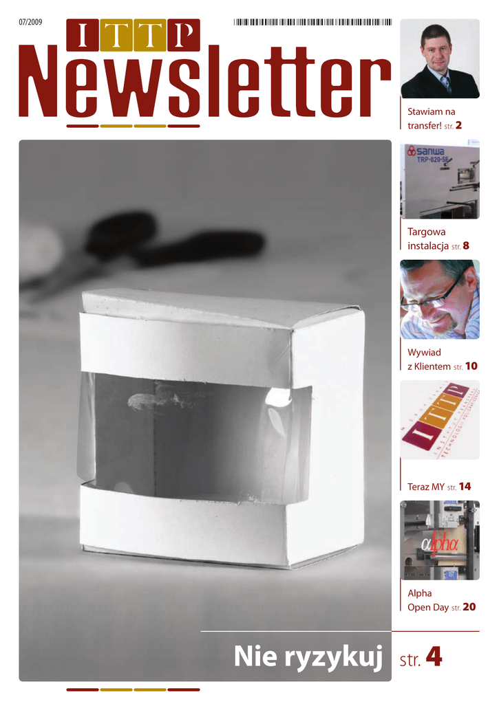 07/2009 Stawiam na transfer! str. 2 Targowa instalacja str. 8 Wywiad z Klientem str. 10 Teraz MY str. 14 Alpha Open Day str. 20 Nie ryzykuj str. 4 Na początek Stawiam na transfer! – mówi Prezes Zarządu M.M. Druk Serwis Sp. z o.o. Pan Tomasz Marczewski Trzymacie Państwo w dłoni pierwszy numer newslettera Instytutu Transferu Technologii Poligraficznych, wydawanego i dystrybuowanego wśród obecnych i potencjalnych klientów oraz partnerów biznesowych ITTP. O przyczyny i idee jego powstania pytamy Pana Tomasza Marczewskiego. I nstytut Transferu Technologii Poligraficznych jest integralną częścią firmy M.M. Druk Serwis Sp. z o.o., która w bieżącym roku obchodzi swoje 10-lecie powstania. Aby przybliżyć lub odświeżyć Czytelnikom sylwetkę firmy poprosiliśmy o wypowiedź Prezesa jej Zarządu – Pana Tomasza Marczewskiego. Monika Batko (MB): Jak zmieniała się firma od początku powstania, jak ewoluowała? Tomasz Marczewski (TM): Biorąc pod uwagę jubileusz, jaki aktualnie obchodzimy, musimy sięgnąć pamięcią do końca ubiegłego stulecia. Wówczas to, rynek maszyn i urządzeń poligraficznych był inny, nie tak bardzo nasycony jak obecnie, zaś z drugiej strony niemalże zmonopolizowany. W tym okresie, kierując jedną z najlepiej wyposażonych na ówczesne czasy małopolskich drukarni, wprowadzałem nieznane do tej pory marki maszyn i nowe technologie produkcyjne. Na bazie tych doświadczeń, sprawdzonych zarówno w kategoriach ekonomicznych, jak i praktycznych, zrodziła się we mnie inicjatywa podzielenia się z rynkiem zewnętrznym moją wiedzą i produktami znanymi na świecie, aczkolwiek jeszcze nie w Polsce. Tak powstała firma, której misją jest dostarczanie rozwiązań technologicznych dedykowanych pod konkretne potrzeby drukarzy. 2 Początkowo byliśmy małą firmą, składającą się z dwóch założycieli (mnie i mojego Wspólnika – Roberta Miklaszewskiego). Przez okres 10 lat zwiększyliśmy liczbę zatrudnionych do kilkudziesięciu osób. Dziś jesteśmy polskim liderem w zakresie usług outsourcingowych zarządzania drukiem oraz jedną z bardziej znanych firm, zajmującą się dostarczaniem innowacyjnych technologii poligraficznych. Po pierwszych latach istnienia zaprzestaliśmy już tylko myślenia o aktywności handlowej i zmieniliśmy szybko podejście do działalności, którą początkowo traktowaliśmy jako dodatkową. Transfer technologii poligraficznych, doradztwo w zakresie wdrażania najnowszych rozwiązań produkcyjnych, wsparcie dla drukarń starających się o dotacje z Unii Europejskiej na innowacyjność oraz serwis maszyn poligraficznych stał się działalnością wiodącą, która pozwoliła na wykreowanie i wprowadzenie na rynek osobnej marki, jakim jest Instytut Transferu Technologii Poligraficznych. Powiększenie się firmy w ciągu tych 10 lat wymusiło również trzykrotną przeprowadzkę do coraz to większych lokali, by w roku 2007 zaowocować przeniesieniem do własnego budynku o powierzchni 1800 m2 mieszczącego się w Skawinie koło Krakowa. Niemniej jednak według mnie najważniejsze w ewolucji firmy są jej osiągnięcia zapewniające ciągły rozwój: wdrożenie do kilkunastu polskich drukarni zupełnie nowych na naszym rynku technologii, wyposażenie lub doposażenie ich parku maszynowego poprzez sprzedaż kilkudziesięciu sztuk maszyn i urządzeń poligraficznych. Ponieważ transferowana do drukarni wiedza połączona jest nierozerwalnie z wiedzą naszych producentów przez cały ten okres ponad dziesięciu lat staraliśmy się i nadal staramy pozyskiwać nowych dostawców. I tak zaczynając od współpracy z jednym, aktualnie reprezentujemy kilku najbardziej znanych i cenionych na świecie producentów maszyn poligraficznych. MB: Jakie wydarzenia uważa Pan za kluczowe dla rozwoju firmy? TM: Ważnych wydarzeń było wiele – trudno wskazać to najważniejsze. Zaczynaliśmy praktycznie na zmonopolizowanym rynku. Pomagała nam przede wszystkim nasza determinacja w dążeniu do celu. Dekadę temu praktycznie uczyliśmy się prowadzić biznes. Problemów było wiele, aczkolwiek wspólna praca powiększającego się wciąż zespołu przynosiła wymierne efekty. Jak już wspomniałem, bezsprzecznie, za zwrotny punkt w rozwoju firmy można uważać moment, w którym to działalność z tytułu sprzedaży maszyn, zakładana pierwotnie jako dodatkowa, stała się działalnością wiodącą. Wydarzenie to połączone było z moim personalnym zaangażowaniem w działalność operacyjną ITTP, w wyniku którego główny nacisk został położony na zmianę strategii firmy i bardziej dynamiczny rozwój tego działu. Oczywiście posunięcie takie możliwe było jedynie dzięki wypracowanemu przez lata podziałowi obowiązków w zarządzie, który właśnie w tym czasie pozwolił mi się skupić na maszynach i umożliwić wykonanie następnego kroku milowego, jakim było wykreowanie nowej identyfikacji wizualnej i wypromowanie marki Instytutu Transferu Technologii Poligraficznych. Ważną konsekwencją rozwoju firmy był również zakup własnego budynku biurowego. Mimo, iż w nowym biurze firma mieści się zaledwie od półtora roku, nawet z tak krótkiej perspektywy czasu wszyscy doceniamy tego zalety, widoczne choćby w komforcie pracy i niepohamowanych lokalowo możliwościach dalszego rozwoju. Jestem przekonany, że własny lokal wysoko zaprocentuje nam w przyszłości. Nowy budynek biurowy MMDS w Skawinie MB: Co aktualnie skłoniło firmę do wydawania własnego newslettera? TM: Osiągnąwszy pewien poziom rozwoju wszyscy szukamy dodatkowych form promocji. Stąd też oprócz kontynuowanej od lat współpracy z czasopismami branżowymi, a mając pewien pakiet doświadczeń w redagowaniu publikacji prasowych, postanowiliśmy wyjść z inicjatywą wydawania własnego biuletynu. Chcemy mieć możliwość za pośrednictwem własnego newslettera dotarcia do osób zarządzających drukarniami, do swoich kontrahentów i partner