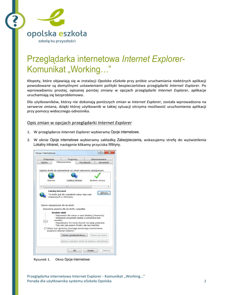 Przeglądarka internetowa Internet ExplorerKomunikat „Working…” Kłopoty, które objawiają się w instalacji Opolska eSzkoła przy próbie uruchamiania niektórych aplikacji powodowane są domyślnymi ustawieniami polityki bezpieczeństwa przeglądarki Internet Explorer. Po wprowadzeniu prostej, opisanej poniżej zmiany w opcjach przeglądarki Internet Explorer, aplikacje uruchamiają się bezproblemowo. Dla użytkowników, którzy nie dokonają poniższych zmian w Internet Explorer, została wprowadzona na serwerze zmiana, dzięki której użytkownik w takiej sytuacji otrzyma możliwość uruchomienia aplikacji przy pomocy widocznego odnośnika. Opis zmian w opcjach przeglądarki Internet Explorer 1. W przeglądarce Internet Explorer wybieramy Opcje internetowe. 2. W oknie Opcje internetowe wybieramy zakładkę Zabezpieczenia, wskazujemy strefę do wyświetlenia Lokalny intranet, następnie klikamy przyciska Witryny. Rysunek 1. Okno Opcje internetowe Przeglądarka internetowa Internet Explorer - Komunikat „Working…” Porada dla użytkownika systemu eSzkoła Opolska 1 3. W oknie Lokalny intranet wybieramy opcję zaawansowane klikając na przycisk Zaawansowane. Rysunek 2. Okno Lokalny intranet 4. Następnie dodajemy trzy witryny sieci Web: https://adfs.eszkola.opolskie.pl https://sigma.eszkola.opolskie.pl https://uonet.eszkola.opolskie.pl Rysunek 3. Okno dodawania witryn sieci Web Po ponownym uruchomieniu przeglądarki Internet Explorer nie będzie blokował aplikacji na stronie Opolska eSzkola. Przeglądarka internetowa Internet Explorer - Komunikat „Working…” Porada dla użytkownika systemu eSzkoła Opolska 2