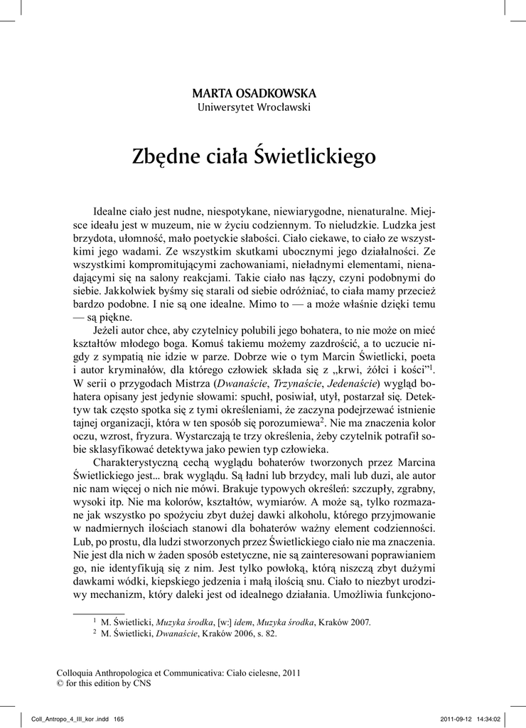 MARTA OSADKOWSKA Uniwersytet Wroc³awski Zbêdne cia³a Œwietlickiego Idealne ciało jest nudne, niespotykane, niewiarygodne, nienaturalne. Miejsce ideału jest w muzeum, nie w życiu codziennym. To nieludzkie. Ludzka jest brzydota, ułomność, mało poetyckie słabości. Ciało ciekawe, to ciało ze wszystkimi jego wadami. Ze wszystkim skutkami ubocznymi jego działalności. Ze wszystkimi kompromitującymi zachowaniami, nieładnymi elementami, nienadającymi się na salony reakcjami. Takie ciało nas łączy, czyni podobnymi do siebie. Jakkolwiek byśmy się starali od siebie odróżniać, to ciała mamy przecież bardzo podobne. I nie są one idealne. Mimo to — a może właśnie dzięki temu — są piękne. Jeżeli autor chce, aby czytelnicy polubili jego bohatera, to nie może on mieć kształtów młodego boga. Komuś takiemu możemy zazdrościć, a to uczucie nigdy z sympatią nie idzie w parze. Dobrze wie o tym Marcin Świetlicki, poeta i autor kryminałów, dla którego człowiek składa się z „krwi, żółci i kości”1. W serii o przygodach Mistrza (Dwanaście, Trzynaście, Jedenaście) wygląd bohatera opisany jest jedynie słowami: spuchł, posiwiał, utył, postarzał się. Detektyw tak często spotka się z tymi określeniami, że zaczyna podejrzewać istnienie tajnej organizacji, która w ten sposób się porozumiewa2. Nie ma znaczenia kolor oczu, wzrost, fryzura. Wystarczają te trzy określenia, żeby czytelnik potrafił sobie sklasyfikować detektywa jako pewien typ człowieka. Charakterystyczną cechą wyglądu bohaterów tworzonych przez Marcina Świetlickiego jest... brak wyglądu. Są ładni lub brzydcy, mali lub duzi, ale autor nic nam więcej o nich nie mówi. Brakuje typowych określeń: szczupły, zgrabny, wysoki itp. Nie ma kolorów, kształtów, wymiarów. A może są, tylko rozmazane jak wszystko po spożyciu zbyt dużej dawki alkoholu, którego przyjmowanie w nadmiernych ilościach stanowi dla bohaterów ważny element codzienności. Lub, po prostu, dla ludzi stworzonych przez Świetlickiego ciało nie ma znaczenia. Nie jest dla nich w żaden sposób estetyczne, nie są zainteresowani poprawianiem go, nie identyfikują się z nim. Jest tylko powłoką, którą niszczą zbyt dużymi dawkami wódki, kiepskiego jedzenia i małą ilością snu. Ciało to niezbyt urodziwy mechanizm, który daleki jest od idealnego działania. Umożliwia funkcjono1 2 M. Świetlicki, Muzyka środka, [w:] idem, Muzyka środka, Kraków 2007. M. Świetlicki, Dwanaście, Kraków 2006, s. 82. Colloquia Anthropologica et Communicativa: Ciało cielesne, 2011 © for this edition by CNS Coll_Antropo_4_III_kor .indd 165 2011-09-12 14:34:02 166 MARTA OSADKOWSKA wanie, ale nie ma nic wspólnego z atrakcyjnością. Pozwala się przemieszczać z knajpy do knajpy i to wydaje się jego główną zaletą dla bohaterów kryminalnej trylogii. Więcej w nim wad: jest słabe, męczy się, kiepsko reaguje na alkohol i bijatyki: Mistrz przez chwilę leżał jak żuczek przewrócony na grzbiet, potem wstał, zakręciło mu się w głowie, usiadł przy stole. Głowa mu pulsowała, przed oczami biegały mu kolorowe plamy, w uszach miał twardy bełkot. Powlókł się do łazienki i tam zemdlał3. Mechanizm ten niezbyt dobrze znosi rany i uderzenia. Zbyt ciężki, by wystarczająco szybko uciekać, kiedy grozi niebezpieczeństwo. Przewidywalny w swoich odruchach, co pozwala bohaterom, za pomocą palców wsadzonych głęboko w gardło, szybko się zregenerować po kilkudniowym pijaństwie. Świetlicki nie ma problemu z opisywaniem reakcji ciała w całej ich brzydocie. Wręcz przeciwnie, te opisy stanowią stały element jego prozy i poezji. Z przyjemnością pozwala swoim postaciom wymiotować, krztusić się czy dławić, wydzielać wszelkie możliwe substancje we wszelkich możliwych konfiguracjach. W połączeniu z językiem i stylem krakowskiego poety, którego skojarzenia i pomysły mogą wywoływać obrzydzenie nawet u tych bardzo tolerancyjnych czytelników, takie podejście do człowieka i jego ciała daje poczucie obcowania z całym brudem, syfem i obleśnością tego świata. Wyobraźnia artysty pracuje na najwyższych obrotach, żeby wywołać taki efekt u odbiorcy. Powstają wtedy opisy typu: „w cukrze jajko robaka, a pościel / pokryta grzybem”4. Łatwo dopasować sobie człowieka do tak opisywanego świata. Ten człowiek jest brzydki, brudny, lepki, śmierdzący. Wiele innych epitetów przychodzi nam na myśl, gdy próbujemy go sobie wyobrazić. Gdy czytamy o świecie, któremu poeta nie szczędzi słów wywołujących dreszcz obrzydzenia, pojawiający się w nim człowiek nie musi już być opisany. Wyobrażamy go sobie bez problemu, jako element pasujący do wszelkich obrzydliwości. W jednym z wierszy Świetlicki porównuje ciało do hamburgera z McDonalda: Czasami jestem hamburgerem. Sterczy ze mnie sałata i musztarda cieknie. Czasami jestem podobnie śmiertelnie Do wszystkich innych hamburgerów. Pierwsza warstwa: skóra. Druga warstwa: krew. Trzecia warstwa: kości5. Porównanie swojego ciała do tego konkretnego produktu, który słynie z nasycenia tłuszczem, chemią i wszelkimi możliwymi paskudztwami, nie może dać 3 4 5 Ibidem, s. 30. M. Świetlicki, To mnie umiera, [w:] idem, Schizma, Gładyszów 1999. M. Świetlicki, McDonald’s, utwór zespołu Świetliki. Colloquia Anthropologica et Communicativa: Ciało cielesne, 2011 © for this edition by CNS Coll_Antropo_4_III_kor .indd 166 2011-09-12 14:34:03 Zbêdne cia³a Œwietlickiego 167 przyjemnego skojarzenia. Cóż przyjemnego w porównaniu do mięsa, o którym krąży opinia, że jest jedynie efektem mielenia najmniej apetycznych elementów zwierzęcia, jak pazury, oczy czy wnętrzności? Do tego ociekającego tłuszczem i Bóg wie czym jeszcze. Dlaczego ciało nie ma dla bohaterów znaczenia? Pewnie dlatego, że dla nich nic nie jest ważne. Nie ma świętości, nie ma wzniosłych spraw, nie ma uczuć ani głębokich