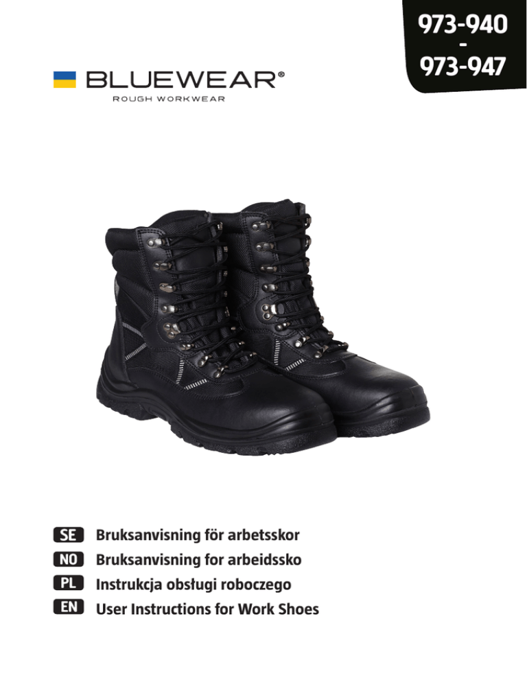 973-940 973-947 Bruksanvisning för arbetsskor Bruksanvisning for arbeidssko Instrukcja obsługi roboczego User Instructions for Work Shoes SE - NO - PL - EN - Bruksanvisning i original Bruksanvisning i original Instrukcja obsługi w oryginale Operating instructions in original Date of production: 2014-06-12 © Jula AB SVENSKA������������������������������������������������������������������������������������������������������������������ 4 SÄKERHETSANVISNINGAR����������������������������������������������������������������������������������������������������������������������4 TEKNISKA DATA ��������������������������������������������������������������������������������������������������������������������������������������5 BESKRIVNING������������������������������������������������������������������������������������������������������������������������������������������7 UNDERHÅLL��������������������������������������������������������������������������������������������������������������������������������������������7 NORSK���������������������������������������������������������������������������������������������������������������������� 9 SIKKERHETSANVISNINGER��������������������������������������������������������������������������������������������������������������������� 9 TEKNISKE DATA��������������������������������������������������������������������������������������������������������������������������������������10 BESKRIVELSE ���������������������������������������������������������������������������������������������������������������������������������������� 12 VEDLIKEHOLD���������������������������������������������������������������������������������������������������������������������������������������� 12 POLSKI���������������������������������������������������������������������������������������������������������������������14 ZASADY BEZPIECZEŃSTWA�������������������������������������������������������������������������������������������������������������������� 14 DANE TECHNICZNE�������������������������������������������������������������������������������������������������������������������������������� 15 OPIS������������������������������������������������������������������������������������������������������������������������������������������������������ 17 KONSERWACJA���������������������