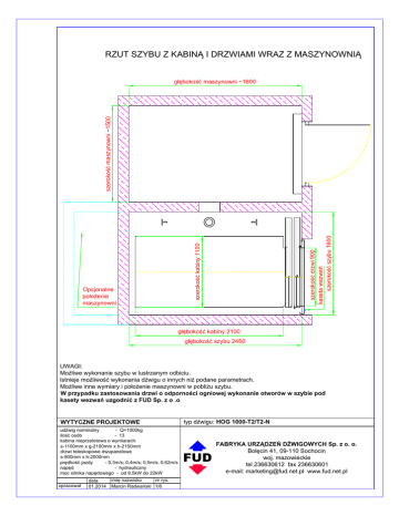 Opcjonalne maszynowni UWAGI: HOG 1000-T2/T2-N WYTYCZNE PROJEKTOWE kabina nieprzelotowa o wymiarach: s-1100mm x g-2100mm x h-2150mm drzwi teleskopowe dwupanelowe s-900mm x h-2000mm data 01.2014 FUD nr rys. 1/6 woj. mazowieckie tel 236630612 fax 236630601 e-mail: [email protected] www.fud.net.pl DRZWIOWY SZYBU UWAGI: 2230 Wszystkie wymiary w ARCHITEKTURZE. Drzwi do maszynowni min 900x2000 60 70 posadzki maszynowni. 1160 70 1180 420 300x400 Opcjonalne maszynowni HOG 1000-T2/T2-N WYTYCZNE PROJEKTOWE kabina nieprzelotowa o wymiarach: s-1100mm x g-2100mm x h-2150mm drzwi teleskopowe dwupanelowe s-900mm x h-2000mm data 01.2014 FUD nr rys. 2/6 woj. mazowieckie tel 236630612 fax 236630601 e-mail: [email protected] www.fud.net.pl nadszybie min 3400 +10mm. wentylacyjnego 1% przekroju poprzecznego szybu. 2230 UWAGI: bloczki fundamentowe na poziomach mocowania 70 60 betonu zbrojonego. HOG 1000-T2/T2-N WYTYCZNE PROJEKTOWE kabina nieprzelotowa o wymiarach: s-1100mm x g-2100mm x h-2150mm drzwi teleskopowe dwupanelowe s-900mm x h-2000mm data 01.2014 60 70 max 1650 2230 60 70 podszybie min 1200 max 2450 8. Szyb i maszynownia s u wy acznie do pracy d wigu. Inne urz dzenia, takie jak przewody elektryczne, ruroci gi itp. nie nale ce do d wigu nie mog by instalowane w szybie lub maszynowni. 9. Doj cia do maszynowni min. 2m wysoko ci. 10. Powierzchnia pod ogi maszynowni powinna by szorstka i zabezpieczona przed wsi kaniem oleju hydraulicznego je li zostanie rozlany. W przypadku zniszczenia zbiornika znajduj cy si w nim olej nie powinien przedosta si poza maszynowni ani wsi ka w ciany, co wymaga zabezpieczenia cian i stosowania podwy szonego progu, co najmniej do wysoko ci rozlanego oleju. 11. Pod oga maszynowni powinna przenie obci enie min. 5kN/m. 1 ciany i sufit maszynowni powinny by pomalowane farb olejn lub emulsyjn . 13. Drzwi do maszynowni (min 900x2000) musza by wykonane z materia w ogniotrwa ych i otwiera si na zewn trz. Drzwi powinny by zamkni te i otwierane od wn trza bez u ycia klucza z zewn trz tylko kluczem. 14. Wysoko maszynowni w najni szym punkcie powinna wynosi min. 2 m. 15. Maszynownia powinna by wietrzona oraz tak wyposa ona aby nie wyst powa y w niej: wilgo , kurz i szkodliwe wyziewy. 2230 pomieszczenia dostepne dla ludzi. FUD nr rys. 3/6 woj. mazowieckie tel 236630612 fax 236630601 e-mail: [email protected] www.fud.net.pl 1600 160 Fy PT Fx Fy 2450 P4 1310 Pg 1075 1275 1445 Fx Fx Fy PT- max 47kN P4- max 47kN Pg- max 36kN Fx- max 8,1kN Fy- max 2,2kN HOG 1000-T2/T2-N WYTYCZNE PROJEKTOWE kabina nieprzelotowa o wymiarach: s-1100mm x g-2100mm x h-2150mm drzwi teleskopowe dwupanelowe s-900mm x h-2000mm data 01.2014 FUD nr rys. 4/6 woj. mazowieckie tel 236630612 fax 236630601 e-mail: [email protected] www.fud.net.pl 1600 100 380 powierzchnie wolne 2 2 kN/m HOG 1000-T2/T2-N WYTYCZNE PROJEKTOWE kabina nieprzelotowa o wymiarach: s-1100mm x g-2100mm x h-2150mm drzwi teleskopowe dwupanelowe s-900mm x h-2000mm data 01.2014 FUD nr rys. 5/6 woj. mazowieckie tel 236630612 fax 236630601 e-mail: [email protected] www.fud.net.pl 2x36W 500 nadszybie min 3400 szybu 1600 1180 oprawy (wolny odcinek przewodu 2m) maszynowni 200 lux 420 maszynowni ~1500 RZUT SZYBU I MASZYNOWNI Listwa zaciskowa tablicy sterowej Tablica dostarcza Kaseta na kabinie dostarcza FUD Tablica TOMS dostarcza NS LS1 LS2 LS3 L1 L2 L3 N PE Kasteta w podszybiu dostarcza FUD m/s >< 0,3m/s 0,4m/s 0,5m/s 0,62m/s 2 mm Cu kW L1, L2, L3 >< 9,5-12,5kW 16 12,5-14,7kW 16 14,7-18,4kW 25 18,4-22kW 25 N 16 16 25 25 PE 16 16 25 25 A >< C50 C63 C80 C80 HOG 1000-T2/T2-N WYTYCZNE PROJEKTOWE kabina nieprzelotowa o wymiarach: s-1100mm x g-2100mm x h-2150mm drzwi teleskopowe dwupanelowe s-900mm x h-2000mm data 01.2014 500 Zabezpieczenie Moc silnika podszybie min 1200 max 2450 rozstaw lamp szybu dostarcza FUD FUD nr rys. 6/6 woj. mazowieckie tel 236630612 fax 236630601 e-mail: [email protected] www.fud.net.pl