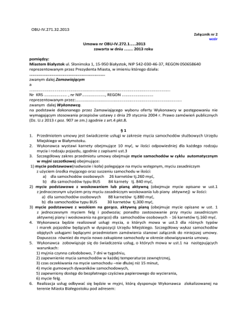 OBU-IV.271.32.2013 Załącznik nr 2 wzór Umowa nr OBU-IV.272.1……2013 zawarta w dniu …….. 2013 roku pomiędzy: Miastem Białystok ul. Słonimska 1, 15-950 Białystok, NIP 542-030-46-37, REGON 050658640 reprezentowanym przez Prezydenta Miasta, w imieniu którego działa: ……………………………………………………………. zwanym dalej Zamawiającym a …………………………………………………………………………………………………………………….. Nr KRS …………………. , nr NIP…………………., REGON ………………………… reprezentowanym przez:……………………………………………………………………………………….. zwanym dalej Wykonawcą. na podstawie dokonanego przez Zamawiającego wyboru oferty Wykonawcy w postępowaniu nie wymagającym stosowania przepisów ustawy z dnia 29 stycznia 2004 r. Prawo zamówień publicznych (Dz. U.z 2013 r.poz. 907 ze zm.) zgodnie z art.4 pkt.8. §1 1. Przedmiotem umowy jest świadczenie usługi w zakresie mycia samochodów służbowych Urzędu Miejskiego w Białymstoku. 2. Wykonawca wystawi karnety obejmujące 10 myć, w ilości odpowiedniej dla każdego rodzaju mycia i rodzaju pojazdu, zgodnie z zapisami ust.3 3. Szczegółowy zakres przedmiotu umowy obejmuje mycie samochodów w cyklu automatycznym w myjni szczotkowej obejmujące: 1) mycie podstawowe(nadwozie i koła) polegające na myciu wstępnym, myciu zasadniczym z użyciem środka myjącego oraz suszeniu samochodu w ilości: a) dla samochodów osobowych 26 karnetów tj.260 myć, b) dla samochodów typu BUS 84 karnety tj. 840 myć, 2) mycie podstawowe z woskowaniem lub pianą aktywną (obejmuje mycie opisane w ust.1 z jednoczesnym użyciem przy myciu zasadniczym woskowania lub piany aktywnej) w ilości: a) dla samochodów osobowych 88 karnetów tj.880 myć, b) dla samochodów typu BUS 30 karnetów tj.300 myć, 3) mycie podstawowe z woskiem na gorąco, aktywną pianą (obejmuje mycie opisane w ust. 1 z jednoczesnym myciem felg i podwozia; ponadto zastosowanie przy myciu zasadniczym aktywnej piany i woskowania na gorąco) dla samochodów osobowych - 16 karnetów tj.160 myć. 4. Wykonawca będzie realizował usługi mycia, o których mowa w ust.3 dla różnych typów i marek pojazdów będących w dyspozycji Urzędu Miejskiego. Szczegółowy wykaz samochodów objętych usługami będącymi przedmiotem zamówienia stanowi załącznik do niniejszej umowy. Dopuszcza również do mycia nowo zakupione samochody w okresie obowiązywania umowy. 5. Wykonawca zobowiązuje się do świadczenia usług, o których mowa w ust.1 na następujących warunkach: 1) myjnia czynna całodobowo, 7 dni w tygodniu, 2) zapewnienie mycia samochodów w każdej temperaturze zewnętrznej, 3) czas oczekiwania na mycie samochodu –nie dłużej niż 15 minut, 4) mycie gumowych dywaników samochodowych, 5) zapewniony dostęp do bezpłatnego czyściwa papierowego do wycierania, 6) mycie felg. 6. Realizacja usług odbywać się będzie w myjni, którą dysponuje Wykonawca zlokalizowanej na terenie Miasta Białegostoku pod adresem: Białystok………………………………………………………………………………………………………. 7. Wykonawca będzie realizował usługę na podstawie karnetów, którymi dysponować będą kierujący pojazdami objętymi przedmiotem zamówienia. Zamawiający zobowiązuje się wykupić w danym kwartale 2014 roku następującą, szacunkową ilość karnetów: I kwartał 2014 r. - mycie podstawowe samochodów osobowych 7 szt. - mycie podstawowe z woskowaniem lub pianą aktywną samochodów osobowych 22 szt. - mycie podstawowe z woskiem na gorąco, aktywną pianą samochodów osobowych 4 szt. - mycie podstawowe samochodów typu BUS 21 szt. - mycie podstawowe z woskowaniem lub pianą aktywną samochodów typu BUS 7,5 szt. II kwartał 2014 r. - mycie podstawowe samochodów osobowych 6 szt. - mycie podstawowe z woskowaniem lub pianą aktywną samochodów osobowych 22 szt. - mycie podstawowe z woskiem na gorąco, aktywną pianą samochodów osobowych 4 szt. - mycie podstawowe samochodów typu BUS 21 szt.. - mycie podstawowe z woskowaniem lub pianą aktywną samochodów typu BUS 7,5 szt. III kwartał 2014 r. - mycie podstawowe samochodów osobowych 7 szt. - mycie podstawowe z woskowaniem lub pianą aktywną samochodów osobowych 22 szt. - mycie podstawowe z woskiem na gorąco, aktywną pianą samochodów osobowych 4 szt. - mycie podstawowe samochodów typu BUS 21 szt.. - mycie podstawowe z woskowaniem lub pianą aktywną samochodów typu BUS 7,5 szt. IV kwartał 2014 r. - mycie podstawowe samochodów osobowych 6 szt. - mycie podstawowe z woskowaniem lub pianą aktywną samochodów osobowych 22 szt. - mycie podstawowe z woskiem na gorąco, aktywną pianą samochodów osobowych 4 szt. - mycie podstawowe samochodów typu BUS 21 szt.. - mycie podstawowe z woskowaniem lub pianą aktywną samochodów typu BUS 7,5 szt. 8. Zakup karnetów będzie poprzedzony pisemnym zamówieniem jednorazowo w danym kwartale i będzie potwierdzony fakturą VAT wystawioną przez Wykonawcę w dniu sprzedaży. 9. Nie wyczerpanie zamówienia w całości nie spowoduje u Zamawiającego żadnych konsekwencji prawno-finansowych. §2 1. Wartość umowy brutto nie przekroczy kwoty…………….. zł słownie:…………………………………..,… , w tym należny podatek VAT wg stawki 23% w kwocie …………………………………………….. 2.Ceny jednostkowe za usługę wynoszą: 1) mycie podstawowe a) samochodu osobowego ….. zł brutto/ 1 mycie b) samochód dostawczy ….. zł brutto/ 1 mycie c) mikrobus …… zł brutto/ 1 mycie 2) mycie podstawowe z woskowaniem lub pianą aktywną a) samochodu osobowego ….. zł brutto/ 1 mycie b) samochód dostawczy ….. zł brutto/ 1 mycie c) mikrobus ….. zł brutto/ 1 mycie 3) mycie podstawowe z woskiem na gorąco, pianą aktywną z myciem fe