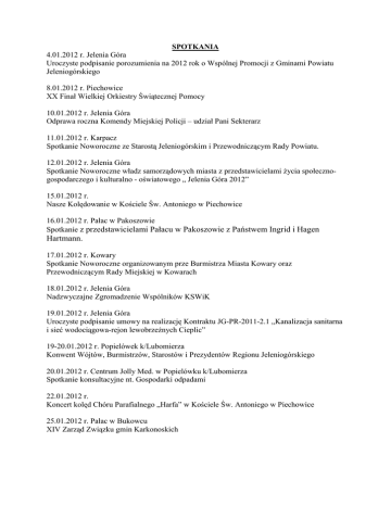 SPOTKANIA 4.01.2012 r. Jelenia Góra Uroczyste podpisanie porozumienia na 2012 rok o Wspólnej Promocji z Gminami Powiatu Jeleniogórskiego 8.01.2012 r. Piechowice XX Finał Wielkiej Orkiestry Świątecznej Pomocy 10.01.2012 r. Jelenia Góra Odprawa roczna Komendy Miejskiej Policji – udział Pani Sekterarz 11.01.2012 r. Karpacz Spotkanie Noworoczne ze Starostą Jeleniogórskim i Przewodniczącym Rady Powiatu. 12.01.2012 r. Jelenia Góra Spotkanie Noworoczne władz samorządowych miasta z przedstawicielami Ŝycia społecznogospodarczego i kulturalno - oświatowego „ Jelenia Góra 2012” 15.01.2012 r. Nasze Kolędowanie w Kościele Św. Antoniego w Piechowice 16.01.2012 r. Pałac w Pakoszowie Spotkanie z przedstawicielami Pałacu w Pakoszowie z Państwem Ingrid i Hagen Hartmann. 17.01.2012 r. Kowary Spotkanie Noworoczne organizowanym prze Burmistrza Miasta Kowary oraz Przewodniczącym Rady Miejskiej w Kowarach 18.01.2012 r. Jelenia Góra Nadzwyczajne Zgromadzenie Wspólników KSWiK 19.01.2012 r. Jelenia Góra Uroczyste podpisanie umowy na realizację Kontraktu JG-PR-2011-2.1 „Kanalizacja sanitarna i sieć wodociągowa-rejon lewobrzeŜnych Cieplic” 19-20.01.2012 r. Popielówek k/Lubomierza Konwent Wójtów, Burmistrzów, Starostów i Prezydentów Regionu Jeleniogórskiego 20.01.2012 r. Centrum Jolly Med. w Popielówku k/Lubomierza Spotkanie konsultacyjne nt. Gospodarki odpadami 22.01.2012 r. Koncert kolęd Chóru Parafialnego „Harfa” w Kościele Św. Antoniego w Piechowice 25.01.2012 r. Pałac w Bukowcu XIV Zarząd Związku gmin Karkonoskich Referat Gospodarki Nieruchomościami i Ochrony Środowiska I. ZłoŜono: - 1 wniosek do Sądu Rejonowego w Jeleniej Górze o wpisy do ksiąg wieczystych, II. Podpisano: 1. Umowę uŜyczenia ze Starostą Jeleniogórskim w sprawie bezpłatnego uŜywania terenu działki nr 63 o pow. 5,21ha z obrębu: 0001 „Bobrowe Skały” do czasu przekazania mienia na rzecz Gminy Miejskiej Piechowice, nie dłuŜej niŜ na okres 3 lat. 2. Porozumienia: - w sprawie nieodpłatnego przekazania działki nr 11/4 o pow. 13m2 z przy ul. Szklarskiej pod poszerzenie drogi gminnej (uregulowanie własności gruntu zajętego pod drogę gminną), - w sprawie nieodpłatnego przekazania terenu zajętego pod drogi ulicę Kolonijną i Plac Wczasowy (poszerzenie ww. dróg) – brak jednego podpisu współwłaściciela z uwagi na okoliczności rodzinne (sprawa P. Artura Kołodziejczyka). III. Sporządzono: 1. 1 wykaz nieruchomości przeznaczonych do sprzedaŜy, 2. 1 wykaz nieruchomości przeznaczonych do dzierŜawy, 3. Ogłoszenie o przetargu ustnym nieograniczonym na sprzedaŜ 10 nieruchomości gruntowych IV. Przygotowano: 1. 1 Zarządzenie w sprawie przeznaczenia do sprzedaŜy nieruchomości stanowiących własność Gminy Miejskiej Piechowice. V. Wydano. 1. 1 wypis i wyrys z planu zagospodarowania przestrzennego, 2. 3 zaświadczeń o przeznaczeniu nieruchomości w planie zagospodarowania przestrzennego, 3. 1 zawiadomienie o nadaniu numeru porządkowego budynku, 4. 3 decyzje w sprawie wydania zezwolenia na wycinkę drzew. Referat Gospodarki Przestrzennej i Infrastruktury Komunalnej 1.Kontynuowanie procedury związanej z projektem miejscowego planu zagospodarowania przestrzennego dla Piastowa – dla obszaru połoŜonego przy drodze krajowej nr 3 w pobliŜu stacji paliw oraz zmiany planu zagospodarowania przestrzennego dla obszarów przewidzianych w projekcie II etapu Karkonoskiego Systemu Wodociągów i Kanalizacji. 2.Opracowanie wykazu przedsięwzięć stanowiących likwidację skutków klęski Ŝywiołowej z 2010 roku i przekazanie stosownego wniosku w tej sprawie Wojewodzie Dolnośląskiemu. 3.Przygotowanie dokumentów dotyczących uchwały uchwalającej zmianę planu zagospodarowania przestrzennego osiedla Górzyniec, do publikacji w Dzienniku Urzędowym Województwa Dolnośląskiego Opracowanie sprawozdania za 2011 rok z realizacji zadań z zakresu działania Referatu odnośnie wydatków poniŜej 14 000 euro. 4.Przygotowywanie decyzji o lokalizacji celu publicznego dla inwestycji energetycznej w rejonie osiedla Michałowice. 5. BieŜąca współpraca z Zakładem Usług Komunalnych celem wykonania niezbędnych prac na terenie Gminy, w tym zmiana oznakowania ulic, naprawa cząstkowa nawierzchni dróg, odśnieŜanie. 6.Projekt „Renowacja wielorodzinnych budynków mieszkalnych Gminy Miejskiej Piechowice” w ramach Regionalnego Programu Operacyjnego. Projekt uzyskał dofinansowanie. Podpisanie umowy. Rozpoczęcie realizacji projektu – wybór wykonawcy dokumentacji technicznej. 7.Programu Współpracy Transgranicznej Polska – Saksonia. Tytuł projektu: "Drogi do szkła i granitu” – szlak przeŜyć między Karkonoszami a Pogórzem ŁuŜyckim (Piechowice Demitz-Thumitz) Projekt uzyskał dofinansowanie. Podpisanie umowy. Rozpoczęcie realizacji projektu – spotkania eksperckie. 8.„Chcemy być lepsi” – projekt złoŜony w ramach Programu Kapitał Ludzki uzyskał dofinansowanie. Realizacja projektu – złoŜenie sprawozdania okresowego. 9.„Szkło i Granit: Ŝyciorysy społeczności Gmin Piechowice i Demitz-Thumitz oraz ich wpływ na tradycję i kulturę” – projekt w ramach Euroregionu Polska-Saksonia. Projekt dotyczy wydania publikacji na temat tradycji szklarskich i granitowych oraz biografii zasłuŜonych dla obu miast mieszkańców. Podpisanie umowy, praca zespołu projektowego Inwestycje i zamówienia publiczne 1. 2. 3. W dniu 30 grudnia 2011 r. uniewaŜniono przetarg nieograniczony pn.: „Udzielenie kredytu długoterminowego w kwocie 767.793,86 zł”. Przetarg ten został uniewaŜniony zgodnie z art. 93 ust. 1 pkt 1 ustawy Prawo zamówień publicznych, poniewaŜ nie wpłynęła Ŝadna oferta. W dniu 11 stycznia 2012 r. przekazano do Biur Rady Miasta Piechowice projekt uchwały w sprawie przedłuŜenia taryf dla zbiorowego zaopatrzenia w wodę i zbiorowego odprowadzania ścieków, w związku ze złoŜeniem w dniu 16.12.2011 r. wniosku Karkonoskiego