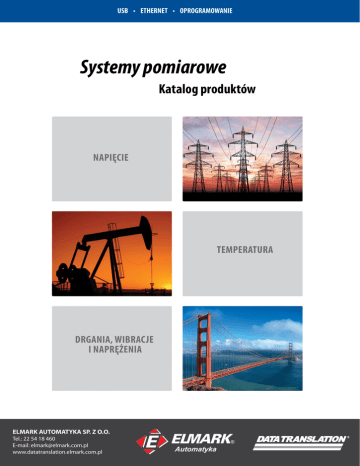 USB • ETHERNET • OPROGRAMOWANIE Systemy pomiarowe Katalog produktów Napięcie Temperatura Drgania, wibracje i naprężenia Konfiguracja protokołów redundancji w switchach MOXA strona 12 Autmatyka w kolejnictwie strona 18 ELMARK AUTOMATYKA SP. Z O.O. Tel.: 22 54 18 460 E-mail: [email protected] www.datatranslation.elmark.com.pl SYSTEMY POMIAROWE OPARTE O KOMPUTER PC Firma Data Translation Firma Data Translation została założona w 1973 r. w Marlboro w stanie Massachusetts w Stanach Zjednoczonych. Firma jest wiodącym producentem i dostawcą rozwiązań w zakresie systemów akwizycji danych. Dzięki 40-letniemu doświadczeniu oferowane urządzenia pomiarowe i oprogramowanie cechują się dużą dokładnością pomiaru oraz wysoką jakością. Data Translation oferuje zarówno gotowe moduły i systemy pomiarowe jak i szeroki wybór urządzeń w wersjach OEM przeznaczonych do zabudowy. Obecnie producent posiada biura w Stanach Zjednoczonych i Europie oraz sieć dystrybucyjną w ponad 40 krajach. Wszystkie urządzenia są produkowane w Stanach Zjednoczonych co zapewnia pełną kontrolę nad jakością i dostawami. W swojej ofercie firma Data Translation ma szeroki wybór urządzeń pomiarowych oraz oprogramowanie. Dostępne są następujące grupy produktów: • Systemy do pomiaru dźwięku i wibracji • Urządzenia do precyzyjnego pomiaru napięcia i temperatury (przetworniki Sigma-Delta 24-bit) • Moduły przeznaczone do pomiarów w układzie mostka • Uniwersalne moduły pomiarowe USB, od prostych modułów wyposażonych w 12-bit przetwornik do urządzeń o bardzo dużej dokładności pomiaru wyposażonych w 24-bit przetwornik • Oprogramowanie dedykowane do urządzeń pomiarowych Data Translation Rozwiązania OEM Firma Data Translation oferuje wysokiej jakości sprzęt OEM przeznaczony do zabudowy w aplikacji klienta. Wybierając między zaprojektowaniem własnego systemu pomiarowego a kupieniem gotowego rozwiązania należy wziąć pod uwagę następują czynniki: • Kupując gotowe rozwiązanie znacznie szybciej można przygotować produkt gotowy do sprzedaży • Na rzeczywisty koszt budowy własnego rozwiązania składają się koszt projektu, testów, zapewnienia odpowiedniej jakości i koszty produkcji Wsparcie techniczne Firma Elmark Automatyka Sp. z o.o. jest oficjalnym dystrybutorem produktów firmy Data Translation w Polsce. W przypadku pytań technicznych lub handlowych prosimy o kontakt: Elmark Automatyka Sp. z o.o. Tel.: 22 54 18 460 E-mail: [email protected] www.datatranslation.elmark.com.pl www.datatranslation.elmark.com.pl 2 ROZWIĄZANIA EKONOMICZNE Ekonomiczne systemy pomiarowe zasilane z portu USB Model Wejścia analogowe Rozdzielczość Częstotliwość próbkowania Wejścia/wyjścia cyfrowe Liczniki/timery Wyjścia analogowe Seria DT9800 16/8 12 lub 16-bit Do 100 kHz 16 2 0 lub 2 DT9810 8 10-bit 25 kHz 20 1 — Seria DT9812 8 12-bit Do 100 kHz 16 1 2 Seria DT9813 16 12-bit Do 100 kHz 8 1 2 Seria DT9814 24 12-bit Do 100 kHz — 1 2 Seria DT9816 6 16-bit Do 750 kHz/ch 16 1 — Seria DT9817 — — — Do 28 1 — DT9828 8 24-bit 600 Hz 8 — — DT9853* — — — 16 1 4 DT9854* — — — 16 1 8 *wyjście prądowe 0-20mA dla wersji M Moduły wielofunkcyjne Pomiar temperatury i napięcia • izolacja ±500V • 16 wejść ze wspólną masą / 8 wejść różnicowych • rozdzielczość 12- lub 16-bitów • próbkowanie do 100 kS/s • 16 wejść/wyjść cyfrowych • 2 liczniki/timery • opcjonalnie dwa wyjścia analogowe 12- lub 16-bitowe • zasilanie z portu USB • oprogramowanie i sterowniki w komplecie Moduły wielofunkcyjne • izolacja ±500V • 16 wejść ze wspólną masą lub 8 wejść różnicowych • rozdzielczość 16-bit • próbkowanie do 50 kS/s • 16 wejść/wyjść cyfrowych • 2 liczniki/timery • opcjonalnie wyjścia analogowe • zasilanie z USB • oprogramowanie i sterowniki w komplecie • rozdzielczość 10-, 12- lub 16-bit • do 24 wejść ze wspólną masą • próbkowanie do 750 kS/s • cyfrowe wejścia/wyjścia • dostępne modele z wyjściami analogowymi • zasilanie z USB • oprogramowanie i sterowniki w komplecie • 28 cyfrowych wejść/wyjść • DT9817-R – pełna izolacja • DT9817-H i –R – idealne do przełączania przekaźników • licznik/timer • zasilanie z USB • oprogramowanie i sterowniki w komplecie Seria DT9800 DT9810-DT9816 DT9805, DT9806 Wejścia/wyjścia cyfrowe DT9817 Pomiar temperatury Wyjścia analogowe • izolacja ±500V • 8 różnicowych wejść analogowych • rozdzielczość 24-bit • próbkowanie do 600 S/s • 8 cyfrowych wejść/wyjść • zasilanie z USB • oprogramowanie i sterowniki w komplecie • izolacja ±300V • rozdzielczość 16-bit • do 8 wyjść analogowych • zakresy wyjściowe: ±10V, 0-10V, 0-20mA • 16 wejść/wyjść cyfrowych • licznik/timer • zasilanie z USB • oprogramowanie i sterowniki w komplecie DT9828 DT9853, DT9854 3 www.datatranslation.elmark.com.pl Wysoka wydajność Moduły USB o wysokiej wydajności Model Wejścia analogowe Rozdzielczość Częstotliwość próbkowania Wejścia/wyjścia cyfrowe Liczniki/timery Enkodery kwadraturowe Wyjścia analogowe Zasilanie DT9818 Do 32 16-bit 150 kHz 16 2 — 2 USB DT9824 4 24-bit 4800 Hz/ch 16 — — — USB DT9826 16 24-bit 41.6 kHz/ch 16 2 — — USB Seria DT9832 2 lub 4 16-bit Do 2 MHz/ch 32 2 3 0 lub 2 +5V Seria DT9834 Do 32 16-bit 500 kHz 32 5 — 0 lub 4 +5V Seria DT9836 6 lub 12 16-bit Do 800 kHz/ch 32 2 3 0, 2, lub 4 +5V DT9862 2 16-bit 10 MHz 32 2 3 0 or 2 +5V Moduły wielofunkcyjne Moduł ISO-ChannelTM • izolacja ±500V • do 32 wejść ze wspólną masą/16 wejść różnicowych • rozdzielczość 16-bit • próbkowanie 150 kS/s • 16 cyfrowych wejść/wyjść • 2 liczniki/timery • dostępna wersja OEM • zasilanie z USB • oprogramowanie i sterowniki w komplecie • izolacja ±500V między kanałami oraz do masy • przetwornik A/C 24-bit dla każdego kanału •