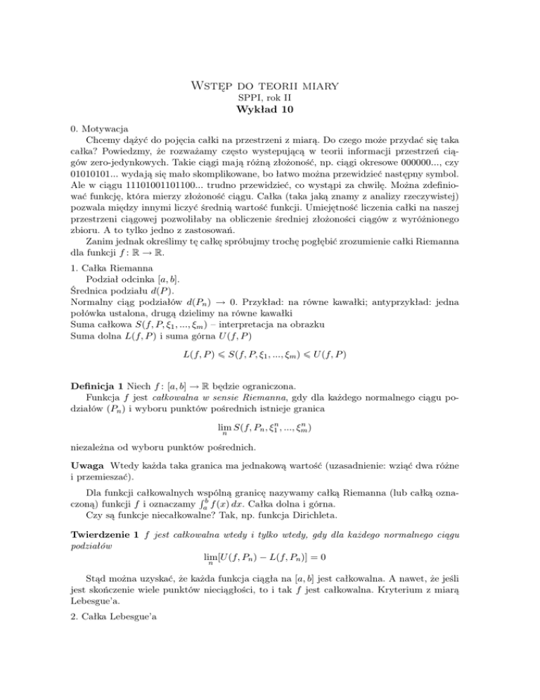 Twierdzenie 1 f jest całkowalna wtedy i tylko wtedy, gdy dla każdego normalnego ciągu