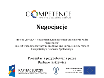 Negocjacje Projekt: „NAUKA – Nowoczesna Administracja Uczelni oraz Kadra Akademicka” Projekt współfinansowany ze środków Unii Europejskiej w ramach Europejskiego Funduszu Społecznego Prezentacja przygotowana przez Barbarę Jaśkiewicz Informacja o obowiązku poddania się kontroli Uczestnicy są zobowiązani do poddania się ewentualnym czynnościom kontrolnym przez Instytucję Pośredniczącą w związku z realizacją projektu. Motto szkolenia „Za każdym razem, gdy spotykają się dwie osoby lub więcej, to chcąc osiągnąć jakieś porozumienie, muszą negocjować.” Jim Thomas – „Negocjuj aby zwyciężać.” WPROWADZENIE W NEGOCJACJE Negocjacje – czym są a czym nie są? Negocjacje – dwustronny proces komunikowania się, którego celem jest osiągnięcie porozumienia z innymi, gdy niektóre z naszym interesów są wspólne, a inne sprzeczne. I obie strony chcą uzyskać porozumienie. Kiedy negocjować? • Wtedy, kiedy zawiodły perswazje. • Wtedy, gdy mamy obszar wspólnych interesów i kupujący chce osiągnąć porozumienie. • Wtedy, gdy oczekiwany wynik negocjacji uzasadnia czas i wysiłek, który jest niezbędny do ich przeprowadzenia • Kiedy osoby, które mają przystąpić do negocjacji mają upoważnienia do podjęcia ostatecznej decyzji Kiedy nie negocjować? • Szanse na powodzenie są znikome • Gdy nie możesz nic zyskać, a druga strona może zyskać wiele twoim kosztem • Negocjatorów opanowało nadmierne pobudzenie emocjonalne • Istnieją inne, lepsze możliwości • Przedmiot negocjacji jest zbyt drobny w stosunku do szacowanego kosztu negocjacji Podstawowe zasady negocjacji • Zasada Priorytetu (na pierwszym miejscu stoi dobro partnera negocjacji, a nie własne) • Zasada Consensusu (szukanie tzw. trzeciego rozwiązania) Inne ważne zasady • Oddziel ludzi od problemu • Koncentruj się na zadaniach, a nie na poglądach • Opracuj różne możliwości korzystne dla obu stron, nim przystąpisz do rozmów • Skoncentruj się na interesach, a nie na stanowiskach • Bądź przygotowany na modyfikację rozwiązania przed podjęciem decyzji • Domagaj się by wynik negocjacji oparty został o sprawdzalne i wymierne kryteria. Postawy w negocjacjach • Postawa dominująca • Postawa polegająca na dopasowaniu się • Postawa polegająca na unikaniu • Postawa kompromisowa • Postawa win-win Wysokie Rywalizacja Współpraca Pragnienie zaspokoje nia własnego interesu Średnie Kompromis Niskie Unikanie Niskie Dostosowywanie się Średnie Pragnienie zaspokojenia interesu drugiego uczestnika konfliktu Wysokie Modele negocjacji Modele negocjacji Model twardy (negocjacje pozycyjne) Model miękki Model rzeczowy (negocjacje problemowe) Istota negocjacji pozycyjnych a problemowych Negocjacje pozycyjne Negocjacje problemowe/rzeczowe strategia podziału (zwane inaczej negocjacje oparte o interesy stron) - jedna za stron zyskuje tyle ile traci druga celem jest uzyskać jak najwięcej strategia wspólnego poszukiwania rozwiązań Zastosowanie różnych typów negocjacji Negocjacje pozycyjne Negocjacje problemowe • Interesy stron wykluczają się • Interesy stron są wzajemnie zależne • Chcemy zmaksymalizować swój zysk • Ustępstwo jest oznaką słabości • Obecne lub przyszłe relacje są mniej ważne, niż natychmiastowe osiągnięcie zysku • Dobro nie jest ograniczone • Ma znaczenie utrzymanie dobrych relacji na przyszłość Harwaldzki Model Negocjacji 1. LUDZIE: Oddzielaj ludzi od problemów (opanowanie emocji, ujawienie percepcji sytuacji, doskonalenie sposobu porozumiewania się) 2. INTERESY: Koncentruj się na interesach i potrzebach stron, a nie na stanowiskach, pozycjach wyjściowych (nie targuj się o stanowiska) 3. KRYTERIA: Stosuj obiektywne kryteria (ustalenie i 4. odwoływanie się do obiektywnych kryteriów, jakie powinno spełniać porozumienie i sam tryb negocjowania) ROZWIĄZANIA: Szukaj korzyści dla wszystkich (rozwiązań korzystnych dla obu stron) Etapy negocjacji Etapy negocjacji Etap przygotowawczy Negocjacje właściwe Zakończenie negocjacji Etap analizy Otwarcie spotkania Etap planowania Przedstawienie propozycji Kontrakt końcowy Etap organizacji przebiegu negocjacji Ustępstwa i oferty Praktyczna realizacja porozumienia Osiągnięcie porozumienia PRZYGOTOWANIE DO NEGOCJACJI Przygotowanie do negocjacji” „Początkujący negocjatorzy poświęcają 30% czasu na przygotowanie, a 70% na negocjacje. Doświadczeni czynią odwrotnie” (Sekrety skutecznych negocjacji) Przygotowanie do negocjacji obejmuje: • Zebranie informacji o partnerze (W jakiej jest sytuacji? Jaka jest jego oferta?) • Przygotowanie obszaru negocjacji • Wyznaczenie priorytetów (Jakie ustępstwa mogę poczynić?) • Ustalenie przedziałów negocjacyjnych (moje cele –maksimum i minumum) • Ustalenie kolejności negocjowania poszczególnych obszarów (strategia prowadzenia rozmowy) • Dobór osób do zespołu negocjacyjnego • Ustalenie lub przygotowanie miejsca rozmów BATNA Best Alternative To a Negotiated Agreement = nasz najlepszy plan B, co możemy zrobić gdy nie dojdzie do porozumienia Uwaga: Dobra BATNA daje siłę w negocjacjach! Słabą BATNE lepiej nie ujawniać! Aby opracować BATNA należy: • Wyliczyć wszystkie opcje stojące przed nami w przypadku, kiedy nie osiągniemy porozumienia • Opracować różne alternatywy na podstawie wcześniejszej analizy • Ocenić każdą z alternatyw – najlepsza alternatywa to będzie nasza BATNA Korzyści płynące z BATNA BATNA – to kryterium wyboru, chroniące Cię zarówno przed akceptacją porozumienia, które powinieneś odrzucić, jak i odrzuceniem porozumienia, które powinieneś zaakceptować. Cele które sobie stawiasz: • Co chcesz osiągnąć w negocjacjach? • Czy zależy ci na obustronnych korzyściach czy też jednostronnych? Obszary negocjacji • Cena • Czas realizacji • Ilość • Jakość • Koszty dodatkowe (transport) • Forma płatno