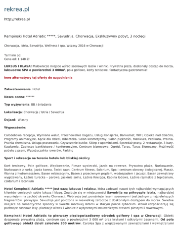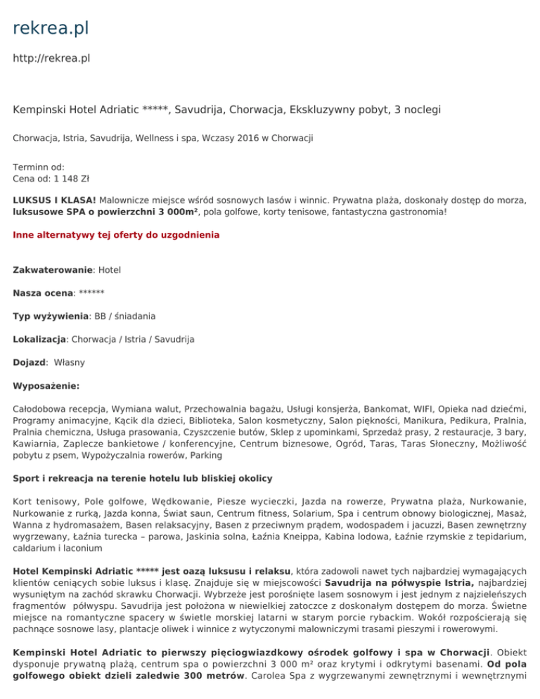 rekrea.pl http://rekrea.pl Kempinski Hotel Adriatic *****, Savudrija, Chorwacja, Ekskluzywny pobyt, 3 noclegi Chorwacja, Istria, Savudrija, Wellness i spa, Wczasy 2016 w Chorwacji Terminn od: Cena od: 1 148 Zł LUKSUS I KLASA! Malownicze miejsce wśród sosnowych lasów i winnic. Prywatna plaża, doskonały dostęp do morza, luksusowe SPA o powierzchni 3 000m², pola golfowe, korty tenisowe, fantastyczna gastronomia! Inne alternatywy tej oferty do uzgodnienia Zakwaterowanie: Hotel Nasza ocena: ****** Typ wyżywienia: BB / śniadania Lokalizacja: Chorwacja / Istria / Savudrija Dojazd: Własny Wyposażenie: Całodobowa recepcja, Wymiana walut, Przechowalnia bagażu, Usługi konsjerża, Bankomat, WIFI, Opieka nad dziećmi, Programy animacyjne, Kącik dla dzieci, Biblioteka, Salon kosmetyczny, Salon piękności, Manikura, Pedikura, Pralnia, Pralnia chemiczna, Usługa prasowania, Czyszczenie butów, Sklep z upominkami, Sprzedaż prasy, 2 restauracje, 3 bary, Kawiarnia, Zaplecze bankietowe / konferencyjne, Centrum biznesowe, Ogród, Taras, Taras Słoneczny, Możliwość pobytu z psem, Wypożyczalnia rowerów, Parking Sport i rekreacja na terenie hotelu lub bliskiej okolicy Kort tenisowy, Pole golfowe, Wędkowanie, Piesze wycieczki, Jazda na rowerze, Prywatna plaża, Nurkowanie, Nurkowanie z rurką, Jazda konna, Świat saun, Centrum fitness, Solarium, Spa i centrum obnowy biologicznej, Masaż, Wanna z hydromasażem, Basen relaksacyjny, Basen z przeciwnym prądem, wodospadem i jacuzzi, Basen zewnętrzny wygrzewany, Łaźnia turecka – parowa, Jaskinia solna, Łaźnia Kneippa, Kabina lodowa, Łaźnie rzymskie z tepidarium, caldarium i laconium Hotel Kempinski Adriatic ***** jest oazą luksusu i relaksu, która zadowoli nawet tych najbardziej wymagających klientów ceniących sobie luksus i klasę. Znajduje się w miejscowości Savudrija na półwyspie Istria, najbardziej wysuniętym na zachód skrawku Chorwacji. Wybrzeże jest porośnięte lasem sosnowym i jest jednym z najzieleńszych fragmentów półwyspu. Savudrija jest położona w niewielkiej zatoczce z doskonałym dostępem do morza. Świetne miejsce na romantyczne spacery w świetle morskiej latarni w starym porcie rybackim. Wokół rozpościerają się pachnące sosnowe lasy, plantacje oliwek i winnice z wytyczonymi malowniczymi trasami pieszymi i rowerowymi. Kempinski Hotel Adriatic to pierwszy pięciogwiazdkowy ośrodek golfowy i spa w Chorwacji. Obiekt dysponuje prywatną plażą, centrum spa o powierzchni 3 000 m² oraz krytymi i odkrytymi basenami. Od pola golfowego obiekt dzieli zaledwie 300 metrów. Carolea Spa z wygrzewanymi zewnętrznymi i wewnętrznymi basenami to unikatowe miejsce terapii wodnych doznań i ogród dobrego samopoczucia. Goście hotelu Kempiński Adriatic Croatia mogą korzystać z bezpłatnego WIFI. Przestronne, elegancko urządzone pokoje oferują widok na park lub morze. Wszystkie pokoje są wyposażone w klimatyzację, minibar, sejf na laptopa i sprzęt stereo. Na terenie hotelu Kempinski mieszczą się 3 bary i 2 restauracje. Restauracja Dijana serwuje dania kuchni śródziemnomorskiej. Usytuowana przy plaży restauracja Kanova zaprasza na tradycyjne specjały z Istrii. Hotel Kempinski dysponuje także 18-dołkowym polem golfowym klasy mistrzowskiej. Okoliczne plaże są typowe dla tego regionu – kamieniste z elementami skalnymi. Miłośnicy aktywnego wypoczynku na pewno nie będą zawiedzeni. Savudrija posiada doskonałą infrastrukturę sportową i turystyczną. Jest jednym z najlepszych miejsc na Adriatyku do uprawiania windsurfingu, nurkowania i jazdy na skuterach wodnych. Savudrija nie należy do typowych kurortów rozrywkowych, w których bez przerwy tętni życie nocne. Jednak fani zabawy w pubach i klubach nie powninni być zawiedzeni. W sezonie jest tu sporo możliwości na wieczorną zabawę i wyjście. Latem odbywają się tu różne festiwale i spotkania z muzyką i sztuką, które zapewniają wyjątkową atmosferę i fantastyczną zabawę. Parking prywatny jest dostępny na miejscu w cenie 19 EUR za dzień W ofercie mamy również inne propozycje pakietów pobytowych w tym hotelu. Uwaga Zalecamy zakup kompleksowego ubezpieczenia turystycznego, w tym ubezpieczenia rezygnacji z podróży za obniżoną cenę. Cena obejmuje 3x nocleg, 3x śniadania, czasowo nieograniczone korzystanie z oazy kąpielisk i wellness, nieograniczone korzystanie ze świata saun, ustawowe ubezpieczenie biur podróży Cena nie obejmuje podatku turystycznego, opłaty parkingowej w wysokości 19 € za samochód i dzień