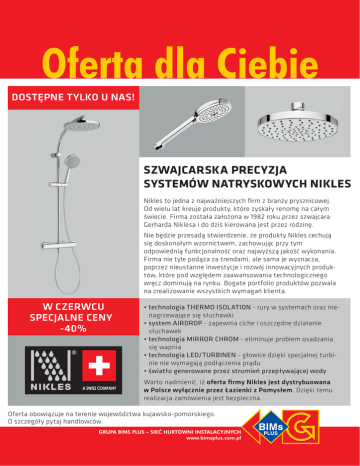 DOSTĘPNE TYLKO U NAS! SZWAJCARSKA PRECYZJA SYSTEMÓW NATRYSKOWYCH NIKLES Nikles to jedna z najważniejszych firm z branży prysznicowej. Od wielu lat kreuje produkty, które zyskały renomę na całym świecie. Firma została założona w 1982 roku przez szwajcara Gerharda Niklesa i do dziś kierowana jest przez rodzinę. Nie będzie przesadą stwierdzenie, że produkty Nikles cechują się doskonałym wzornictwem, zachowując przy tym odpowiednią funkcjonalność oraz najwyższą jakość wykonania. Firma nie tyle podąża za trendami, ale sama je wyznacza, poprzez nieustanne inwestycje i rozwój innowacyjnych produktów, które pod względem zaawansowania technologicznego wręcz dominują na rynku. Bogate portfolio produktów pozwala na zrealizowanie wszystkich wymagań klienta. W CZERWCU SPECJALNE CENY -40% A SWISS COMPANY • technologia THERMO ISOLATION - rury w systemach oraz nienagrzewające się słuchawki • system AIRDROP - zapewnia ciche i oszczędne działanie słuchawek • technologia MIRROR CHROM - eliminuje problem osadzania się wapnia • technologia LED/TURBINEN - głowice dzięki specjalnej turbinie nie wymagają podłączenia prądu • światło generowane przez strumień przepływającej wody Warto nadmienić, iż oferta firmy Nikles jest dystrybuowana w Polsce wyłącznie przez Łazienki z Pomysłem. Dzięki temu realizacja zamówienia jest bezpieczna. Oferta obowiązuje na terenie województwa kujawsko-pomorskiego. O szczegóły pytaj handlowców.